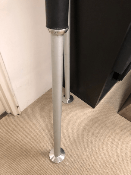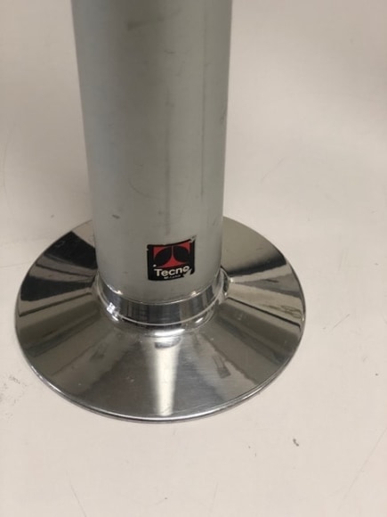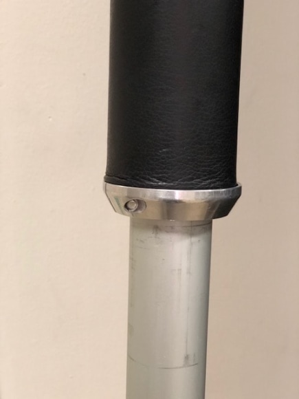 The central structure is a leather wrapped aluminum tube and two sliding concentric tubes in brushed aluminum. Polished aluminum rings act as a locking mechanism for the tubes and can be loosened to adjust the height. The rack is installed by two floor and ceiling mounted discs in polished aluminum.