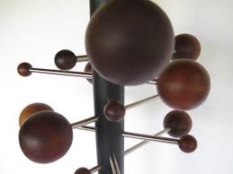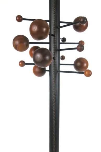 Rotating floor to ceiling mounted coat hanger with beech wood spheres and leather wrapped aluminum pole by Osvaldo Borsani for Tecno, Italy c. 1961