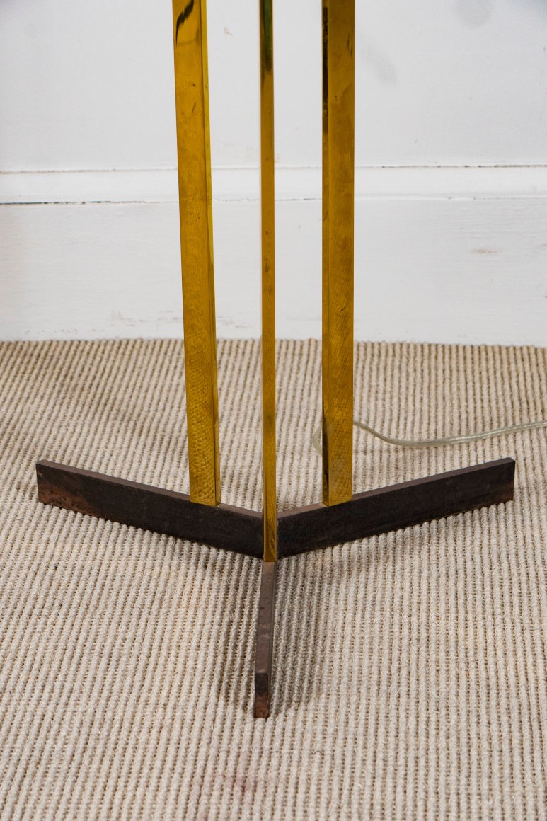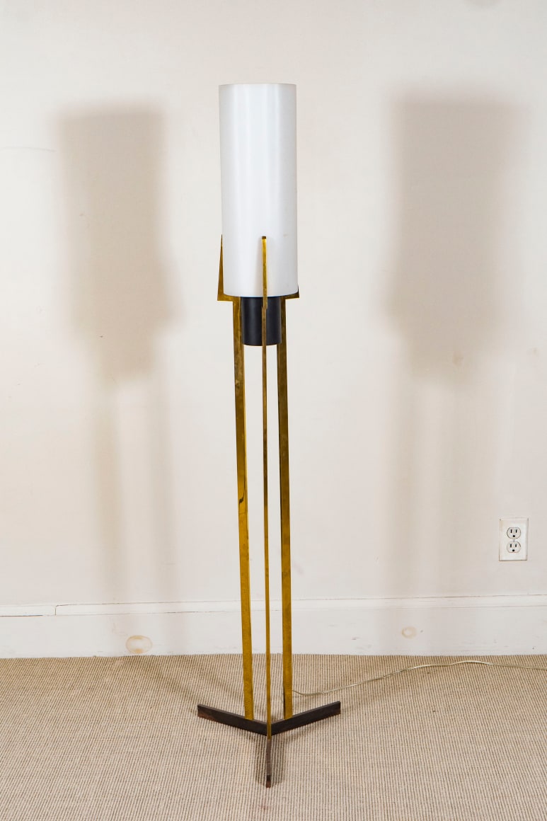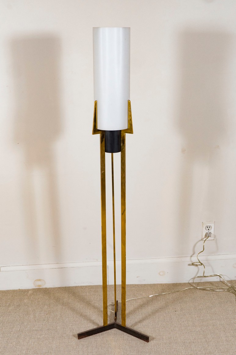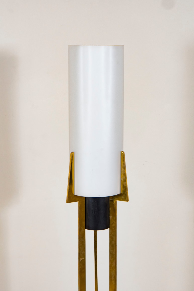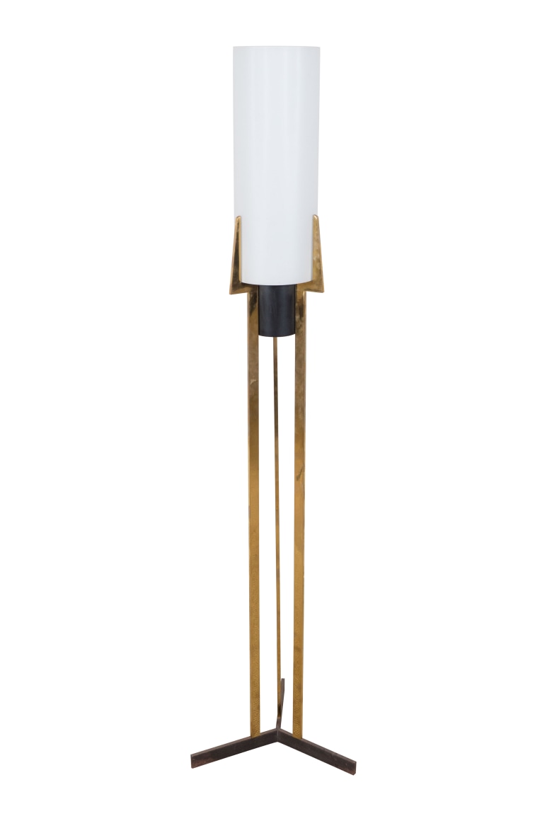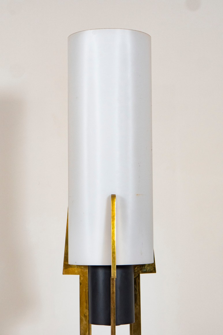 The black and brass tripod open stand supporting a tall cylindrical frosted glass shade.