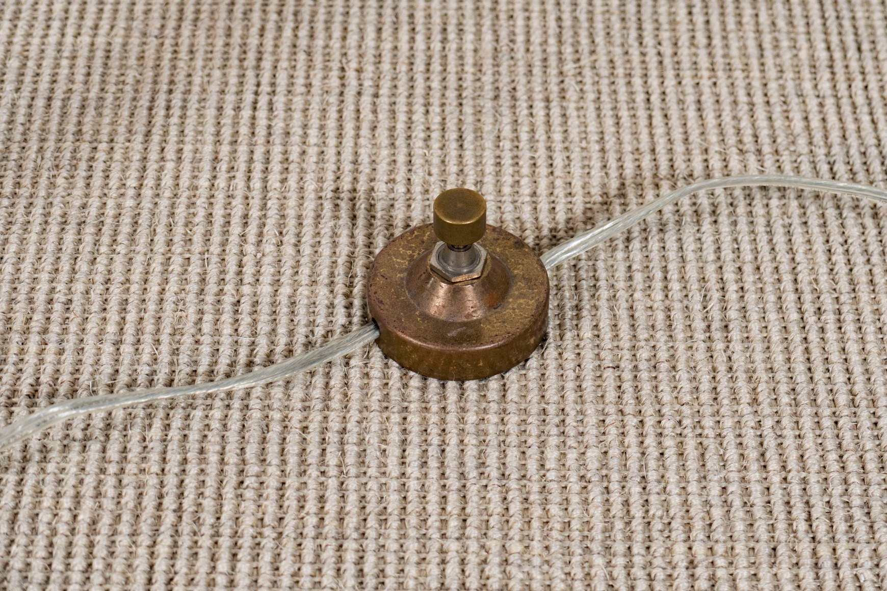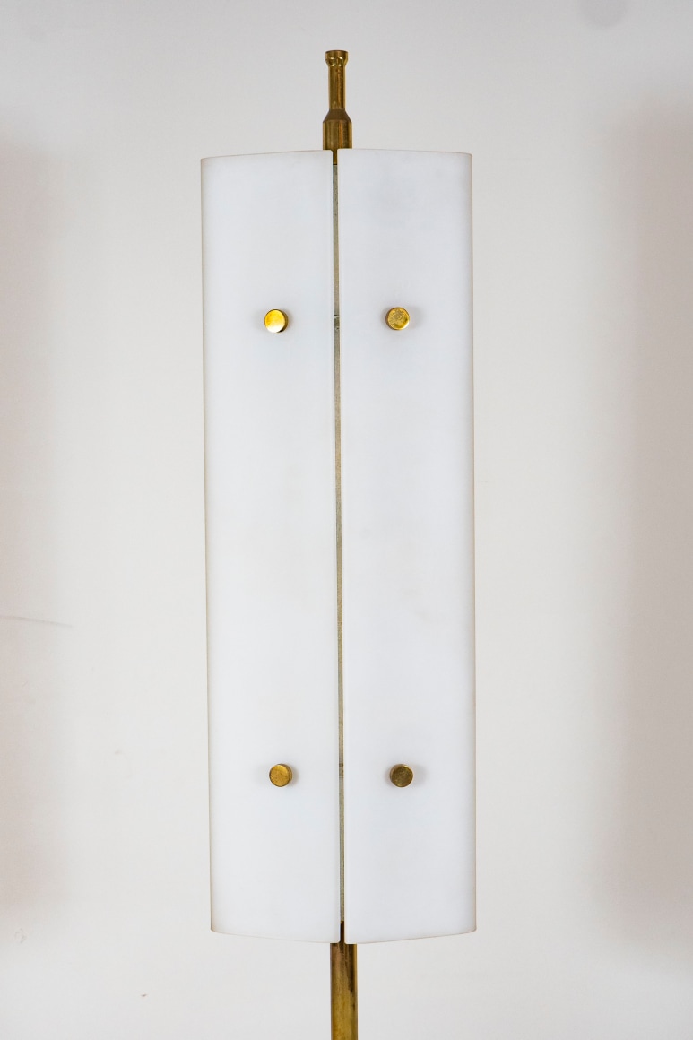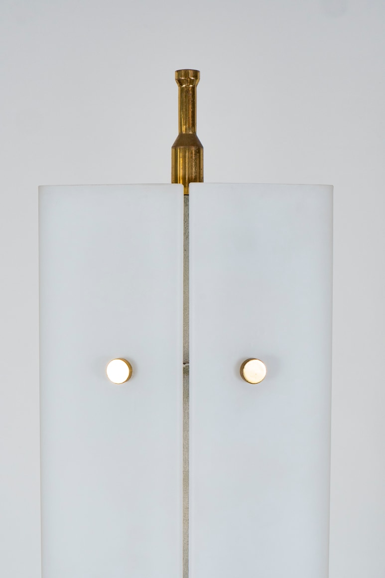 A sturdy bronze column supported by a curved H shaped base, with two long frosted triangular glass shades hanging from the top of the column.