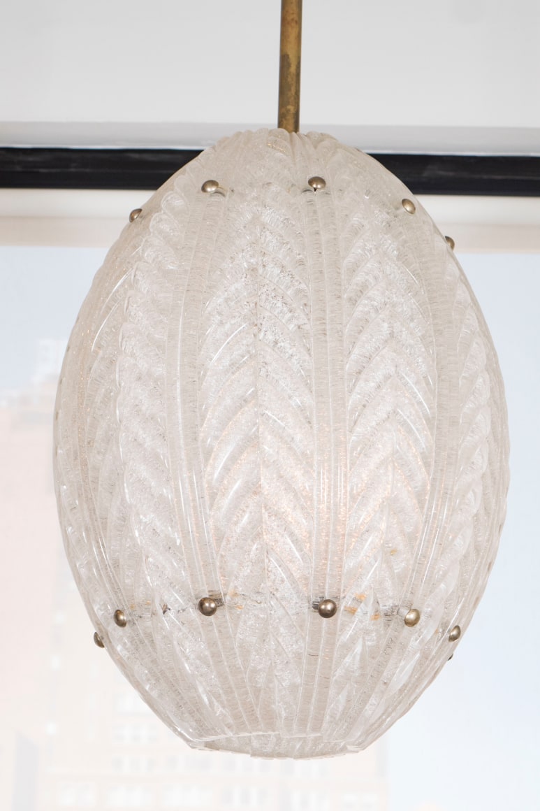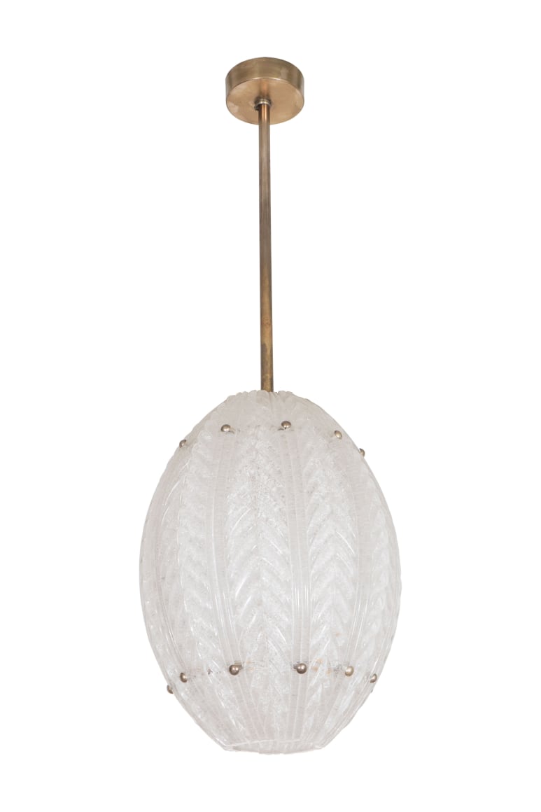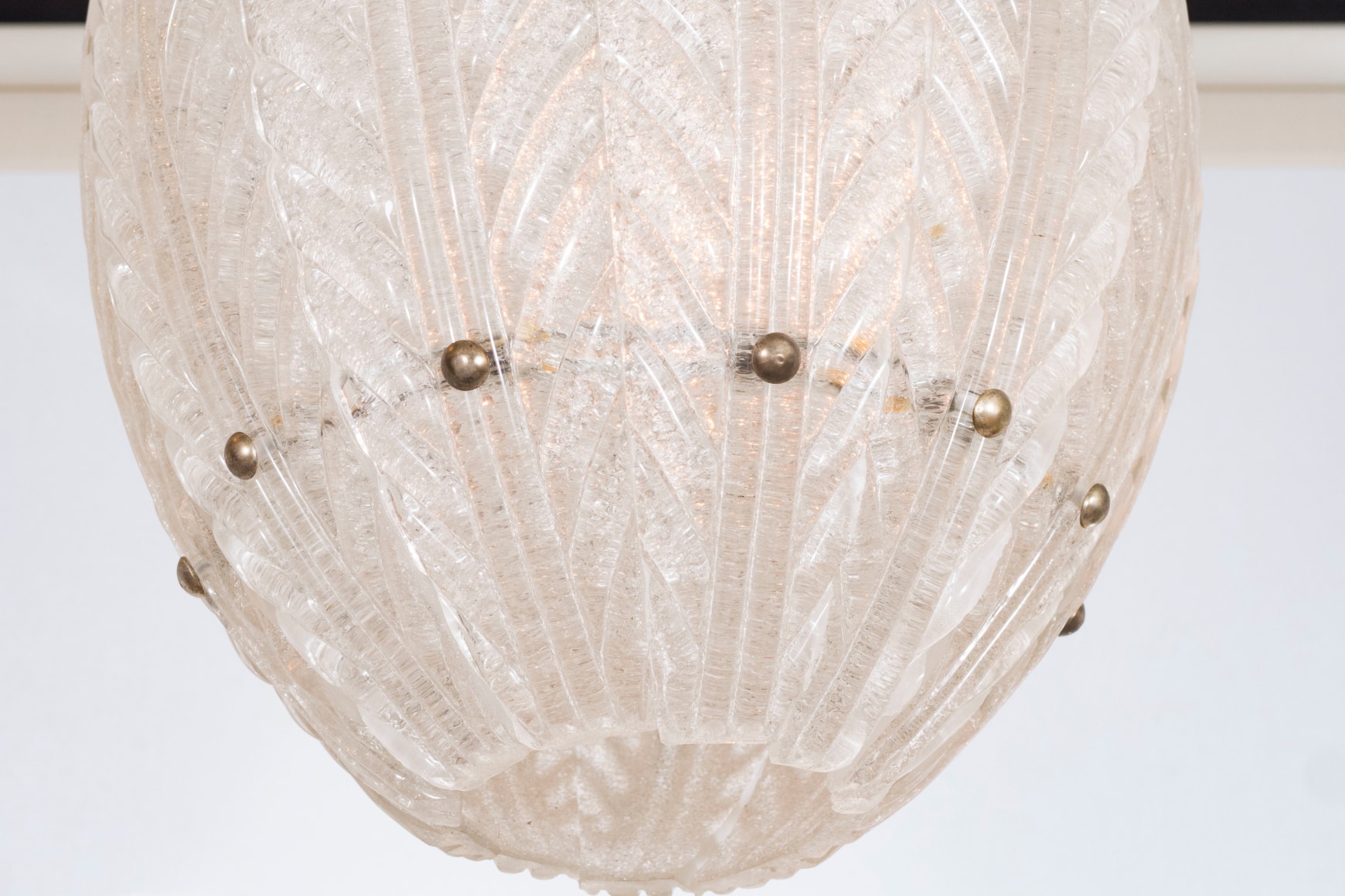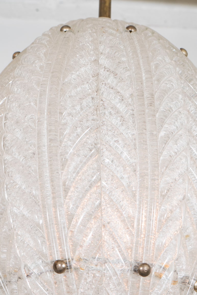 Elliptical molded glass and brass chandelier formed of vertical shaped molded glass panels fixed to a brass fram
