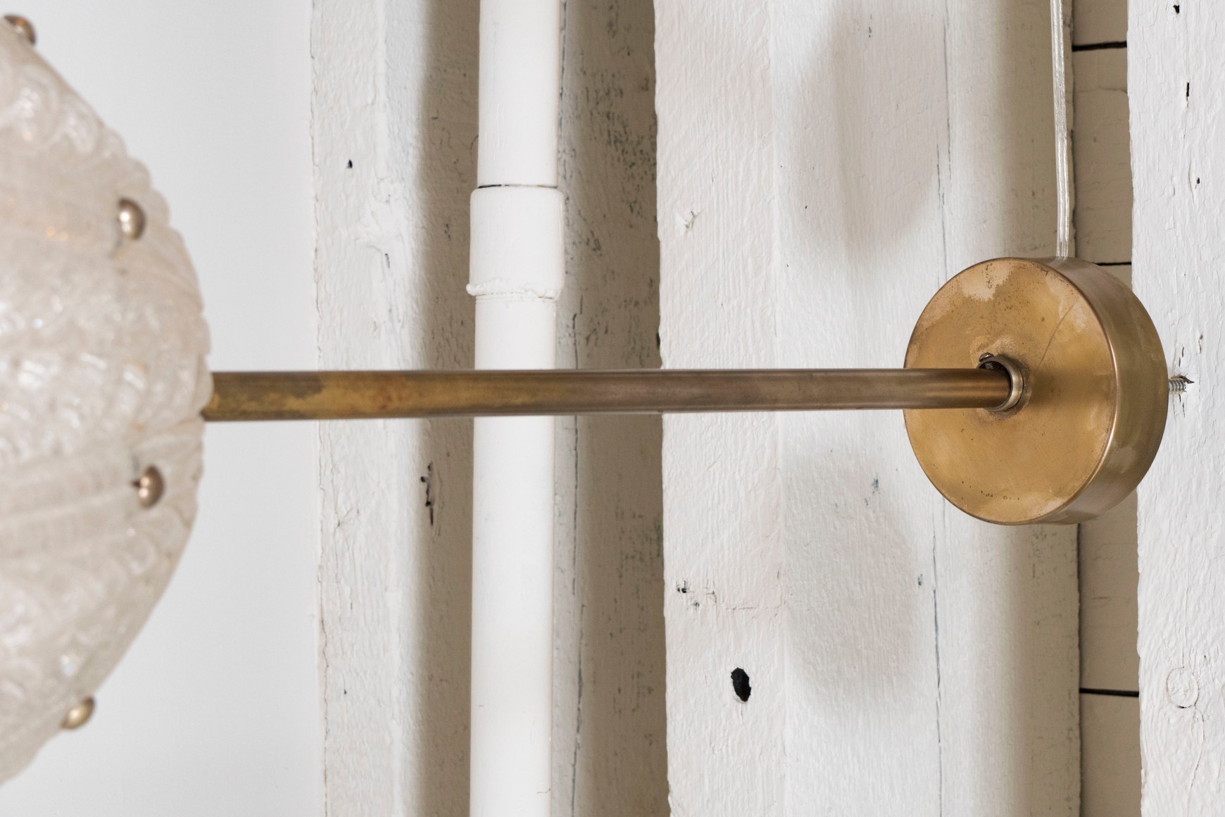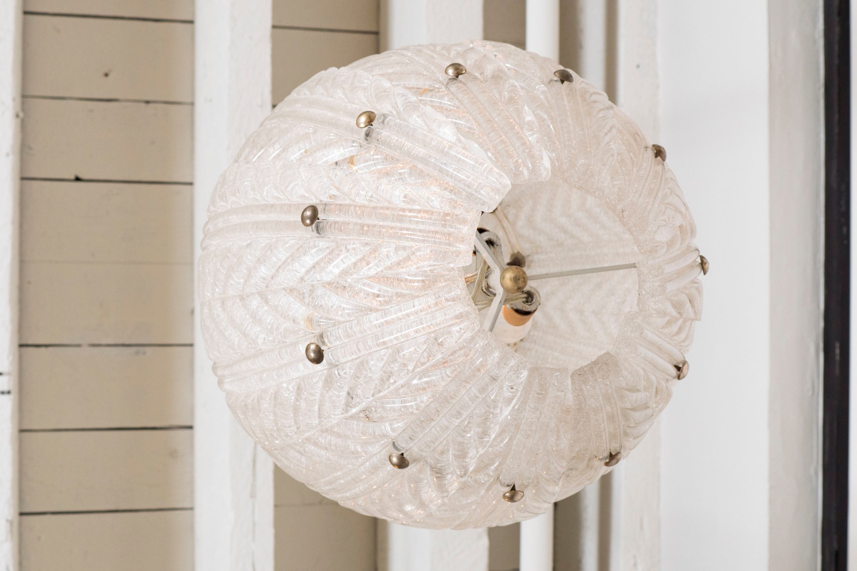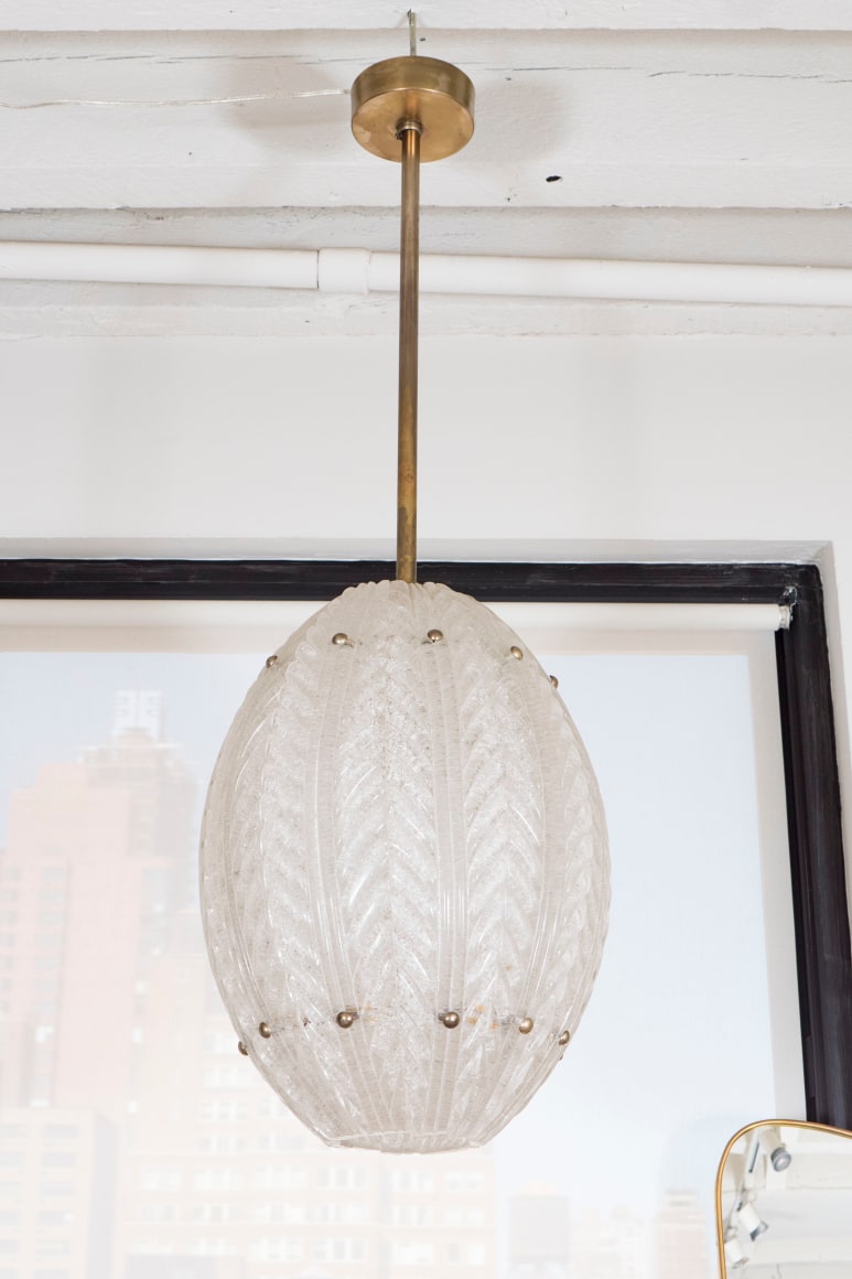 Elliptical molded glass and brass chandelier formed of vertical shaped molded glass panels fixed to a brass fram