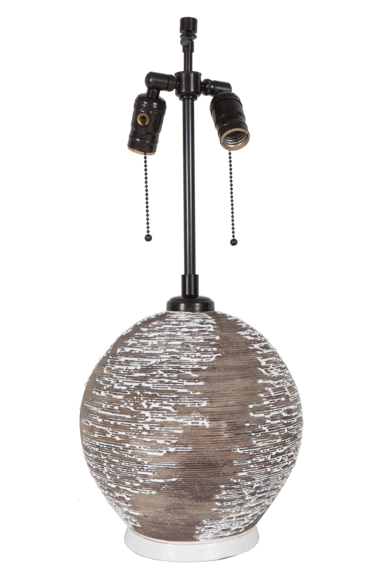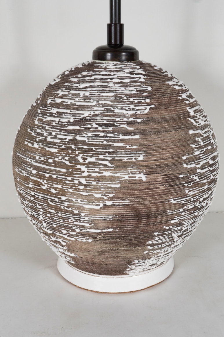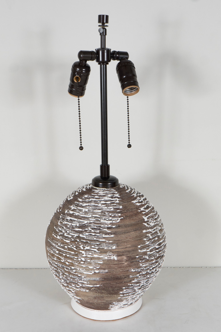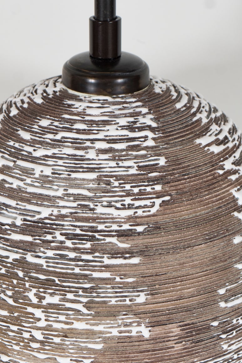 French 40's Ceramic Lamp with Textured Brown Circular Pattern and White Diagonal Low Relief Modeling.