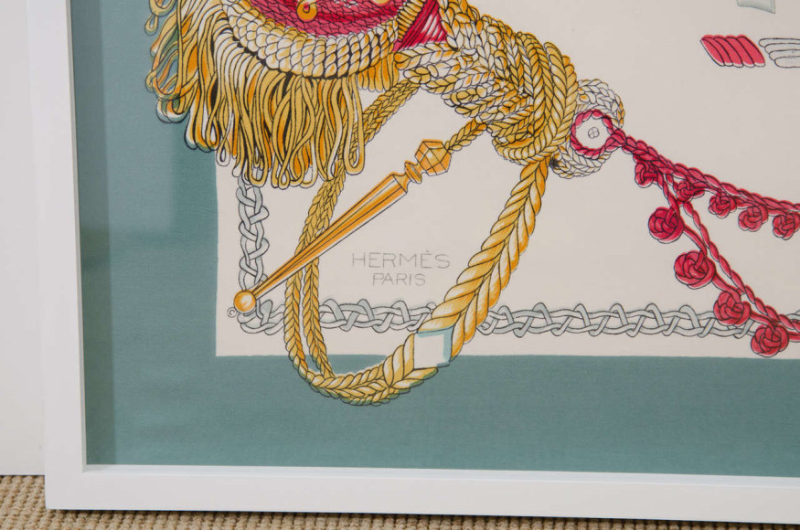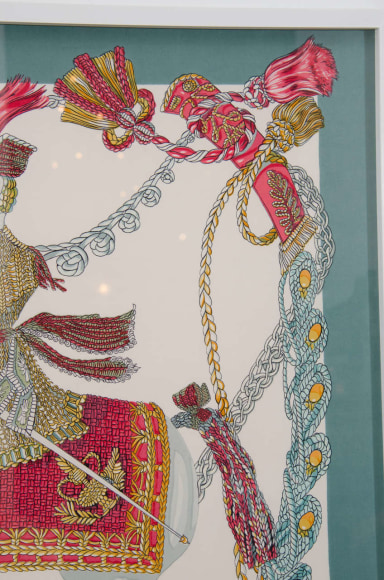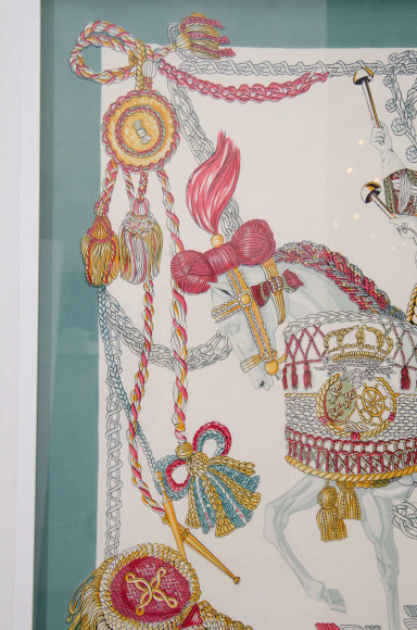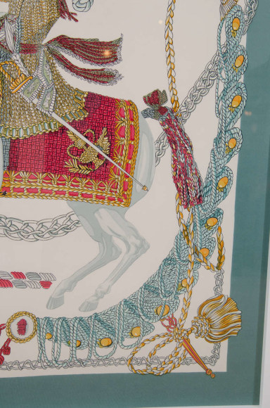 Framed Hermès Silk Scarf, Festooned Horse and Rider, France, c. 1950