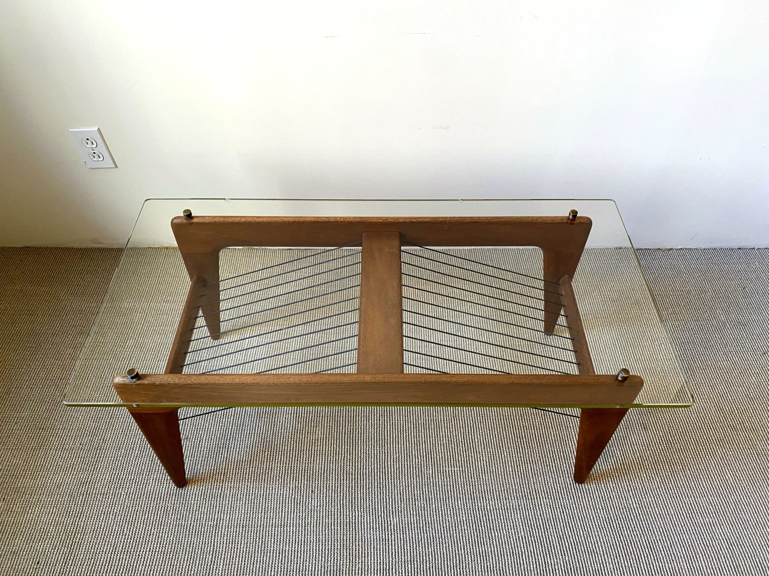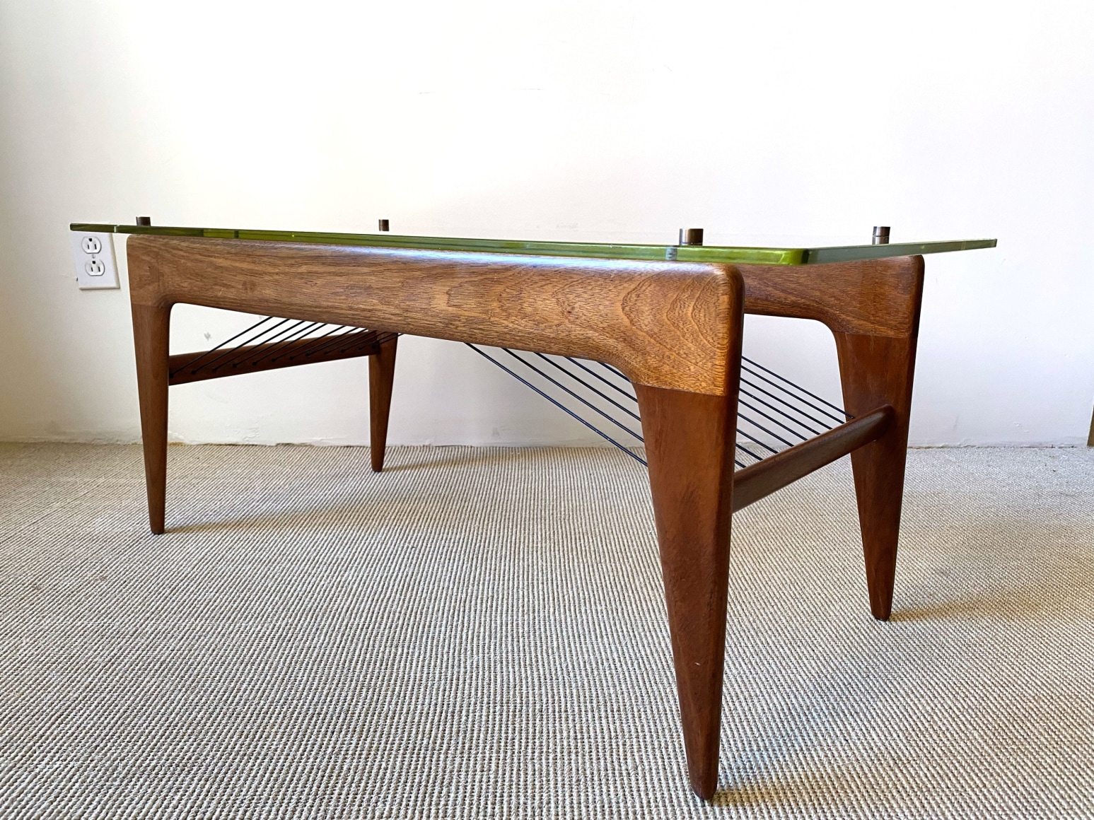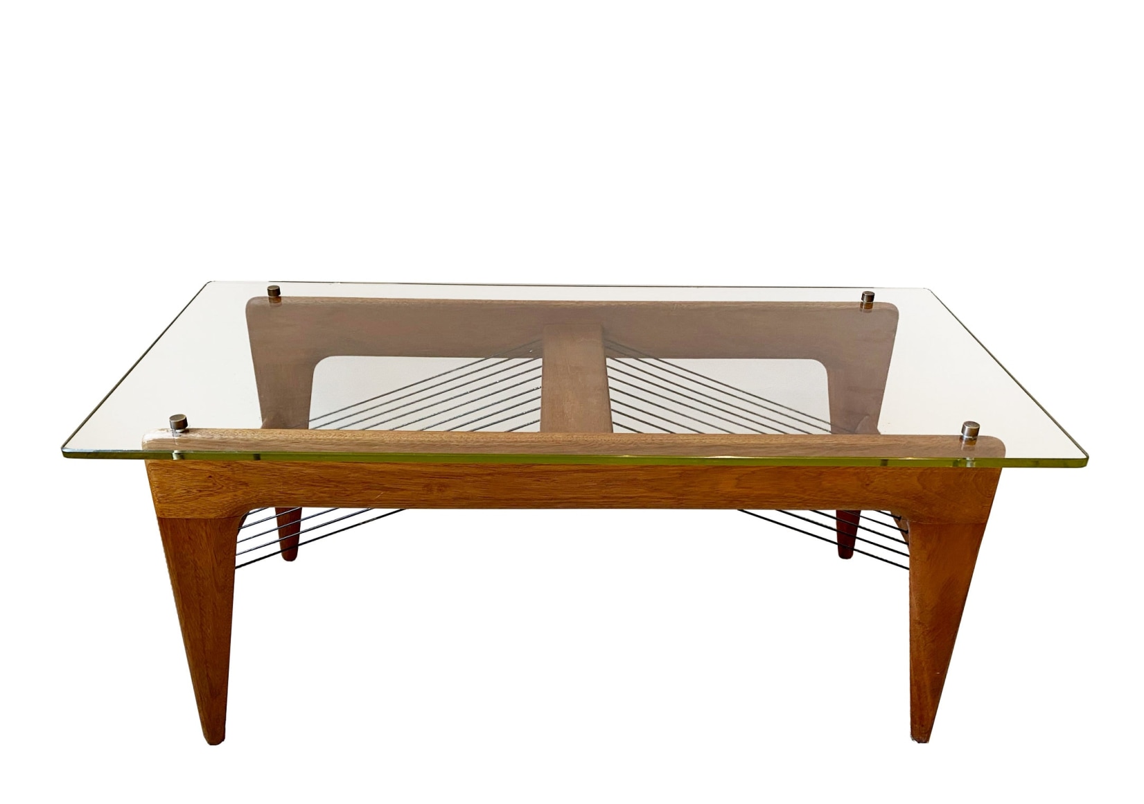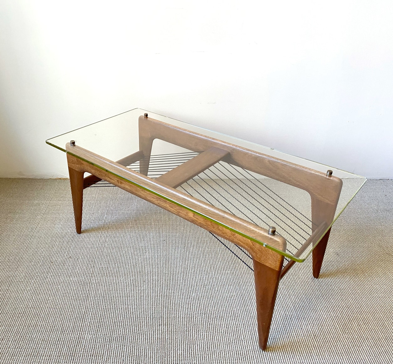 walnut (refinished), glass has slight wear and two 'oysters' along one side