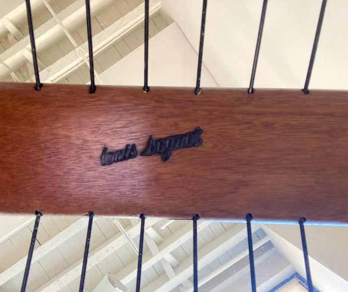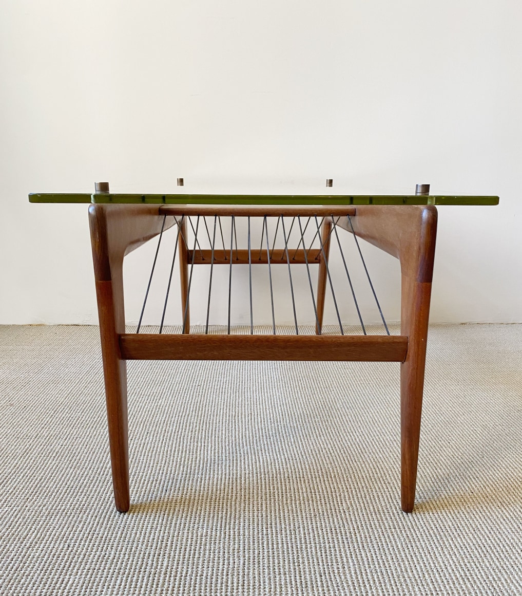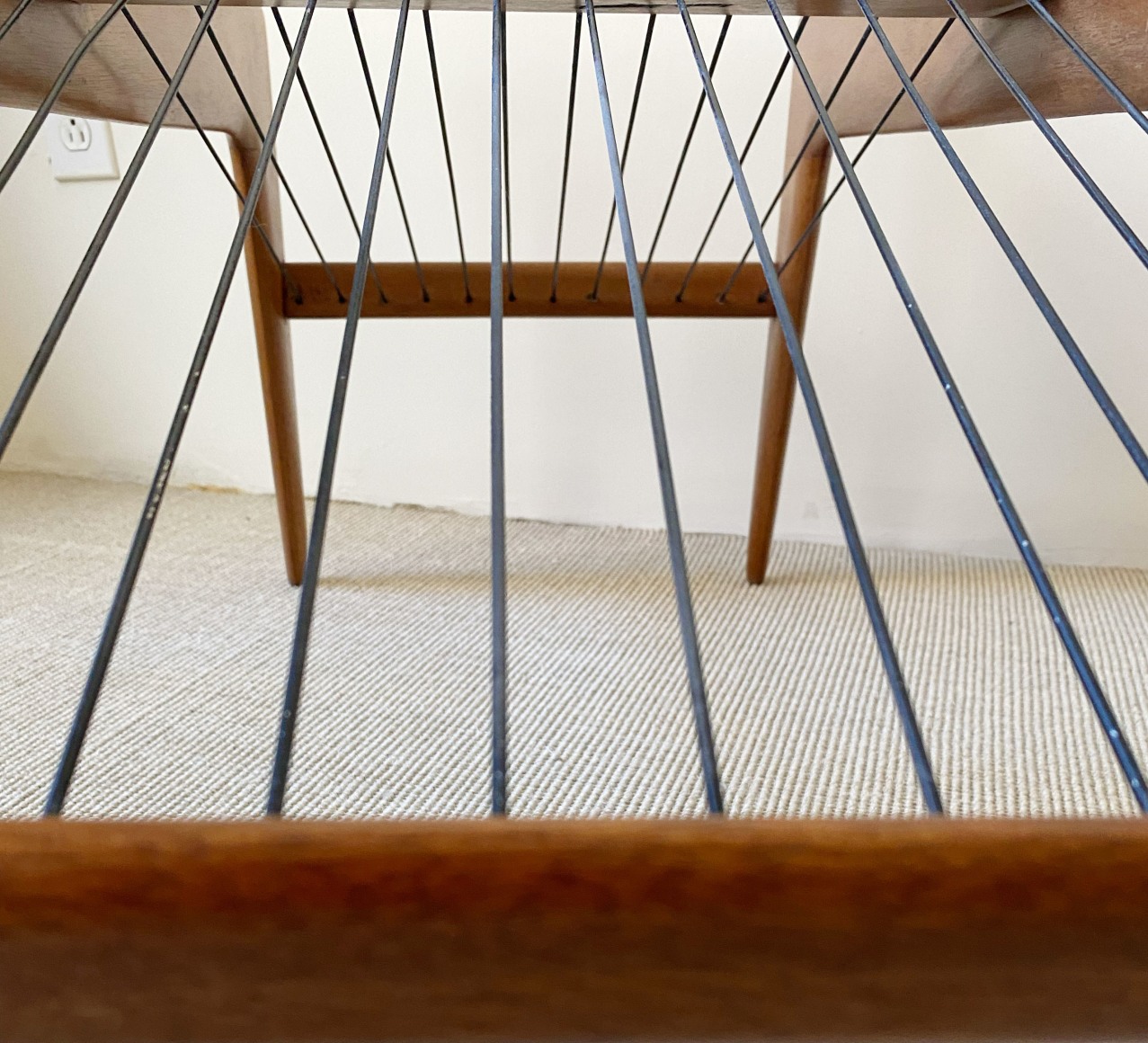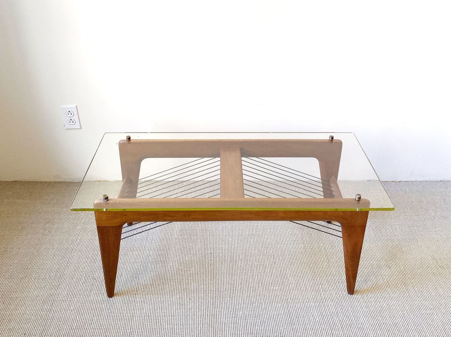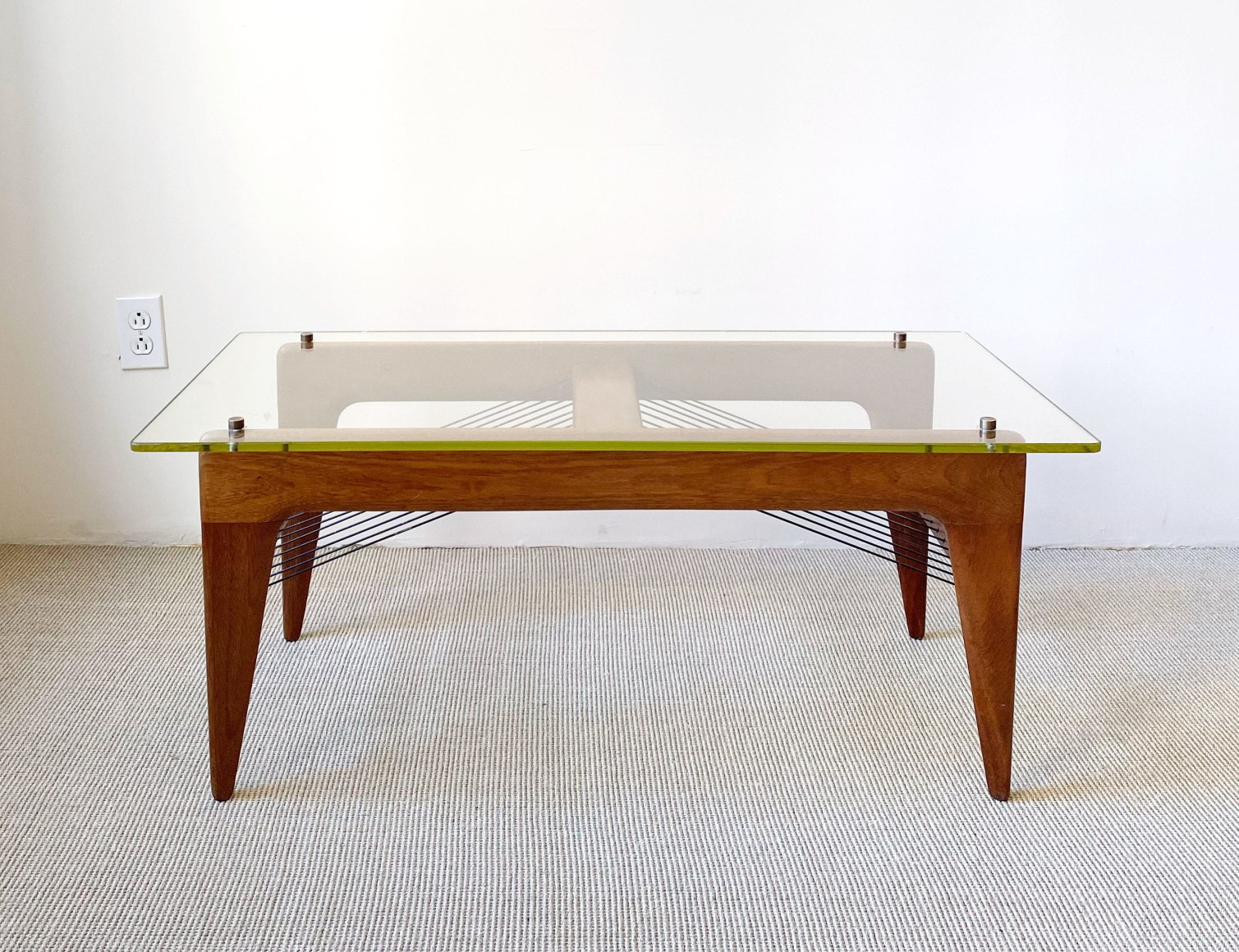 walnut (refinished), glass has slight wear and two 'oysters' along one side