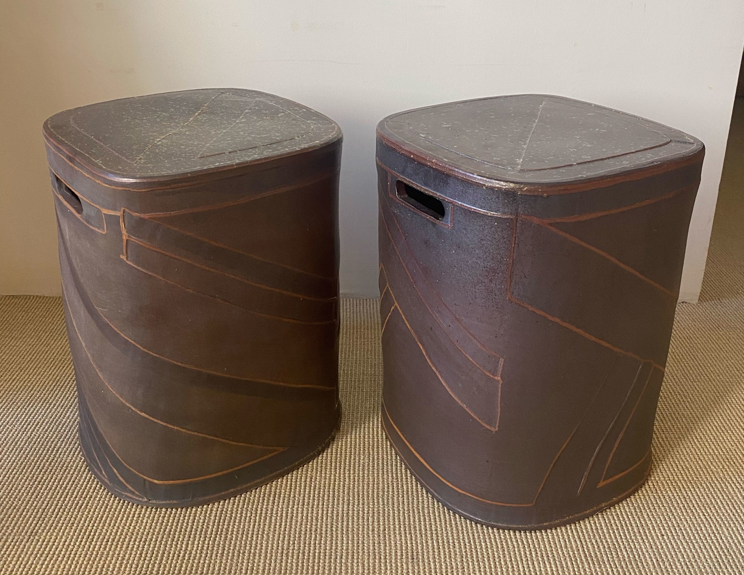 PAIR OF SIGNED ROZ HERRIN CERAMIC STOOLS