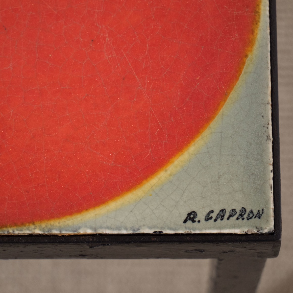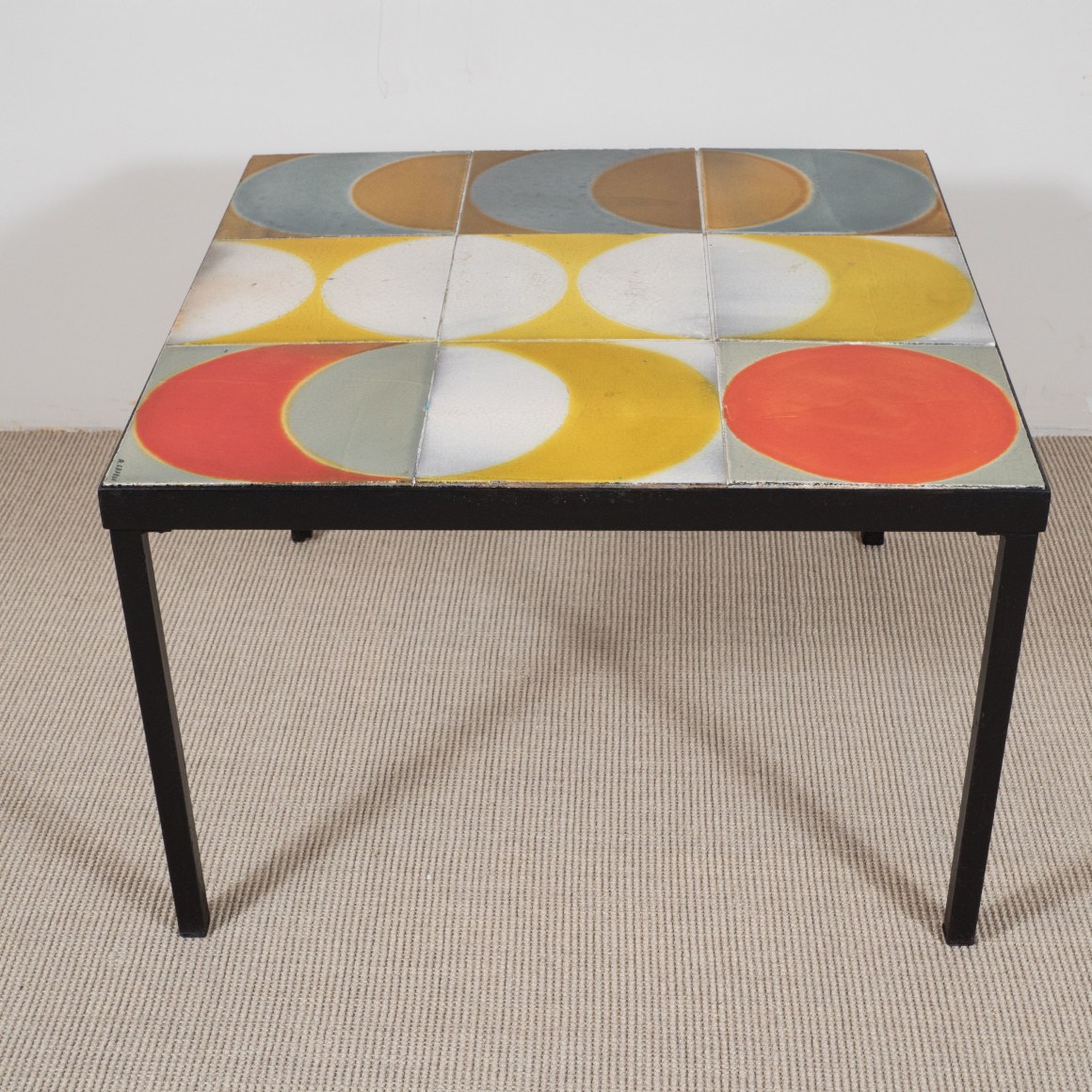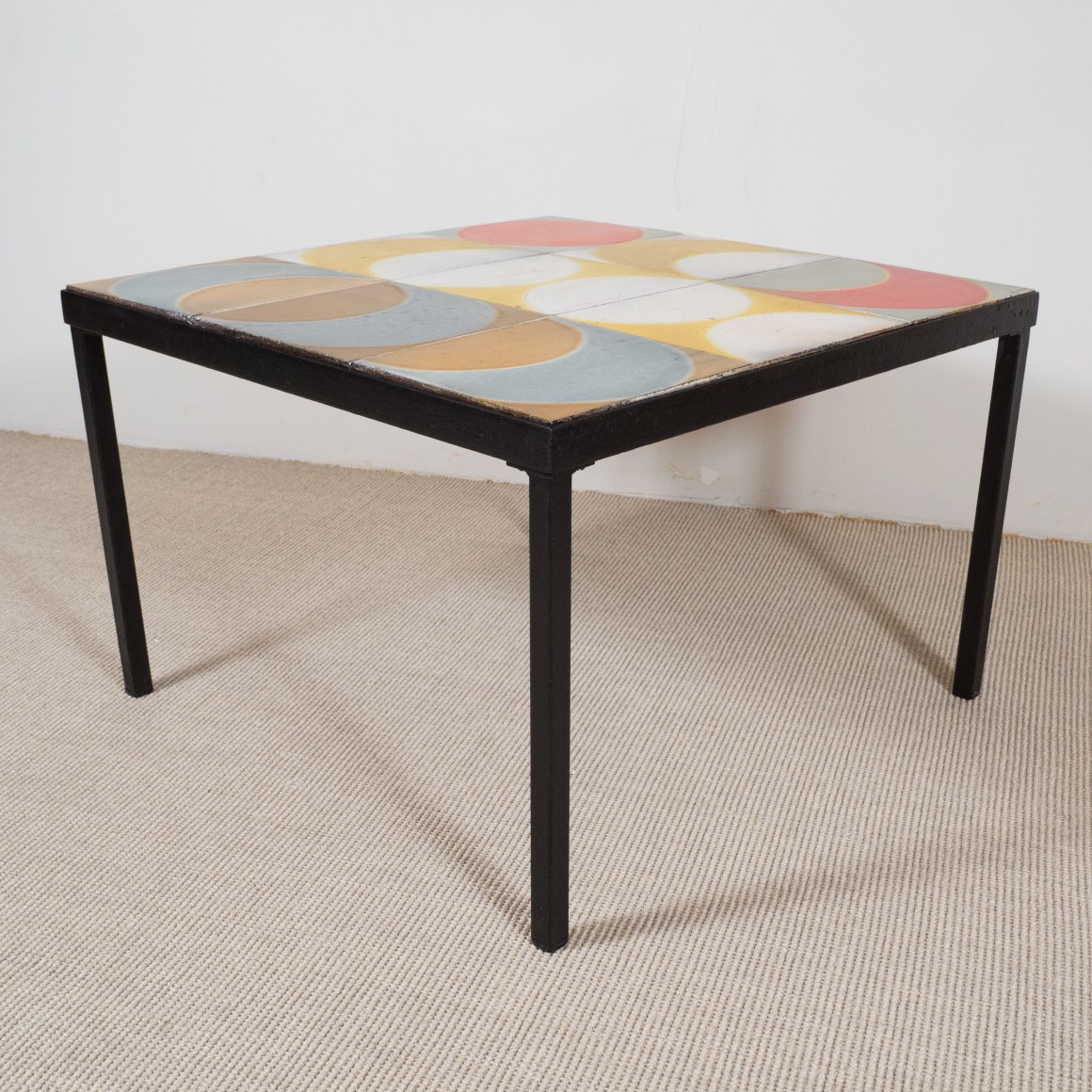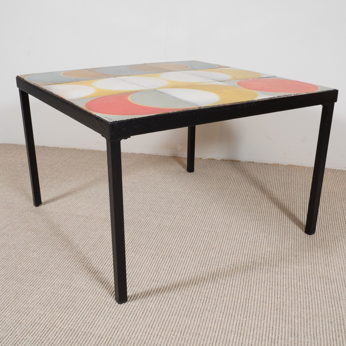 Colorful painted tile top table with iron base by Roger Capron, France c. 1950