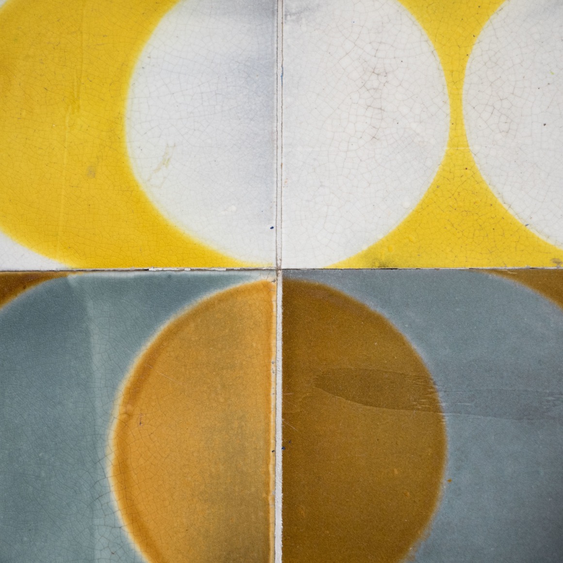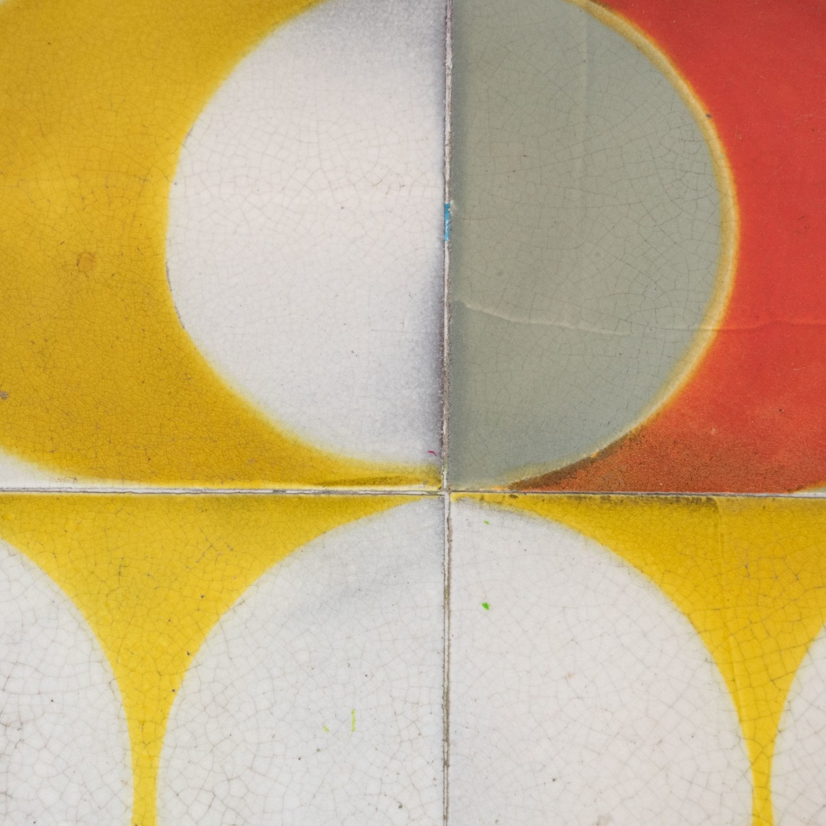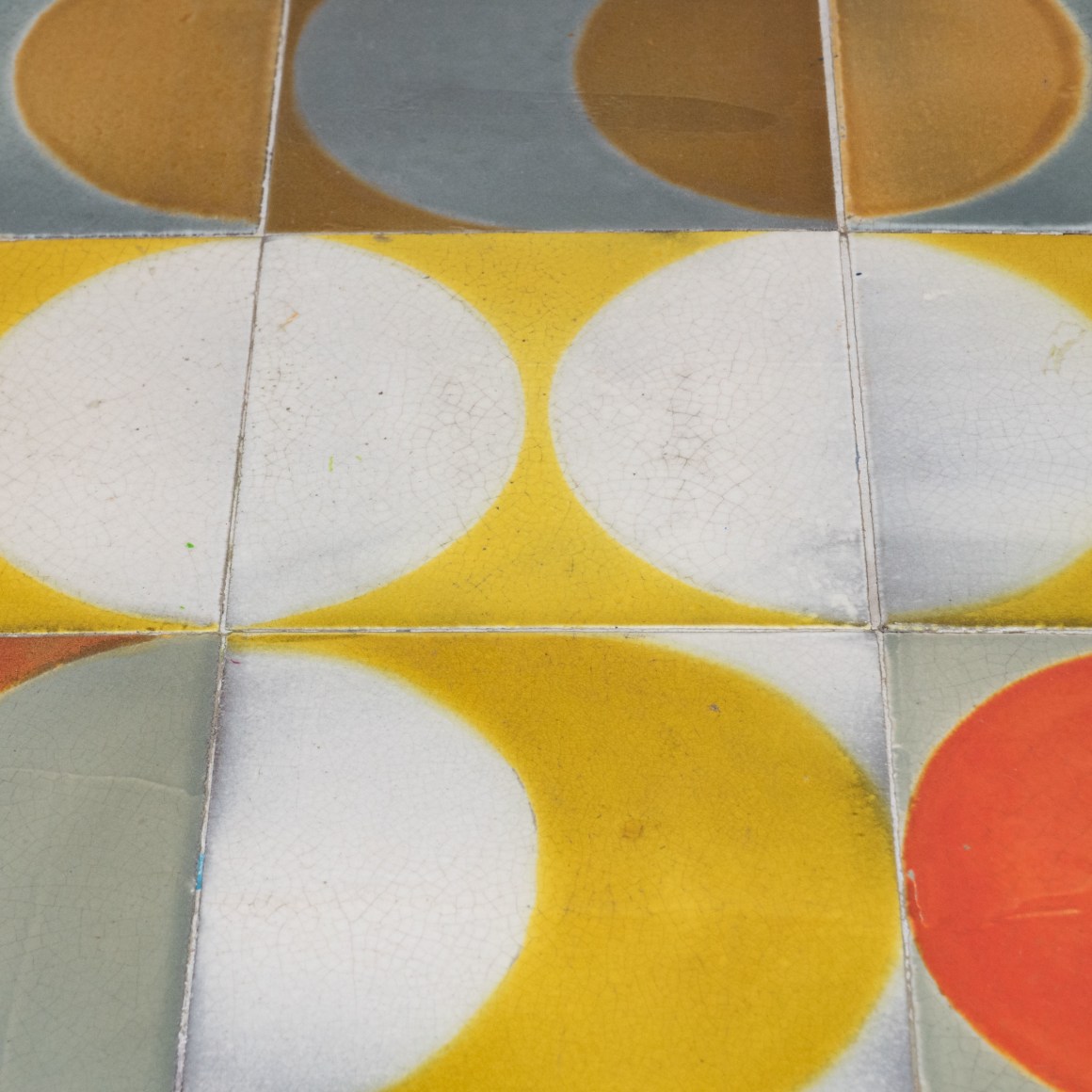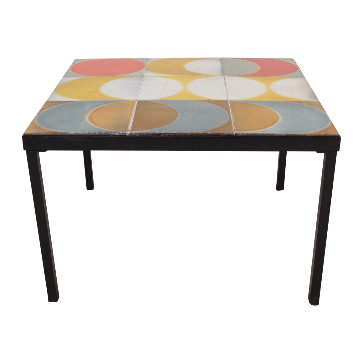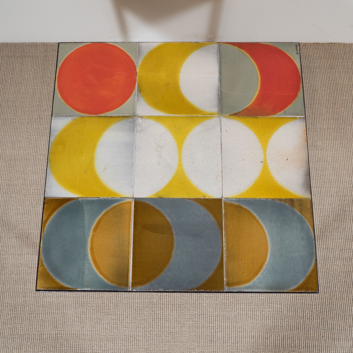 Colorful painted tile top table with iron base by Roger Capron, France c. 1950
