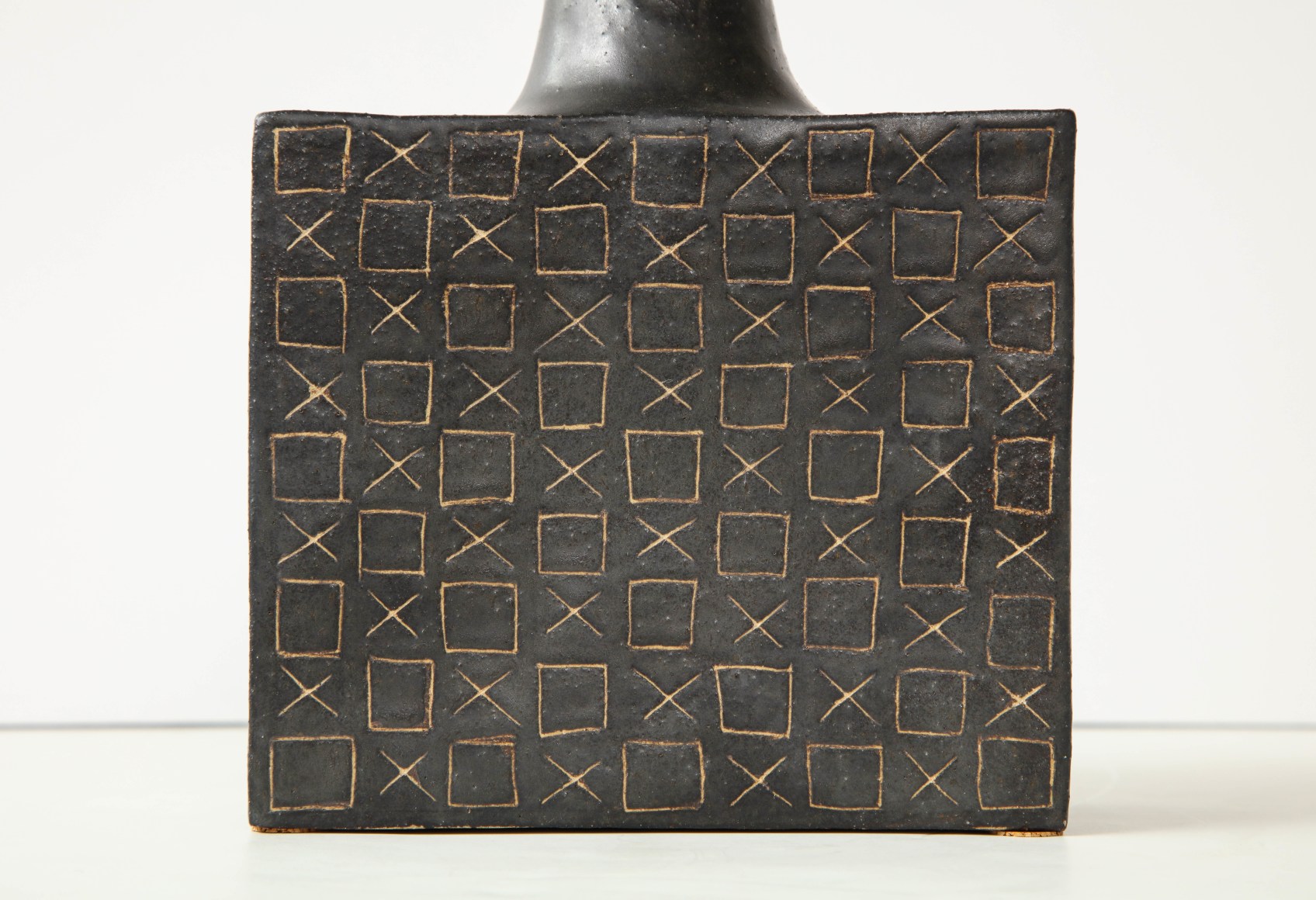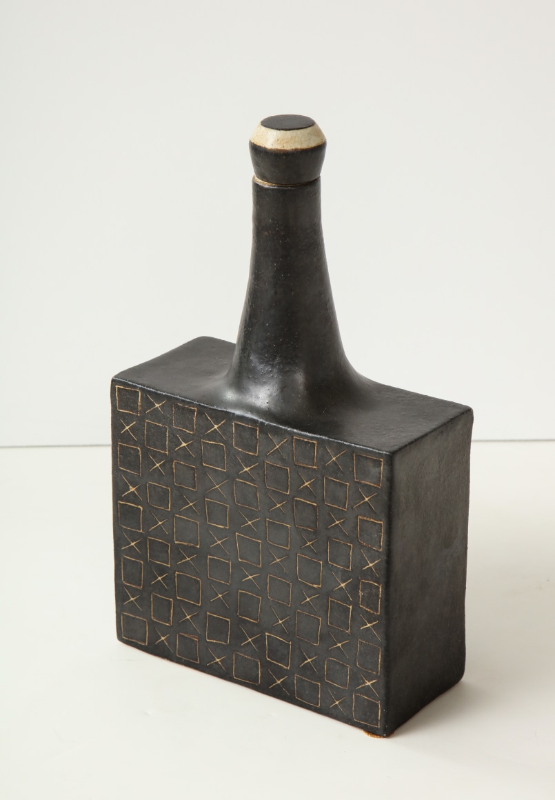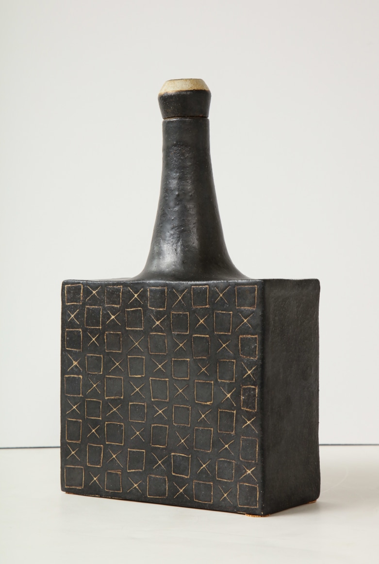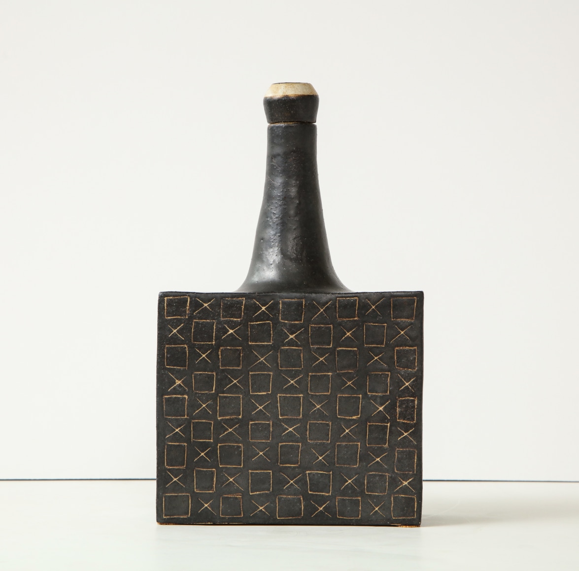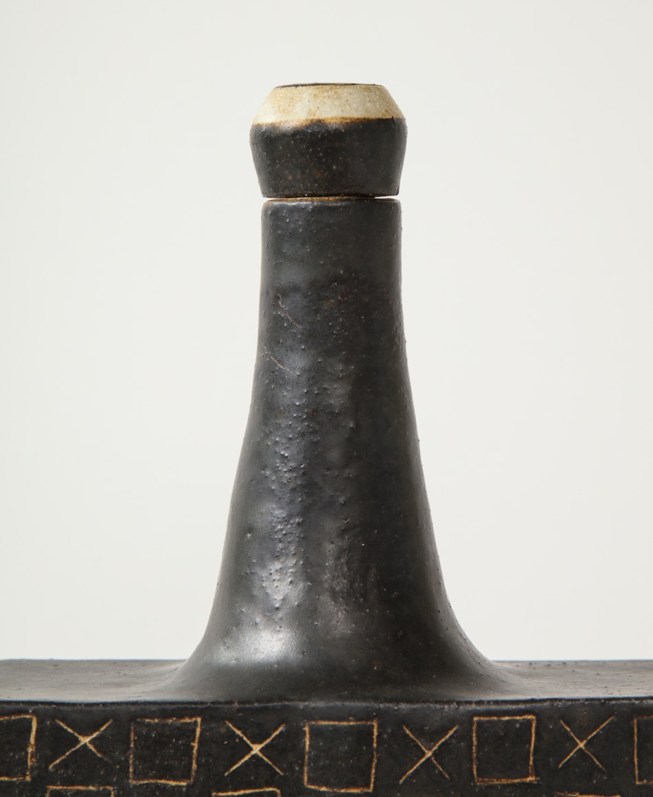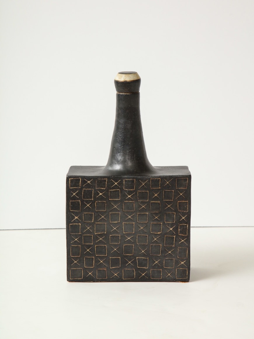 Black square ceramic vessel with stopper and contrasting etched design by Bruno Gambone