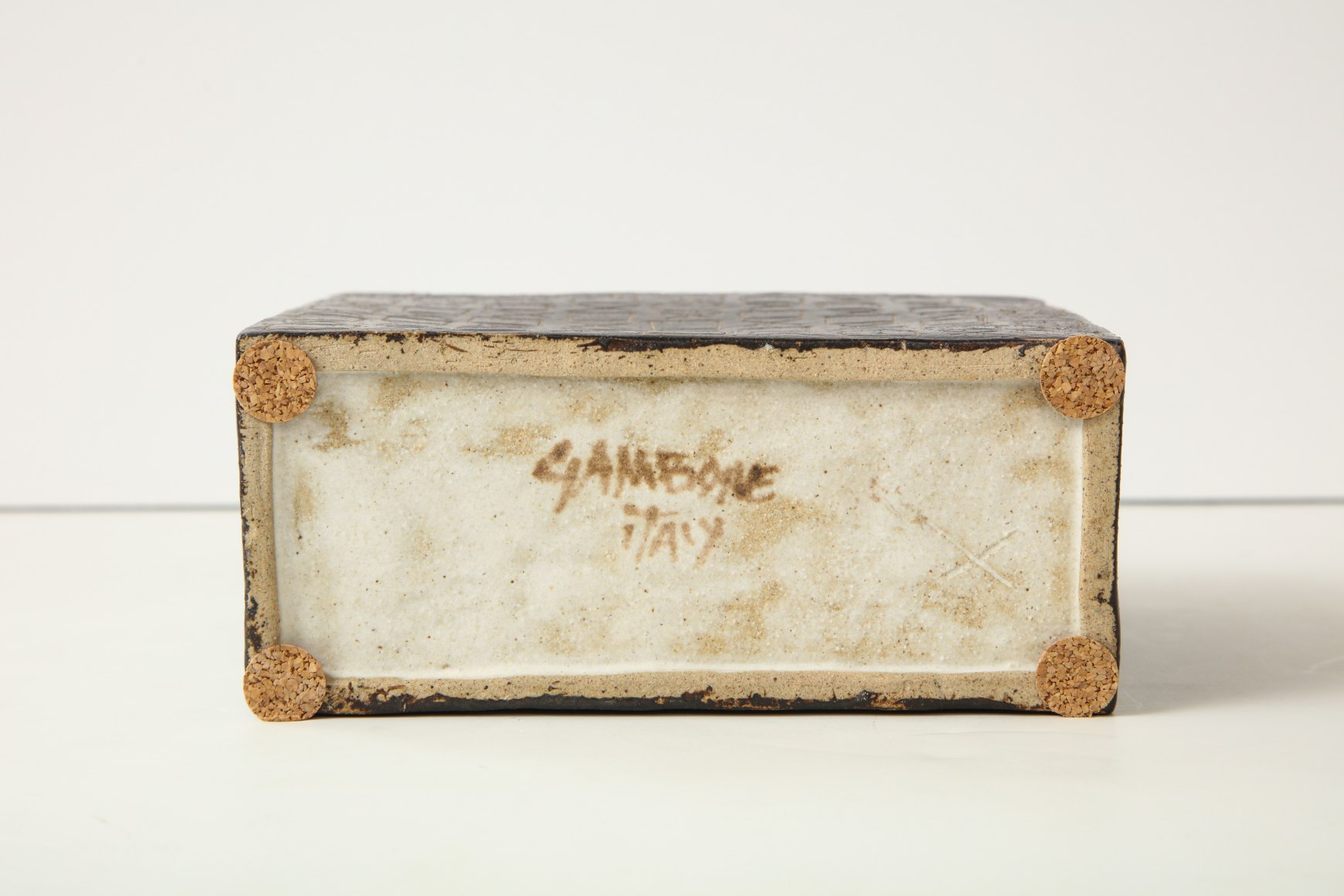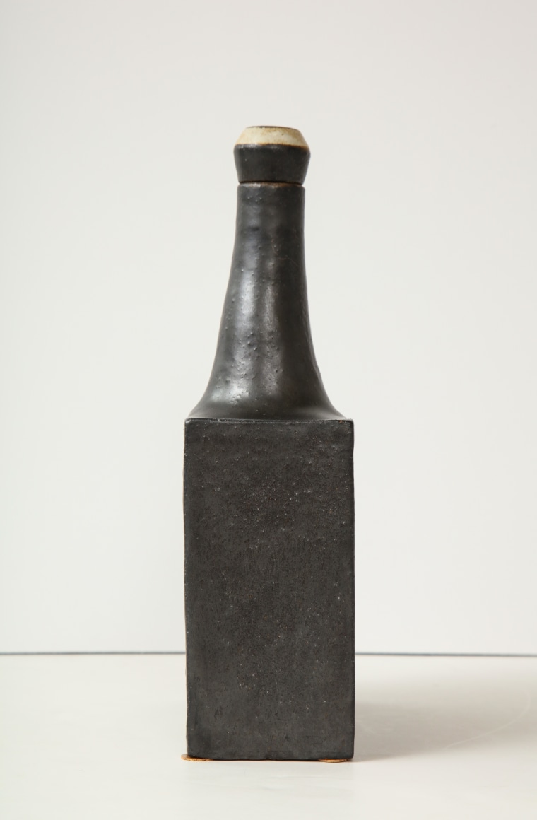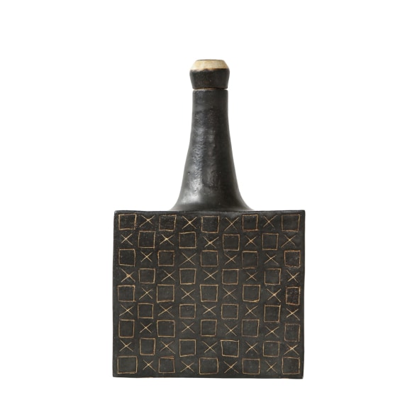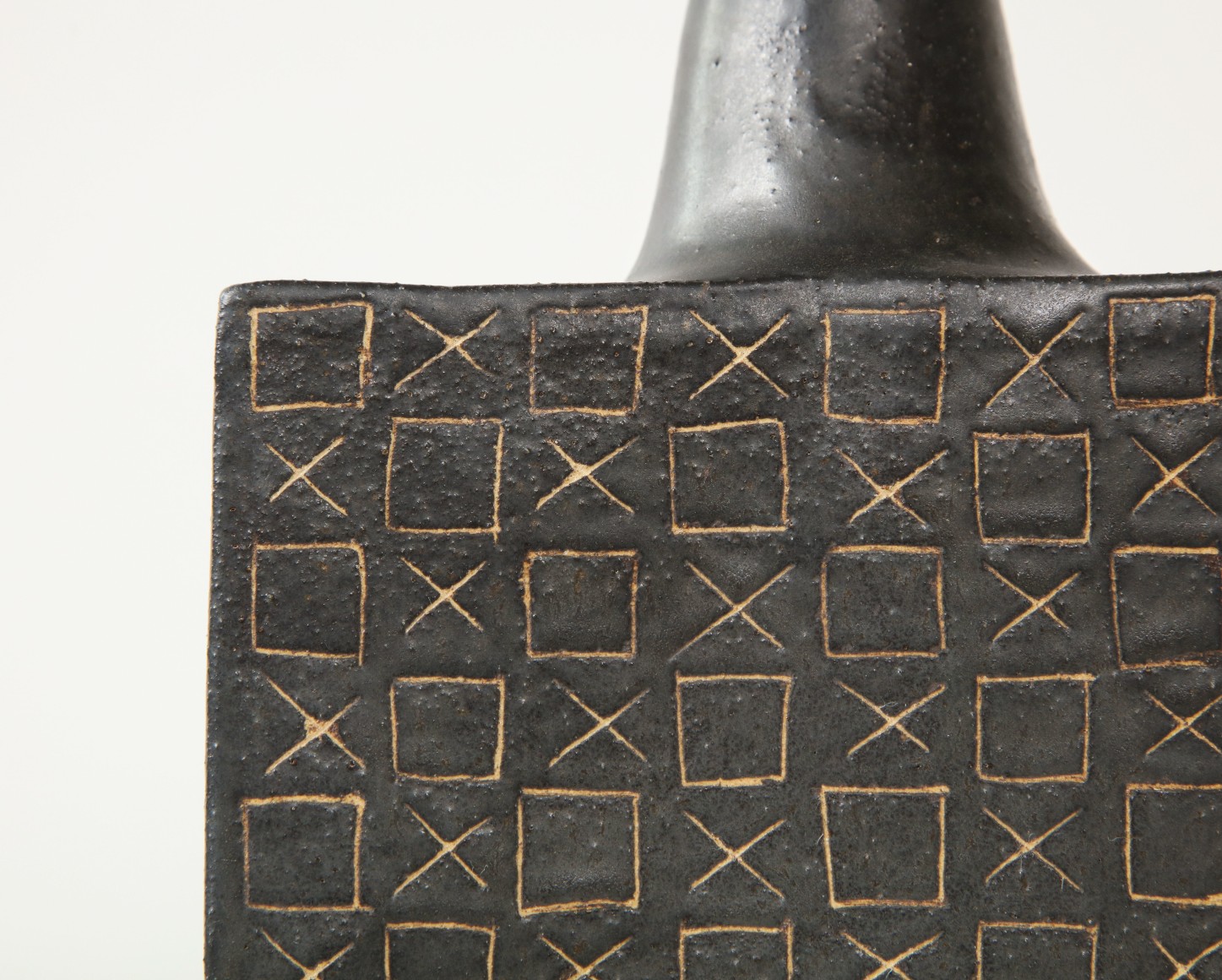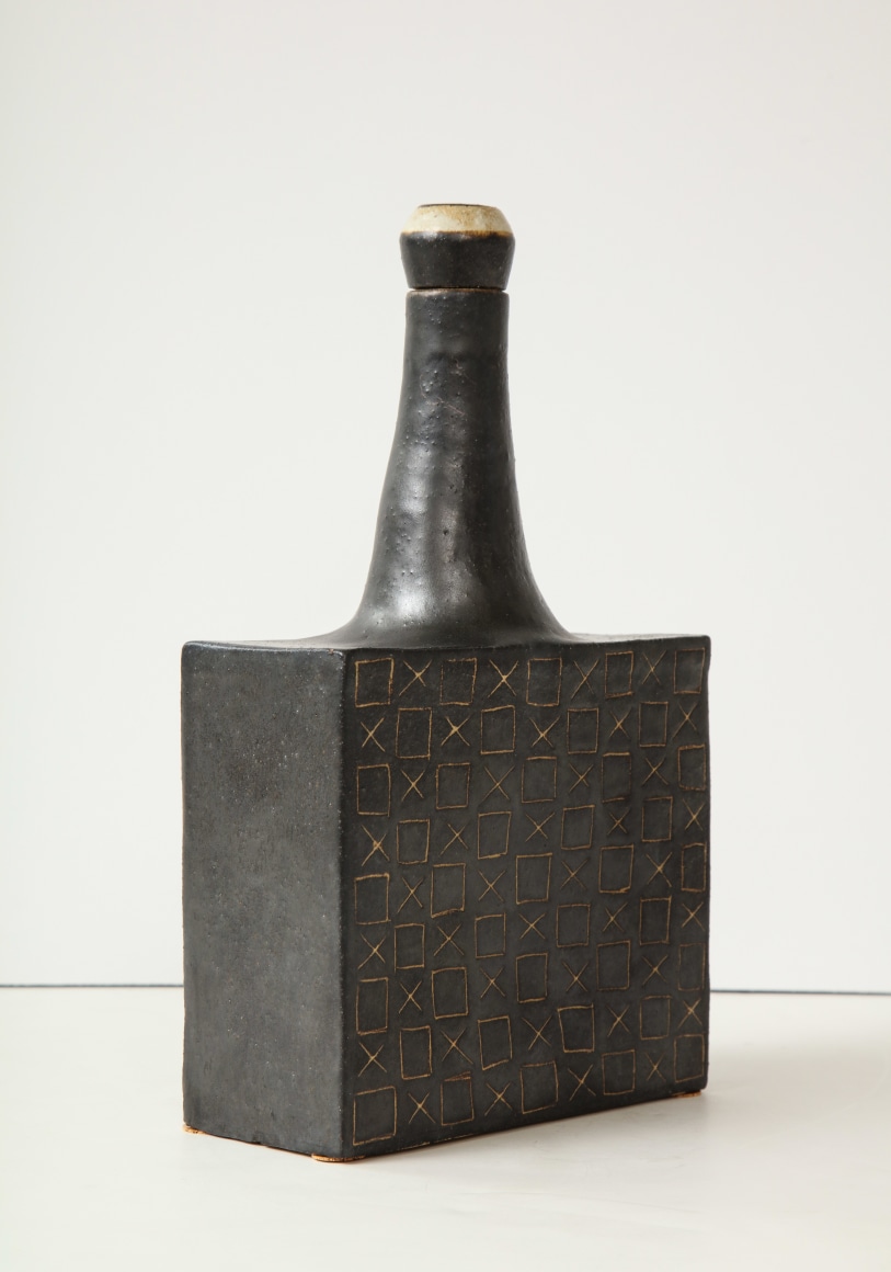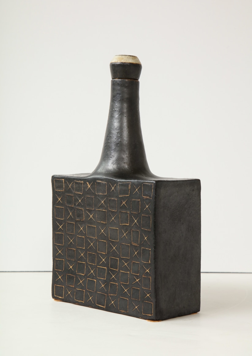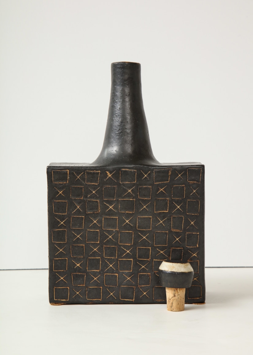 Black square ceramic vessel with stopper and contrasting etched design by Bruno Gambone