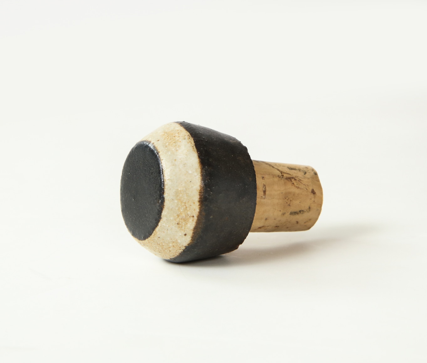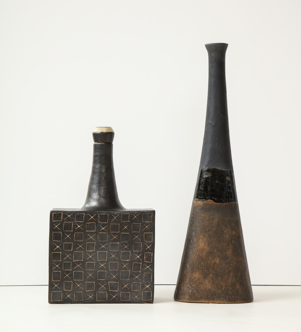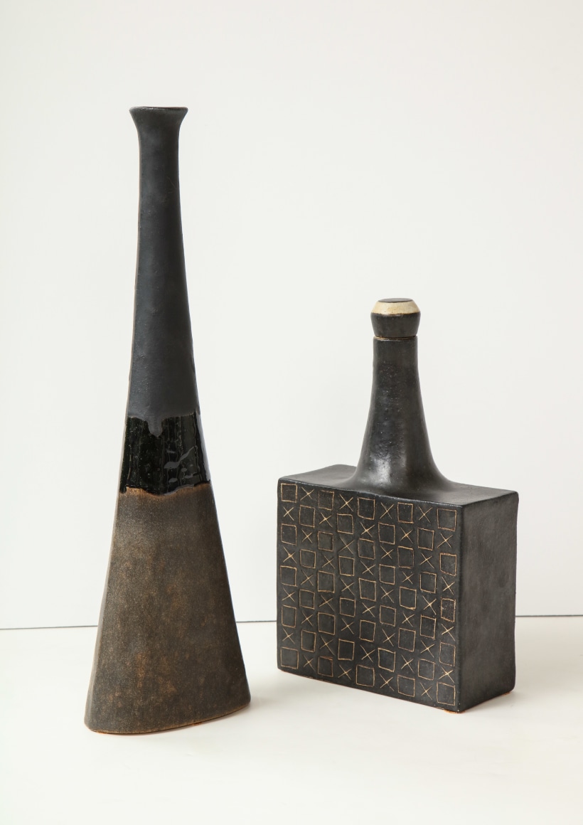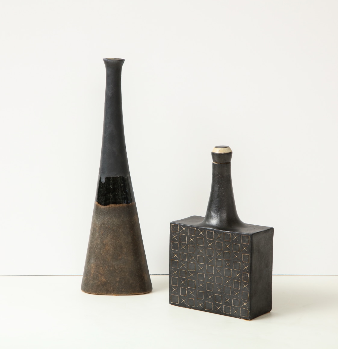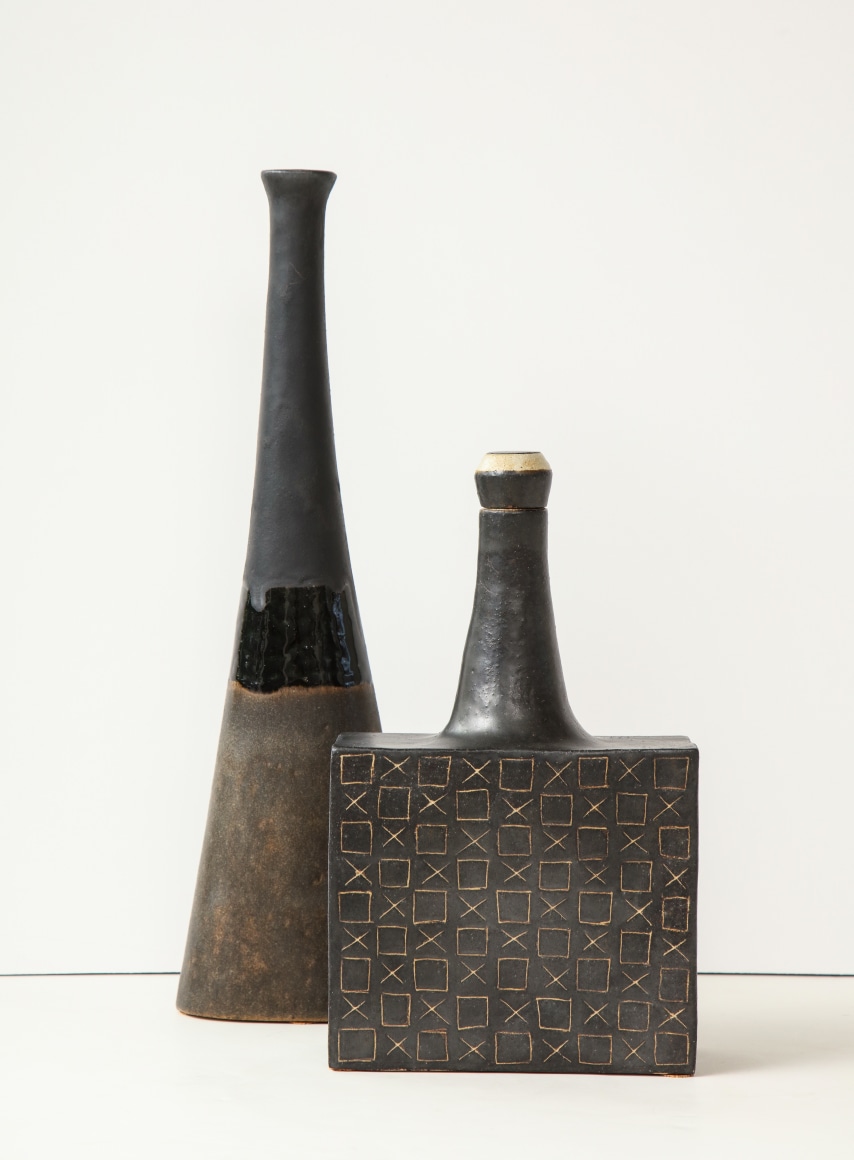 Black square ceramic vessel with stopper and contrasting etched design by Bruno Gambone