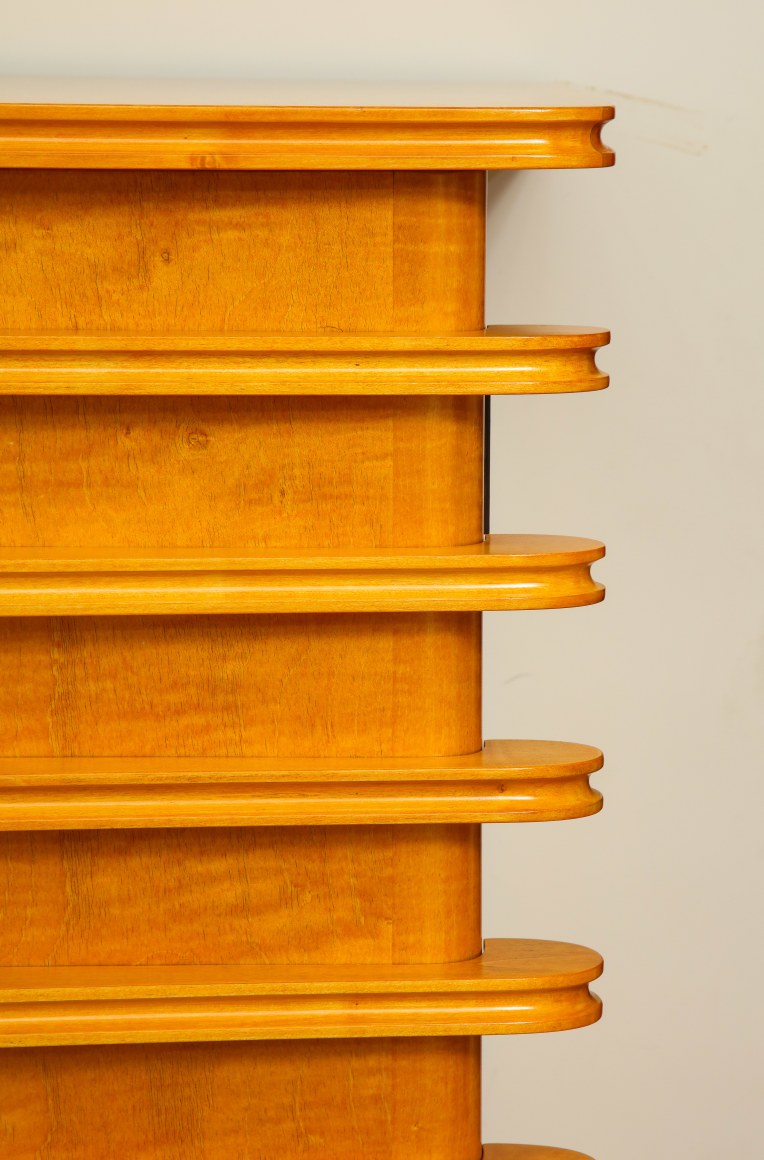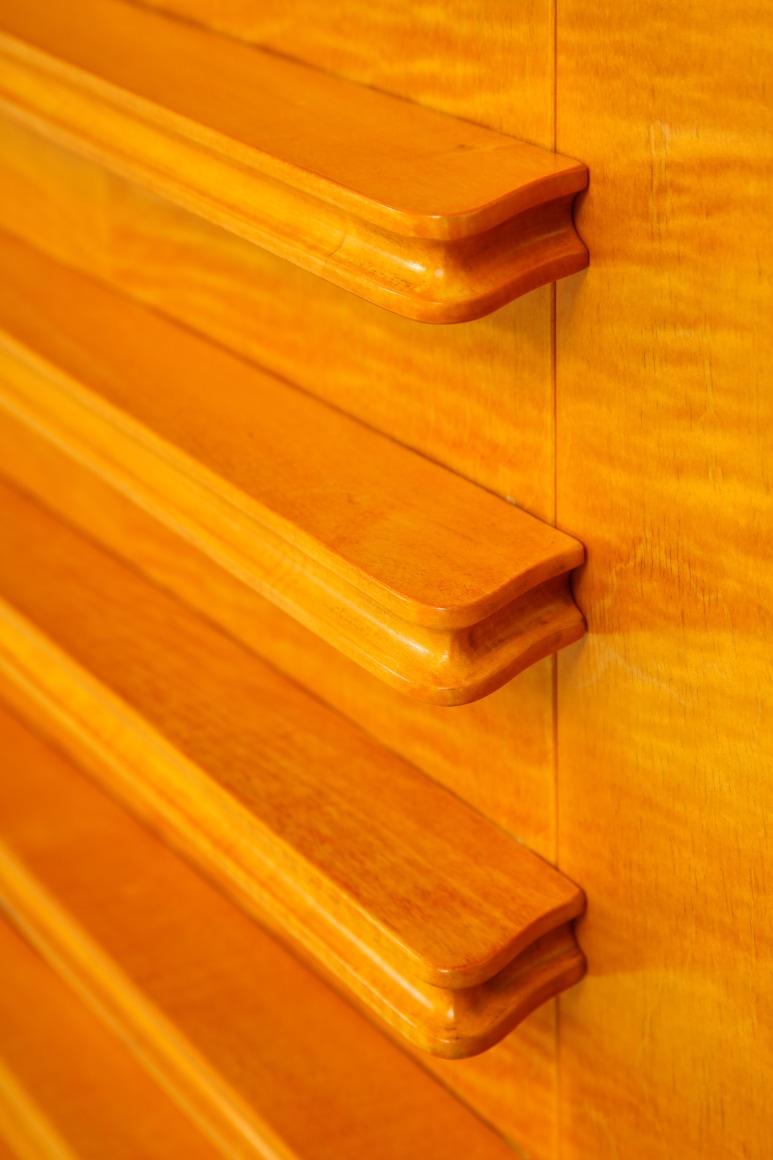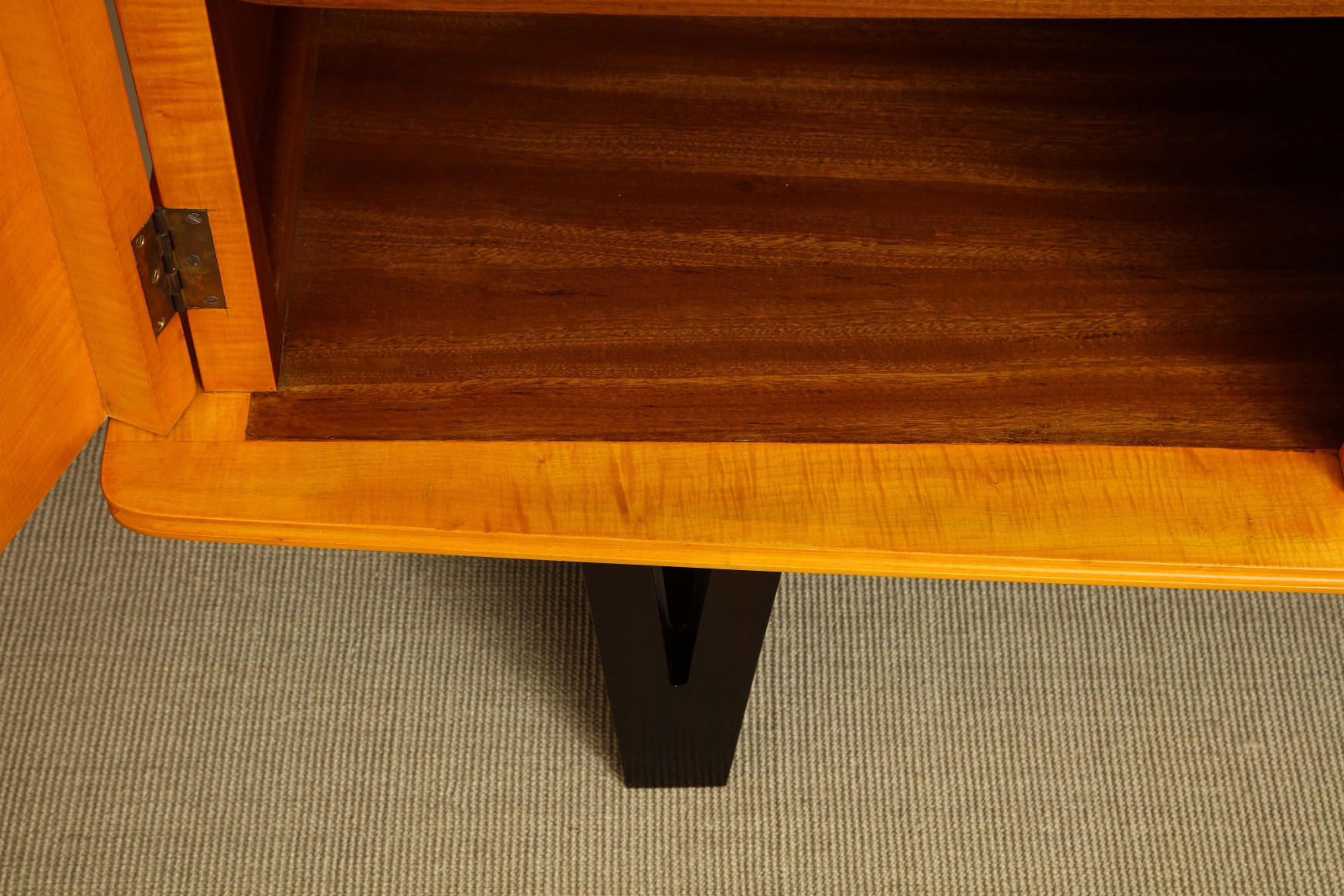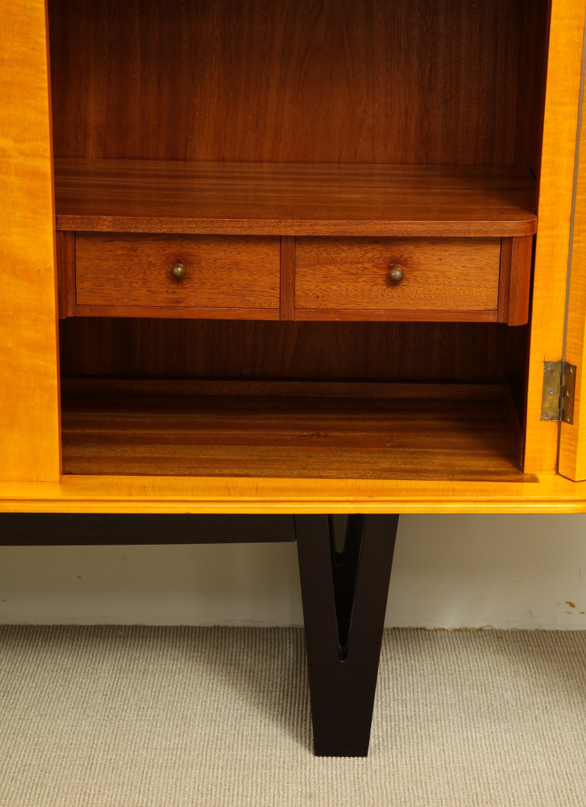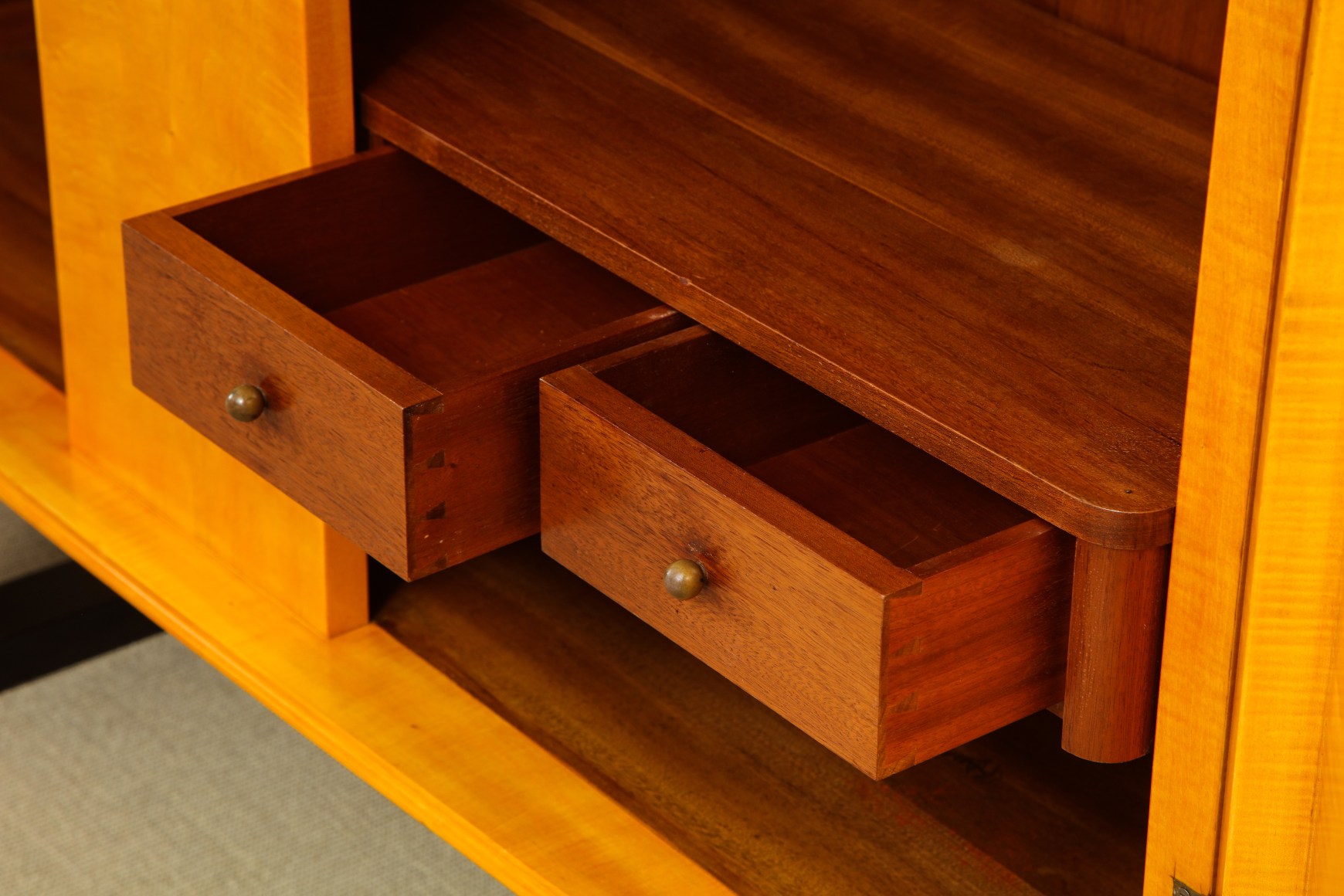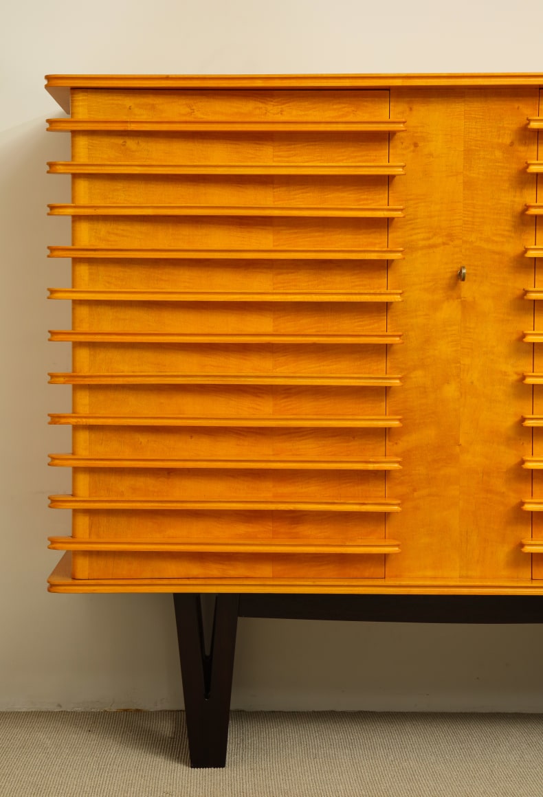 An important storage buffet made from Sycamore wood is opened by two large doors decorated with wood molded blades by E. Verot and R. Clement, France c. 1940