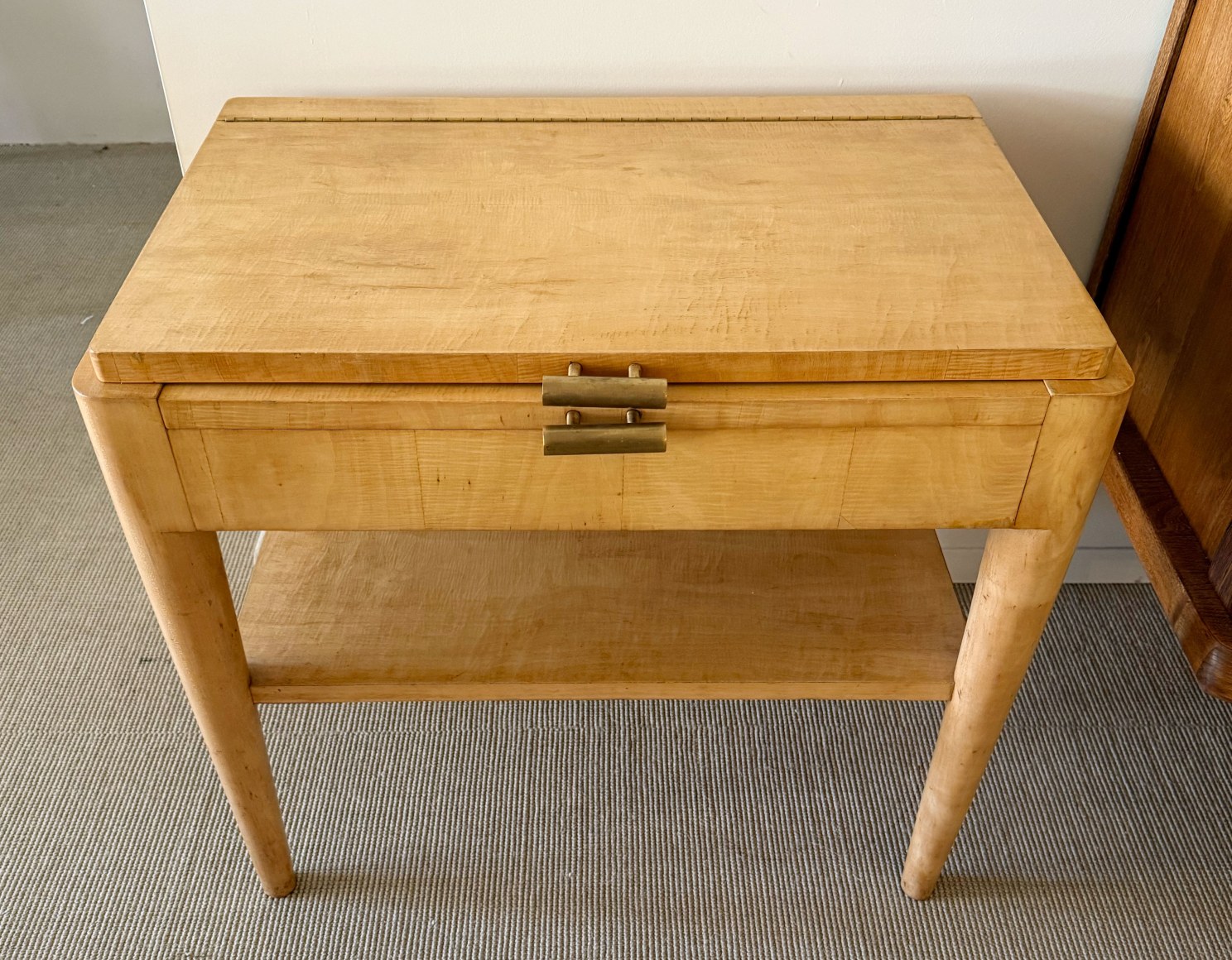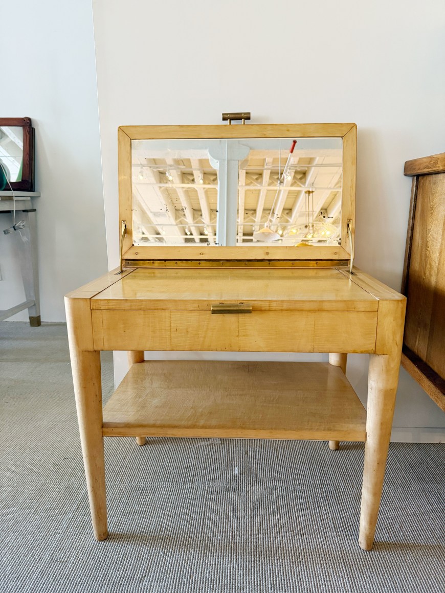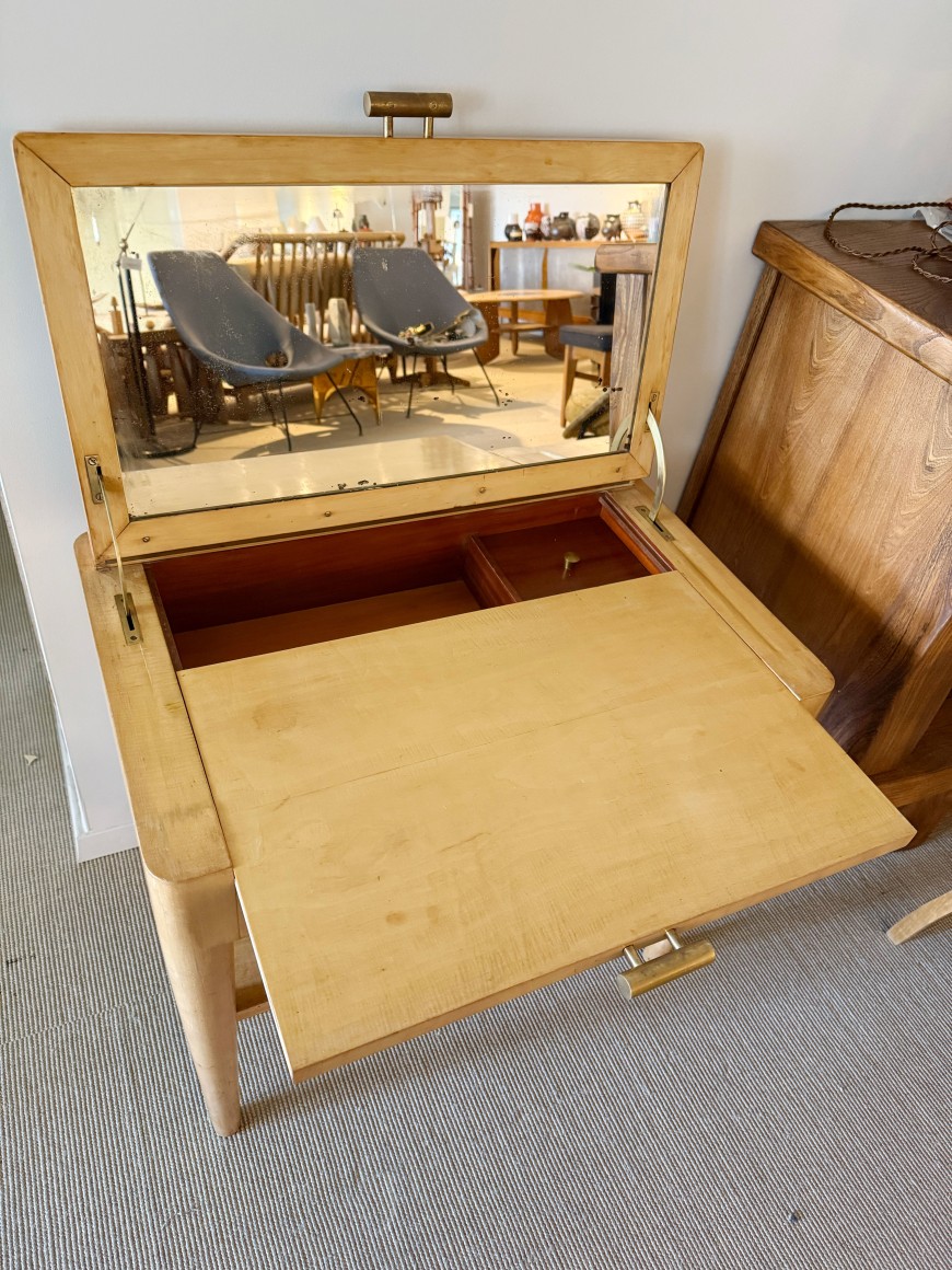 A dressing table, sycamore veneer structure, mirror interior top and mahogany veneer interior, brass handles.