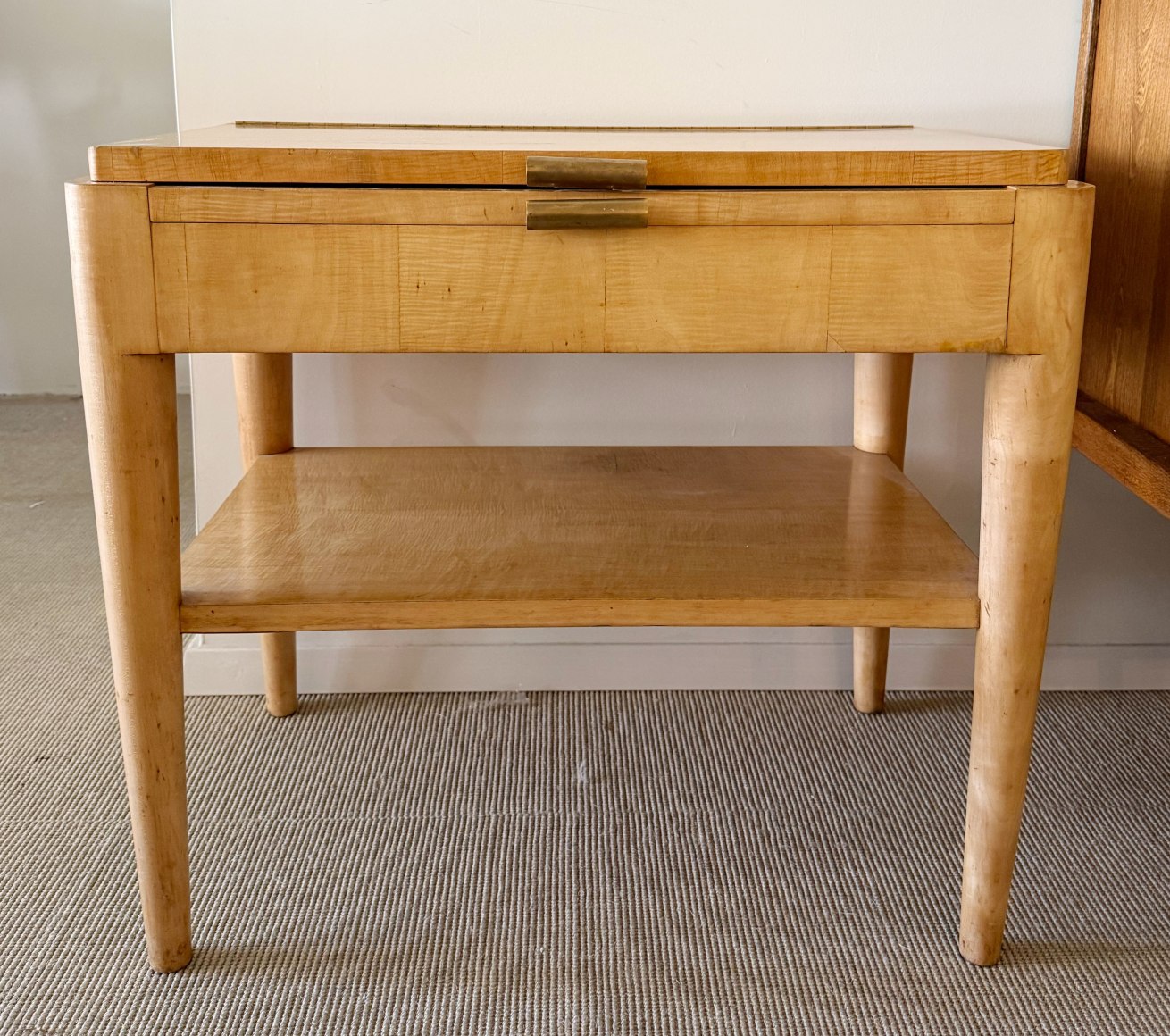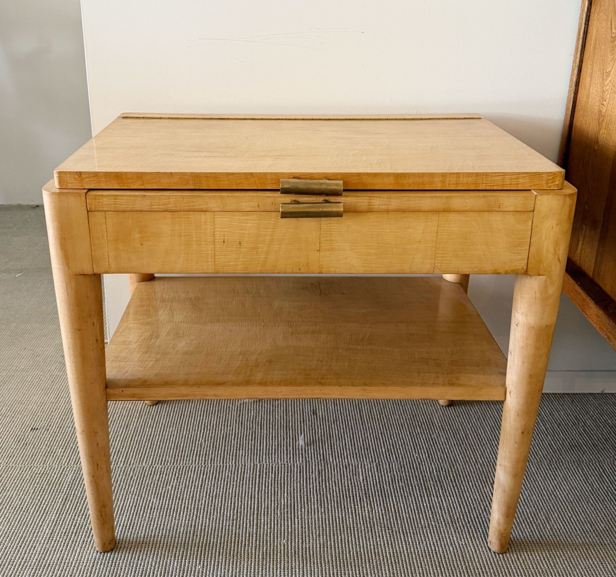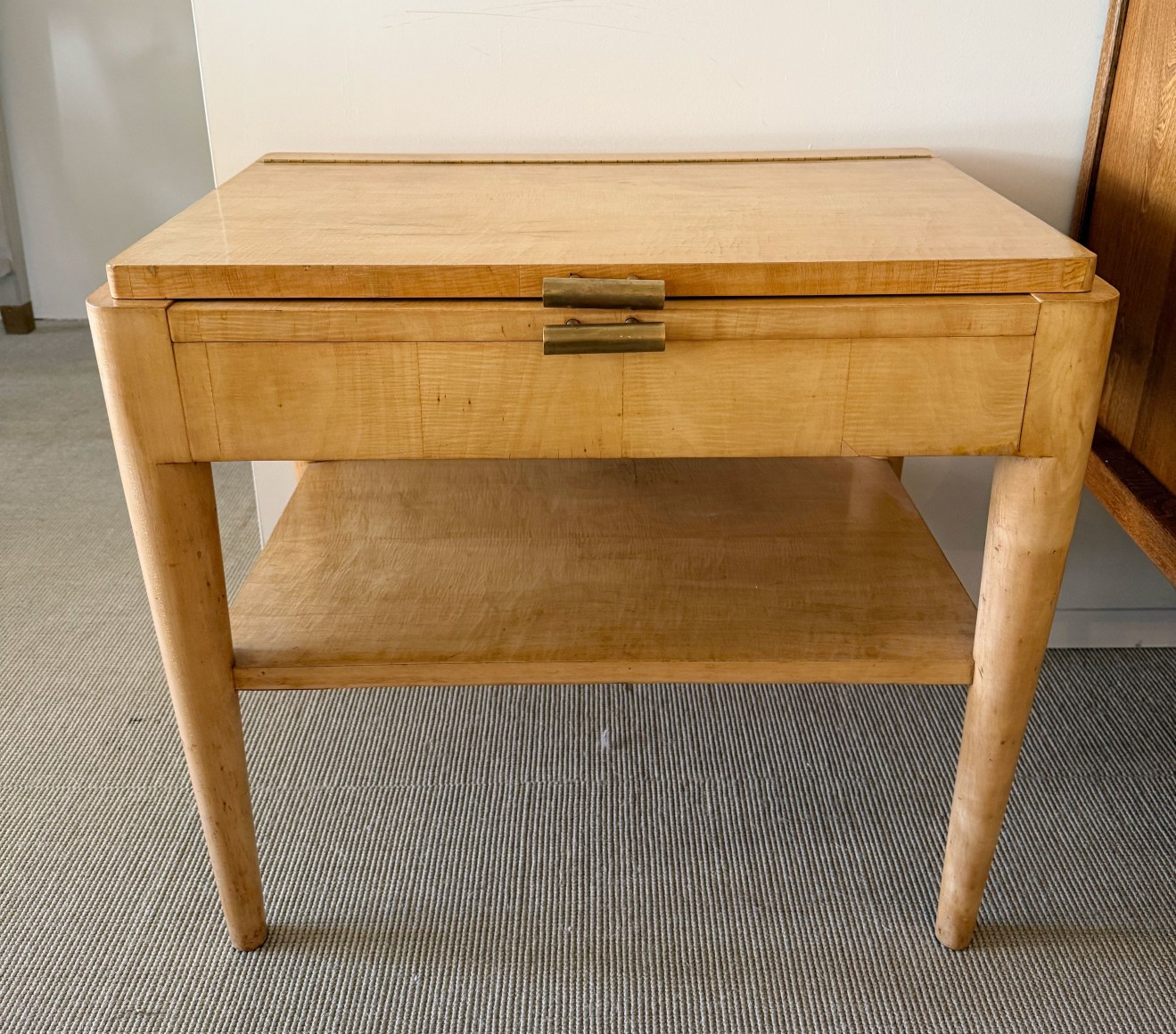 A dressing table, sycamore veneer structure, mirror interior top and mahogany veneer interior, brass handles.