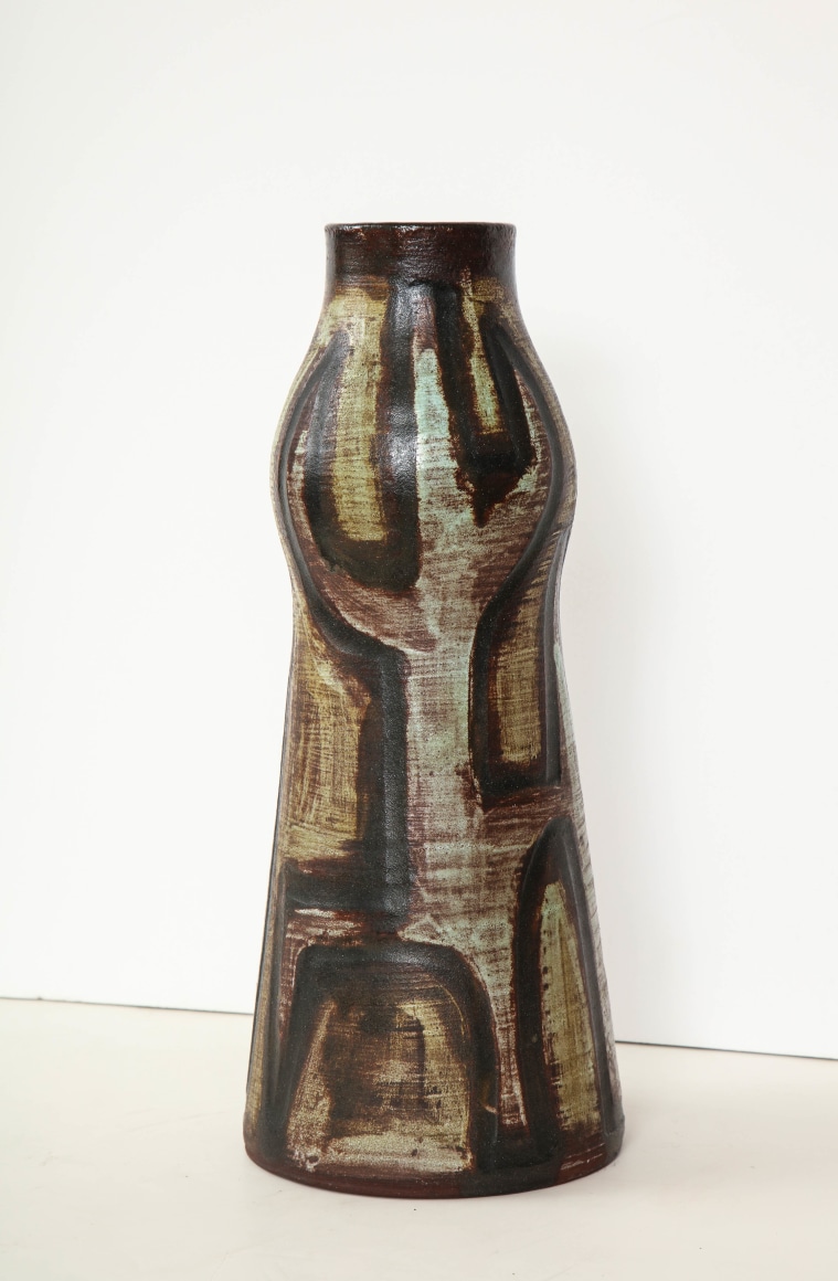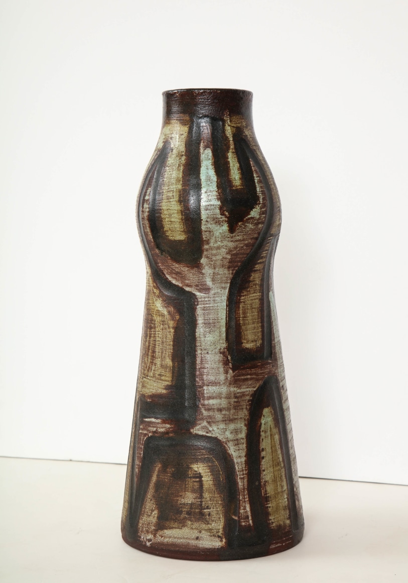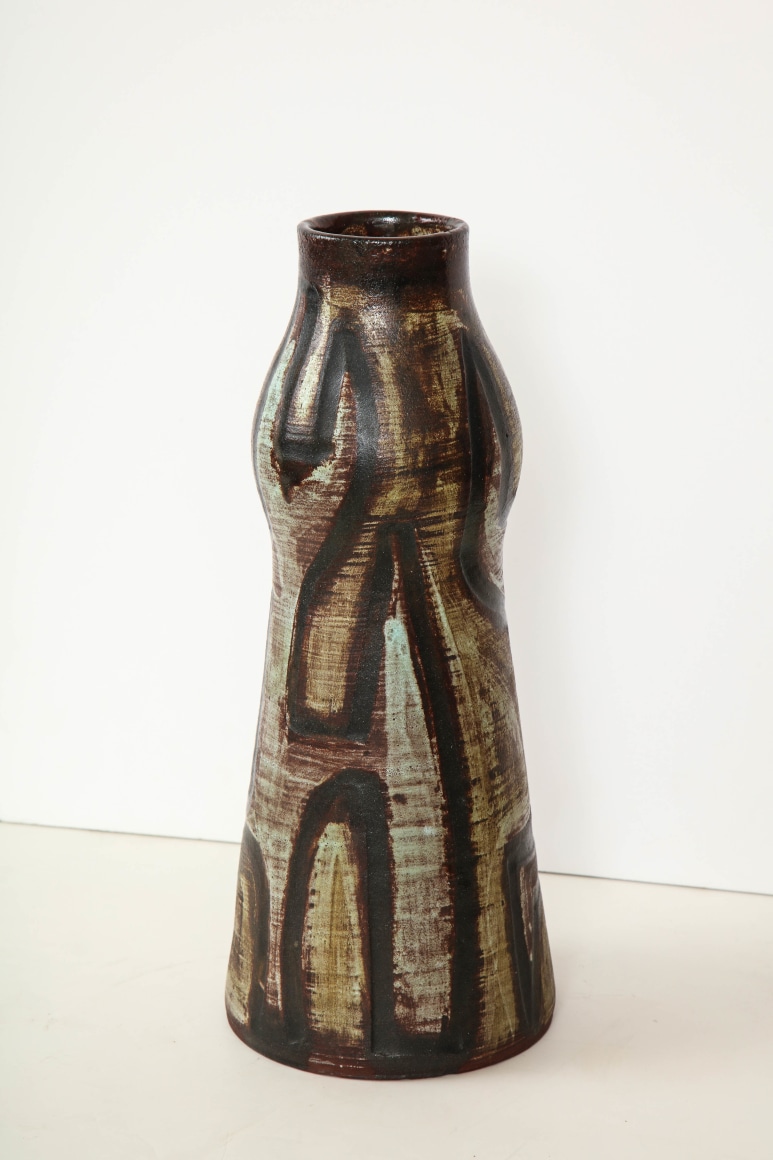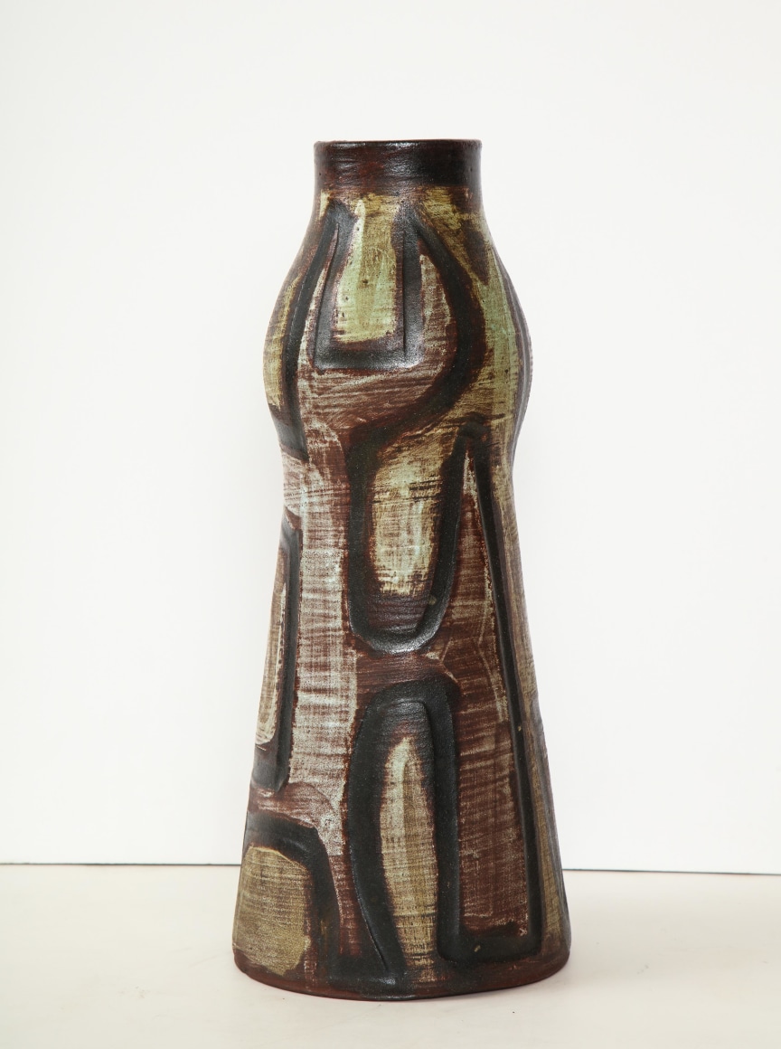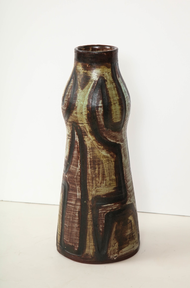 Tall Accolay vase in brown and grey primitive design, France c. 1950