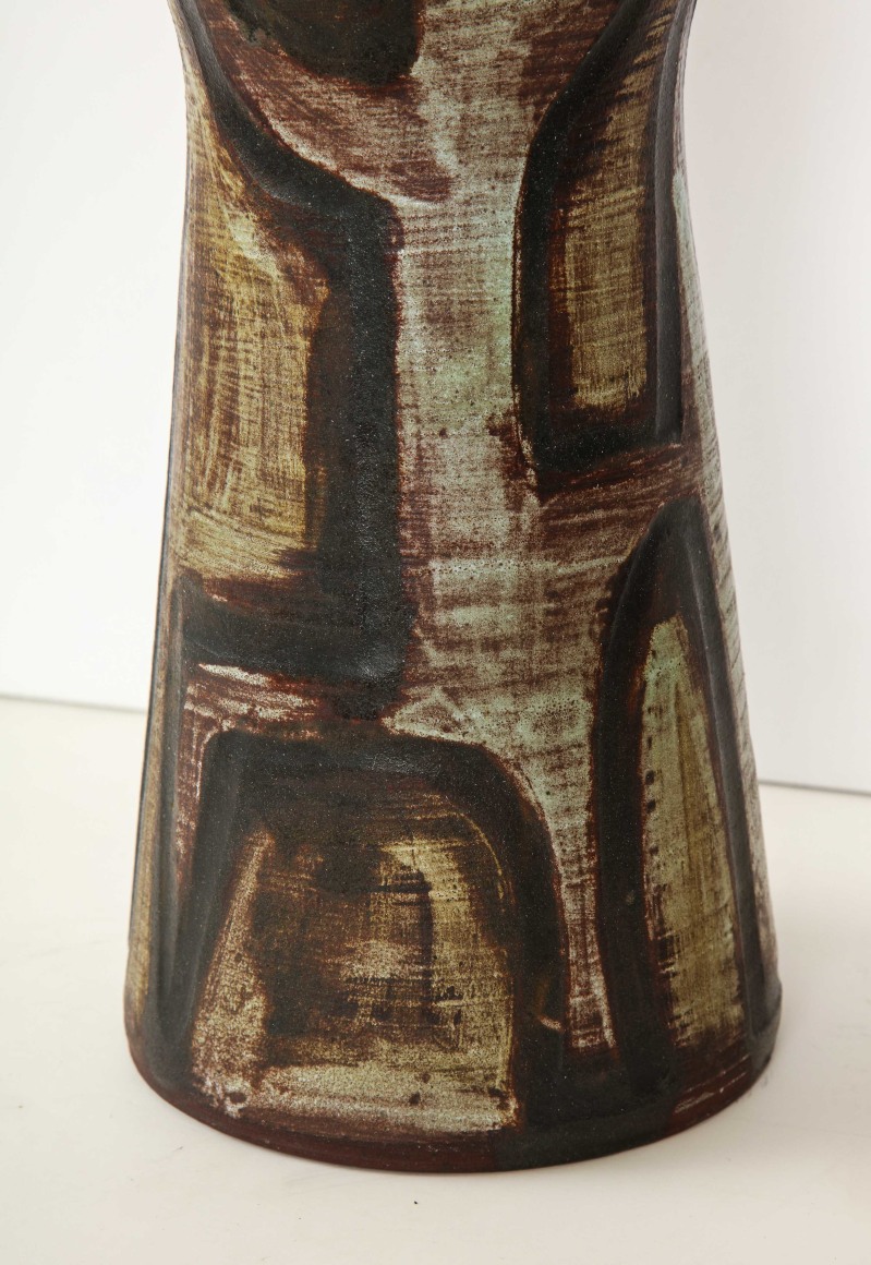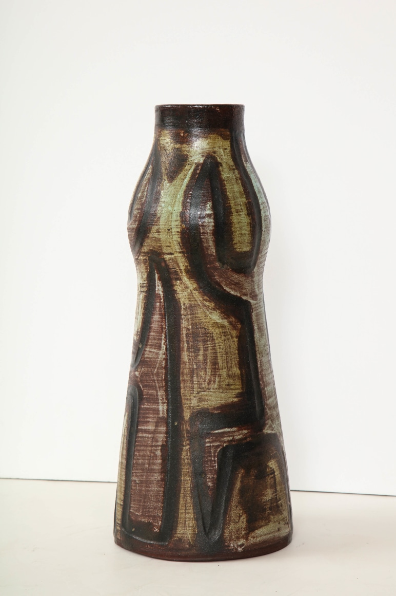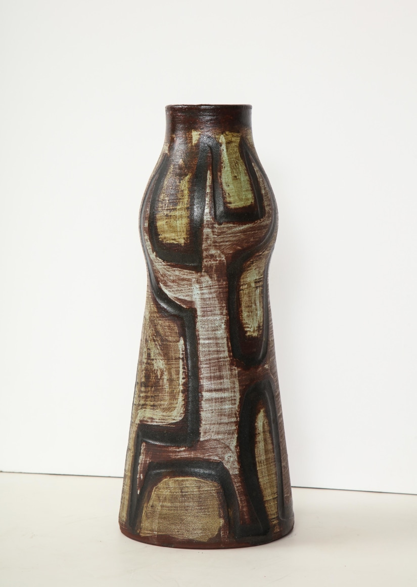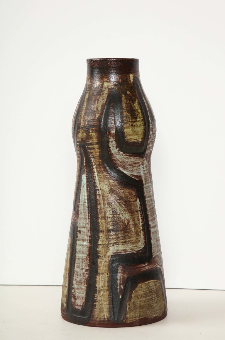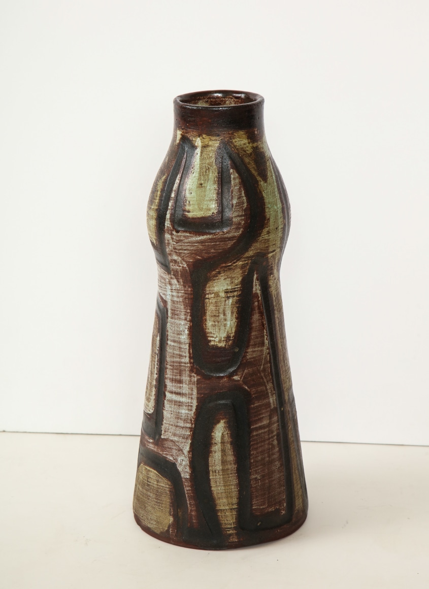 Tall Accolay vase in brown and grey primitive design, France c. 1950