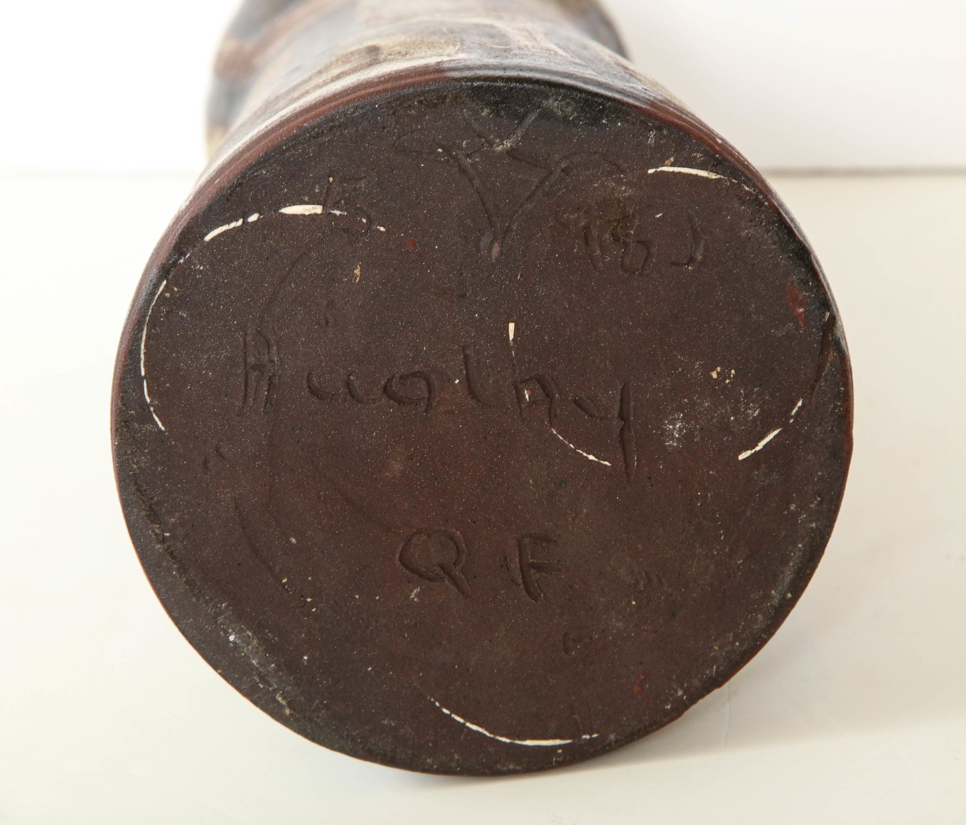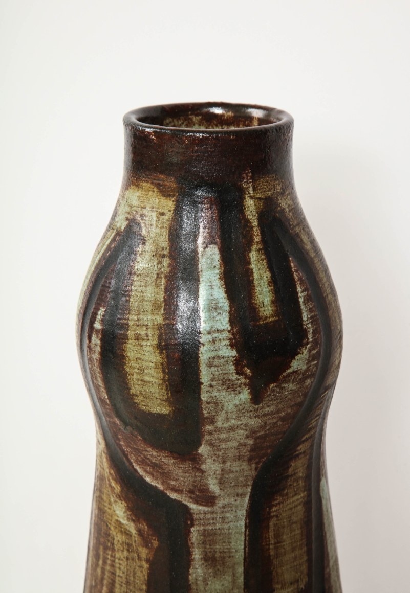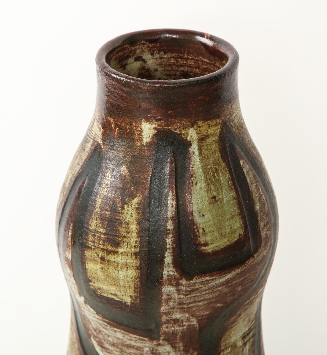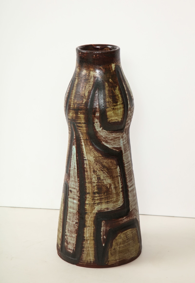 Tall Accolay vase in brown and grey primitive design, France c. 1950