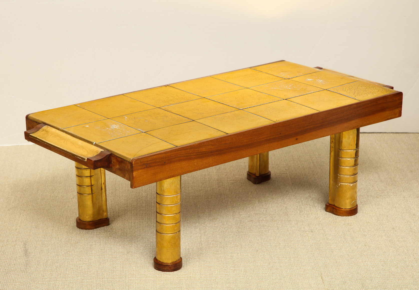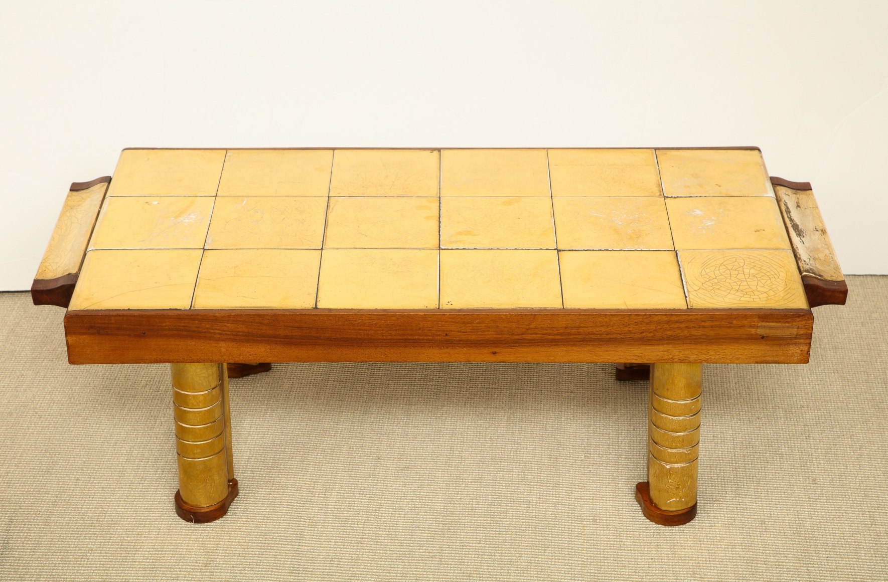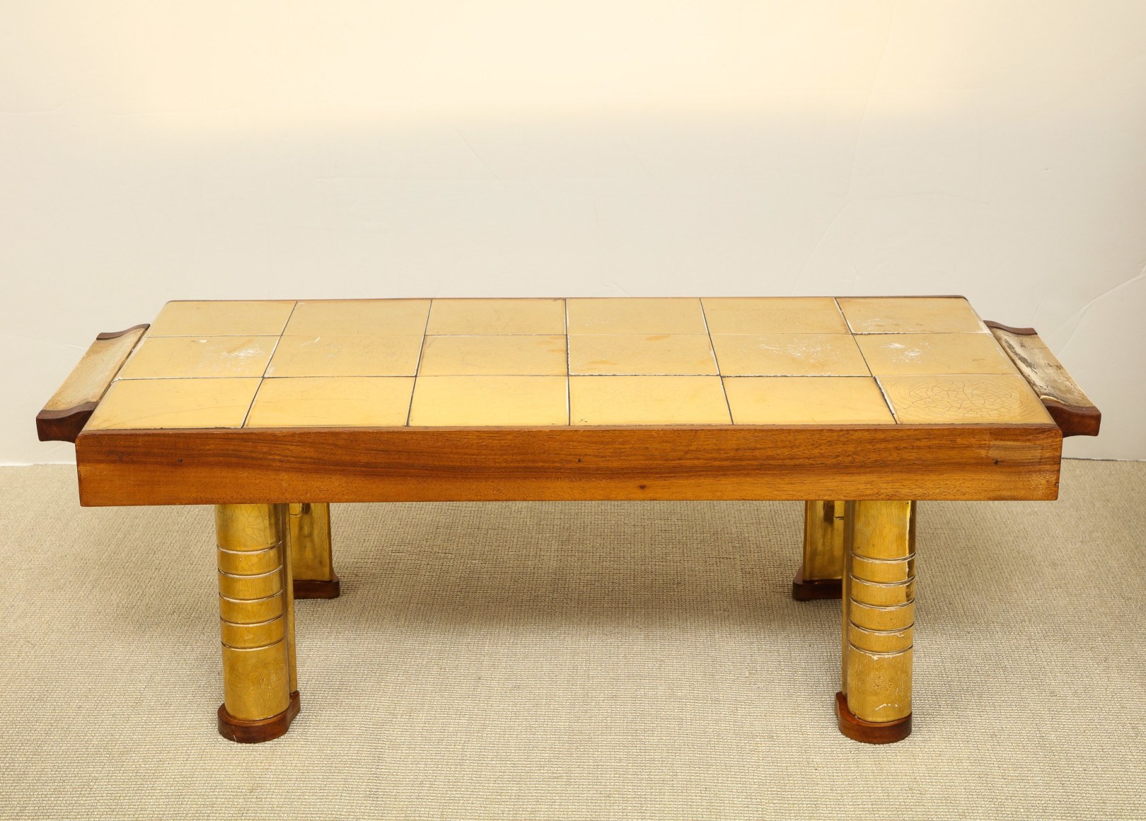 Wood and bronze low table with tile top by Jean Nayadon, French c. 1940