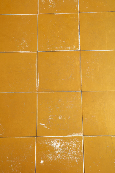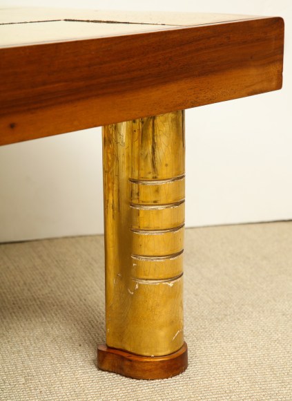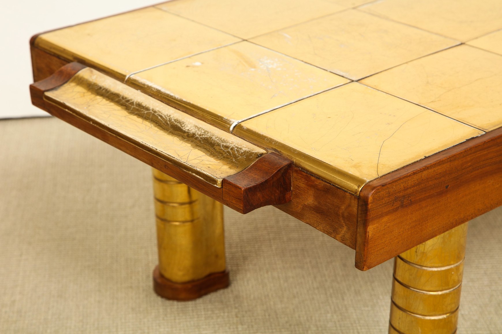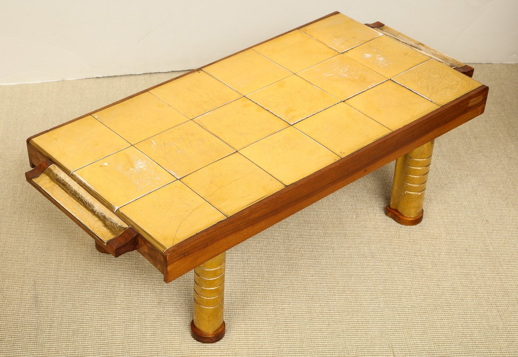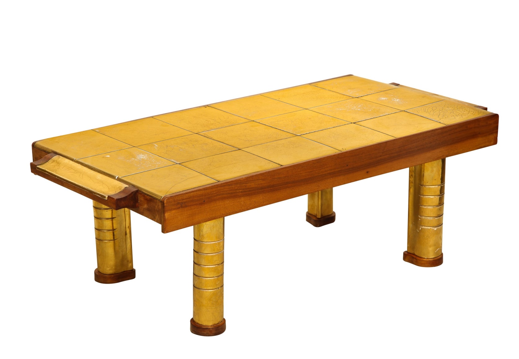 Wood and bronze low table with tile top by Jean Nayadon, French c. 1940