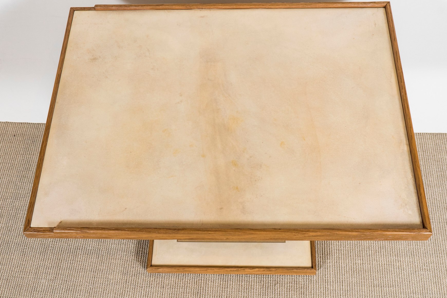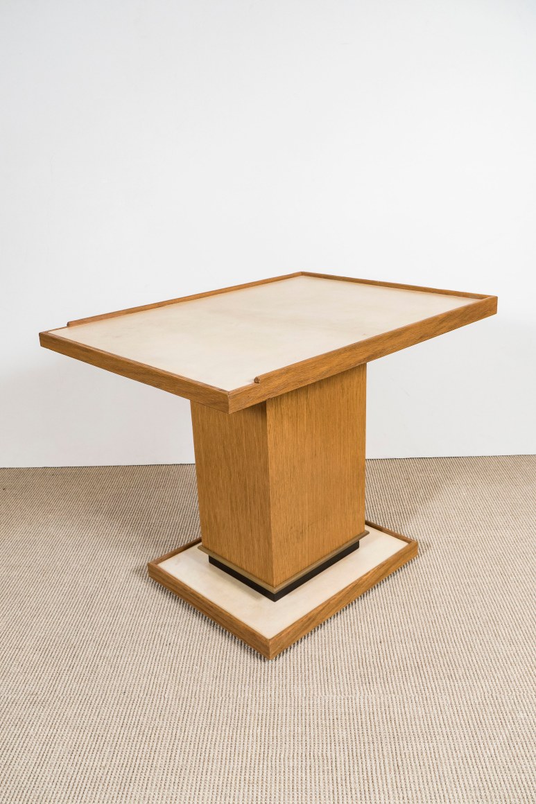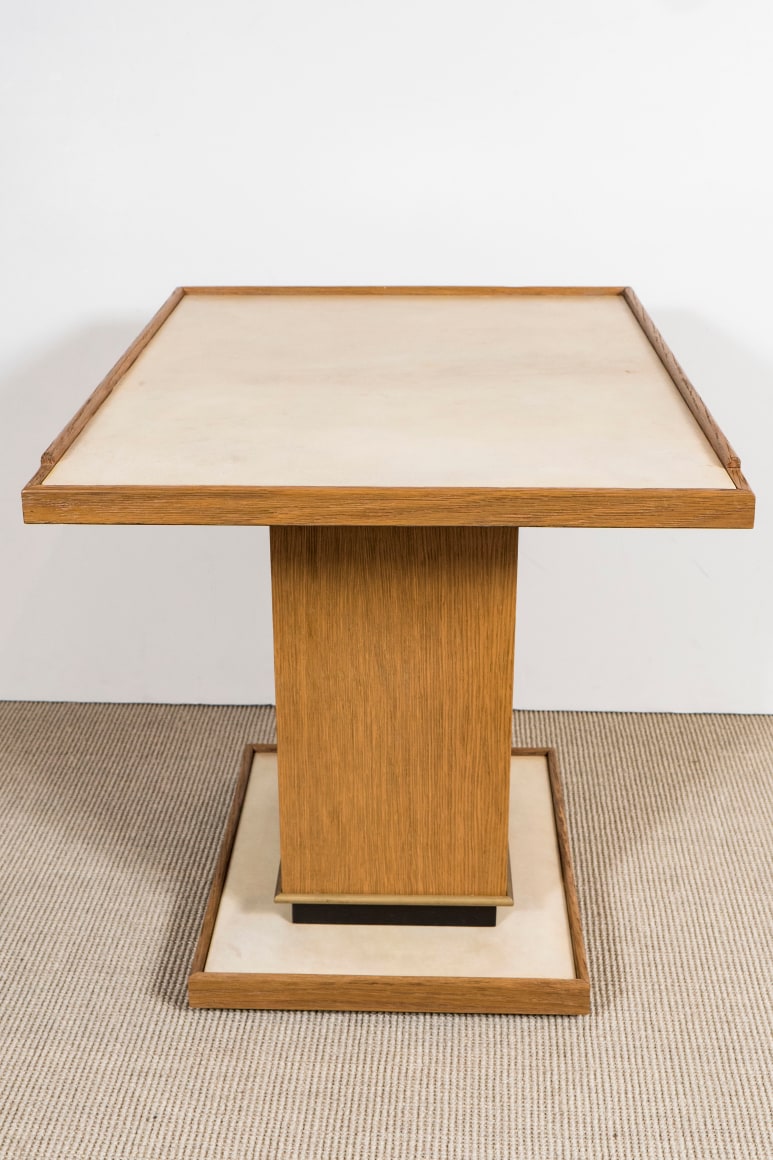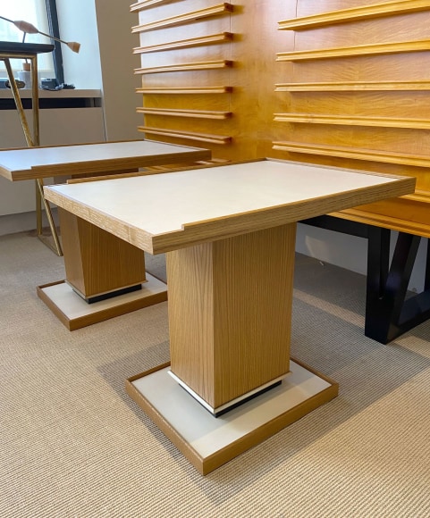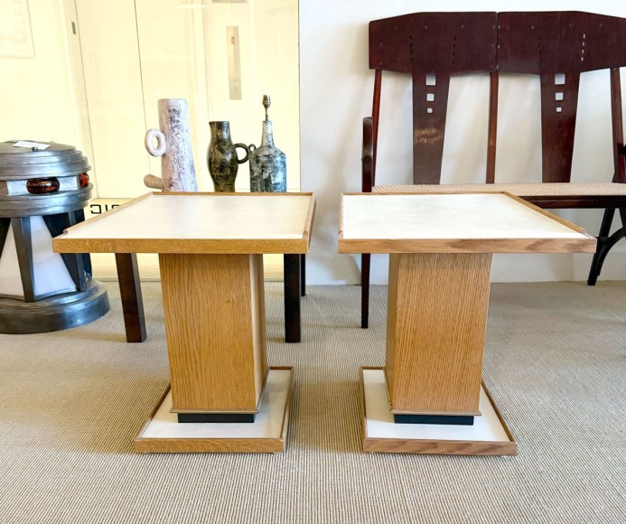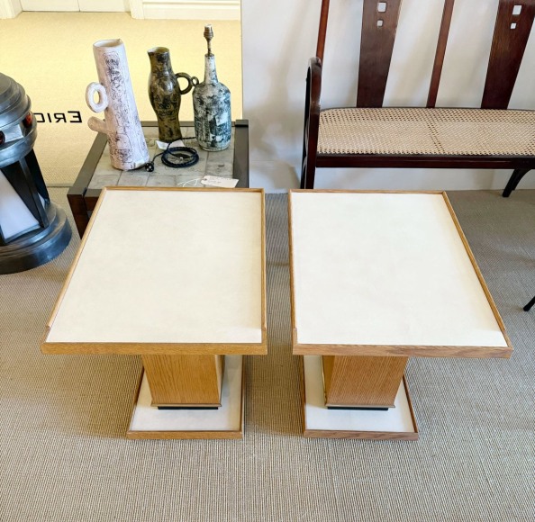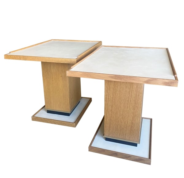 Pair of cerused oak side tables with parchment top and bronze details in the Manner of Dupré-Lafon by Appel Modern