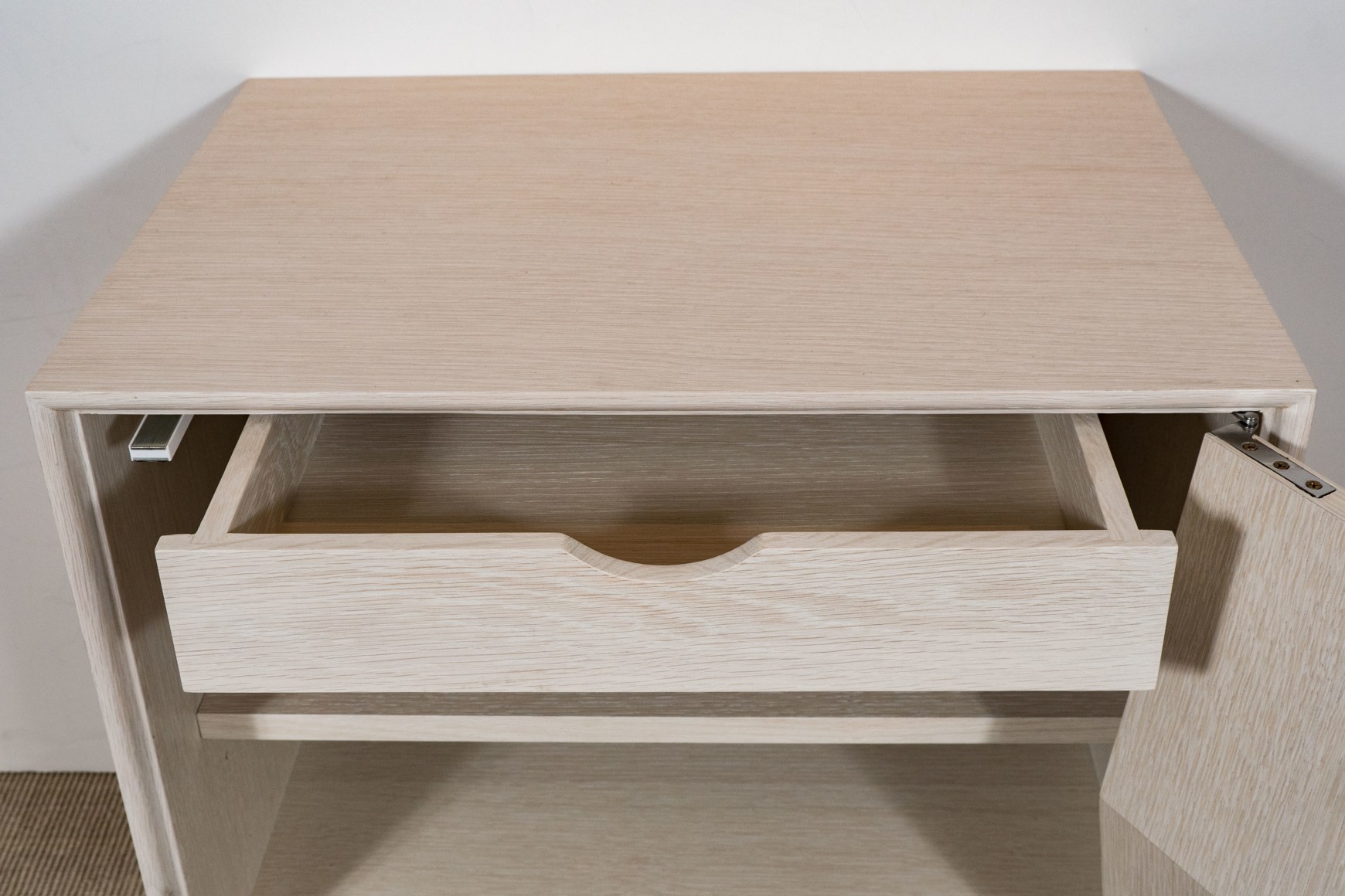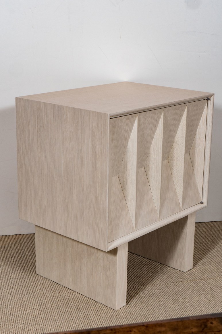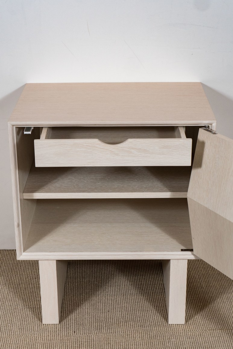 Pair of sculpted front night stands in light cerused oak with interior shelf and drawer by Appel Modern