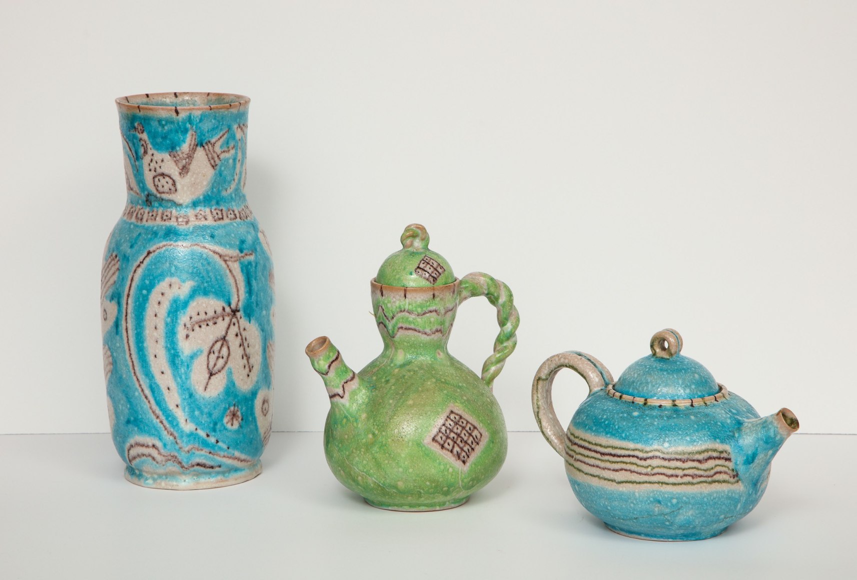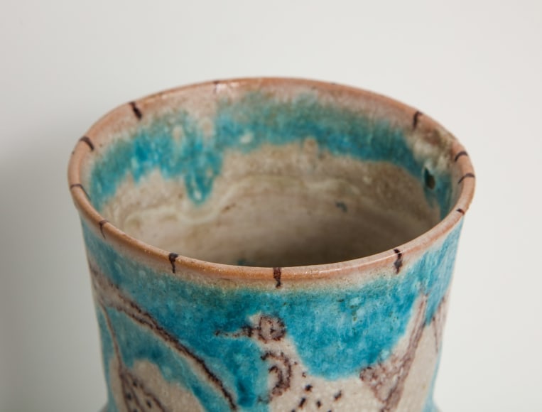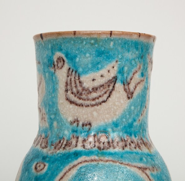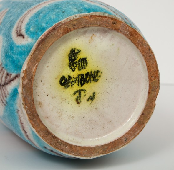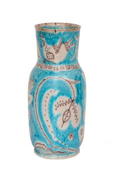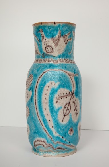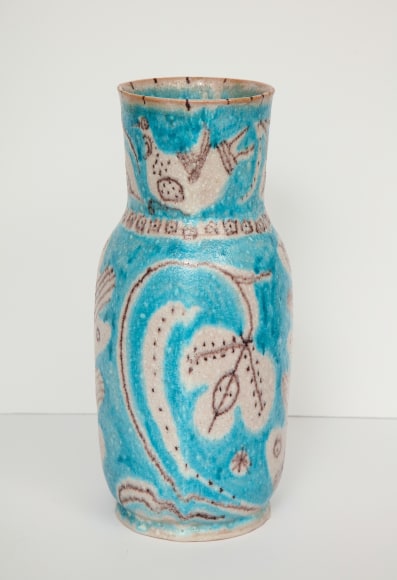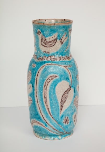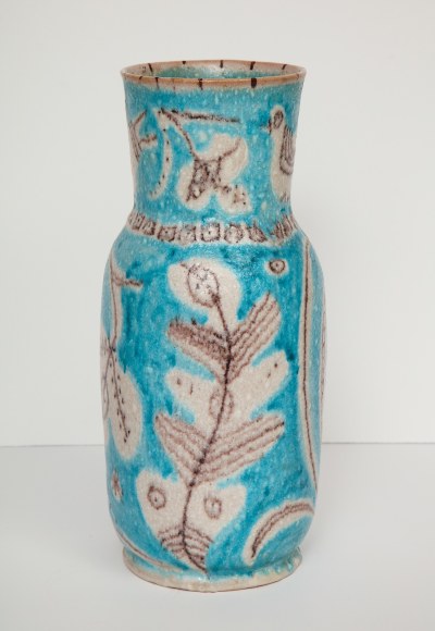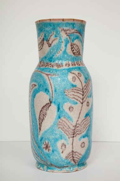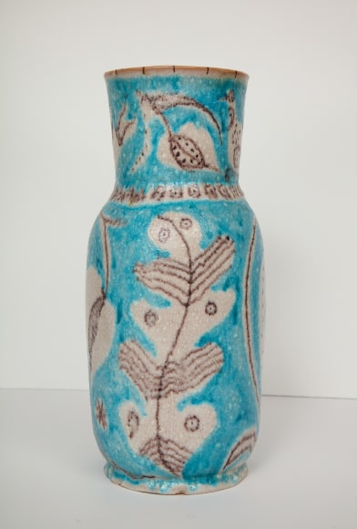 Ceramic vase in blue glaze with leaf pattern by Guido Gambone, Italy c. 1950