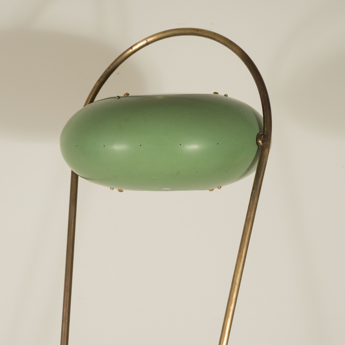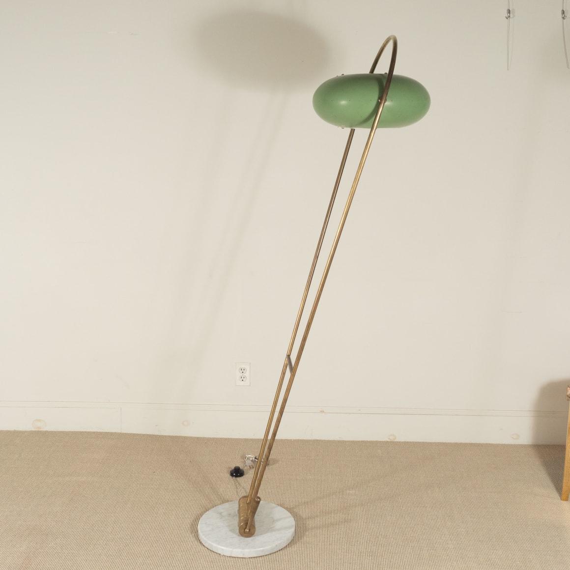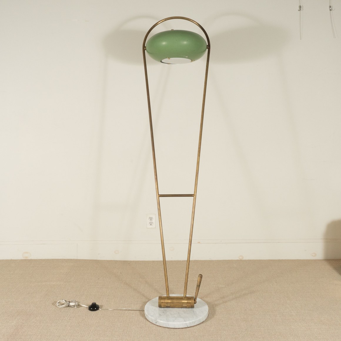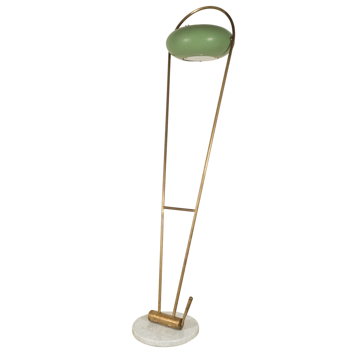 Brass Floor Lamp with green tole shade and marble base in the manner of Angelo Lelii for Arredoluce, Italy c. 1950