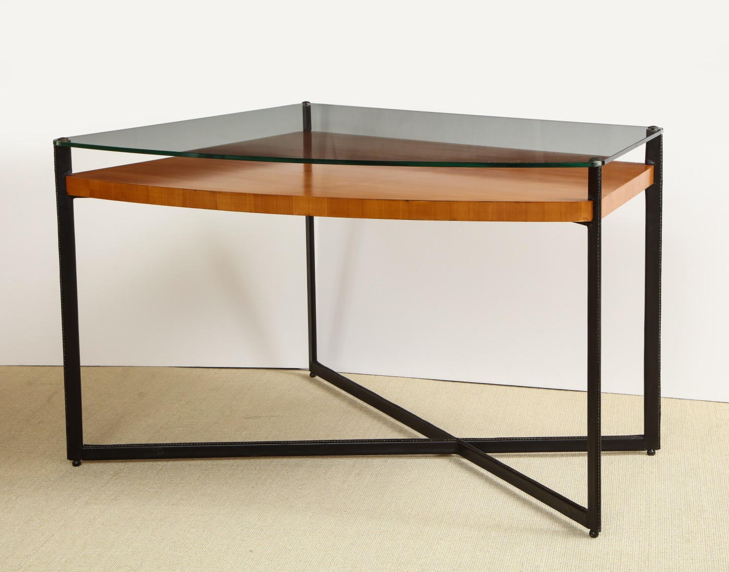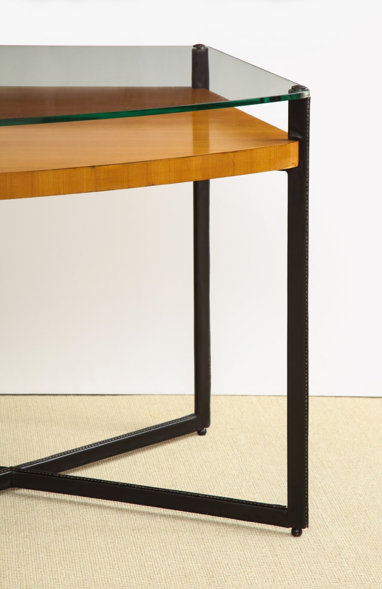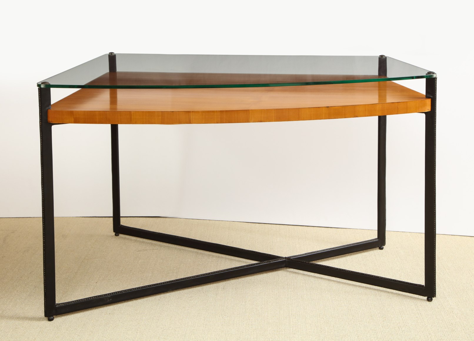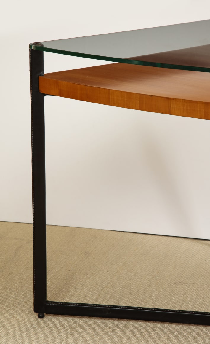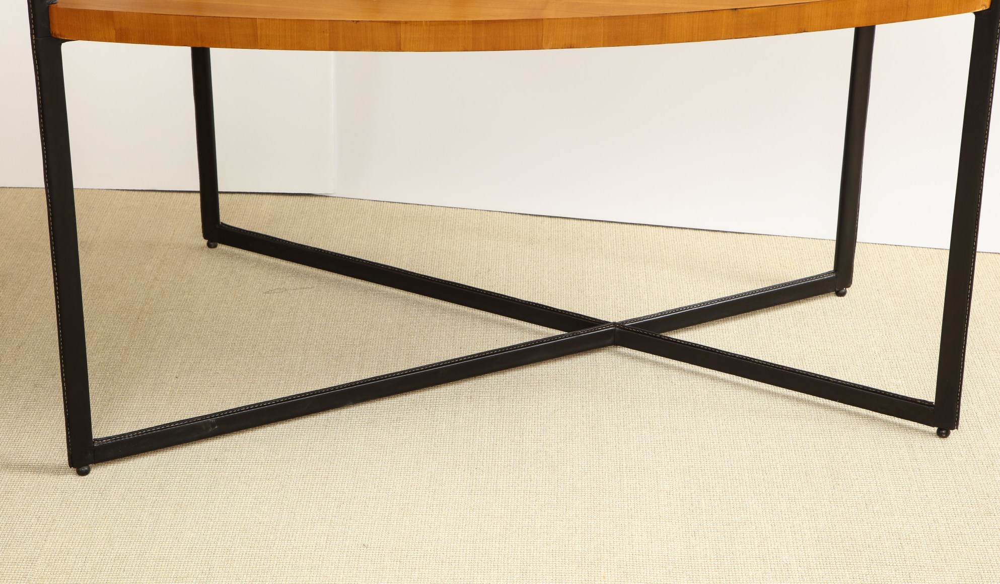 Curved fruitwood center table with glass top and leather wrapped iron legs by Adnet, France c. 1959