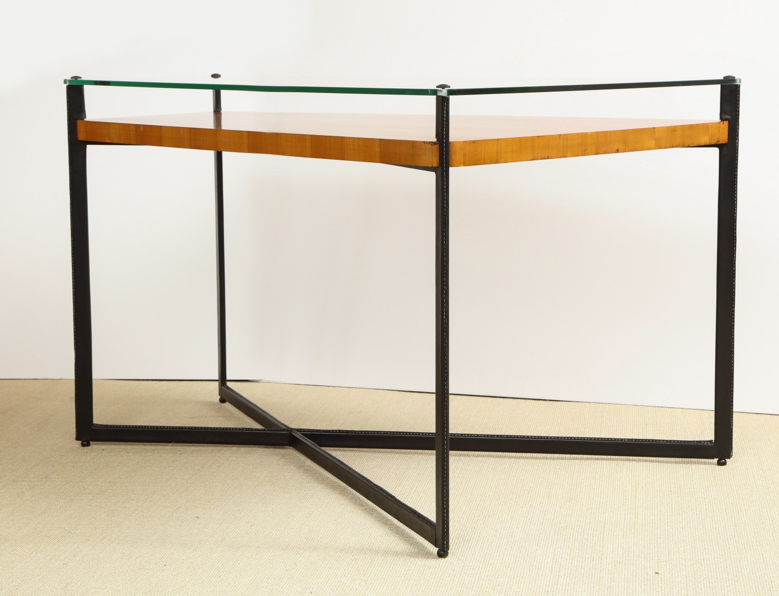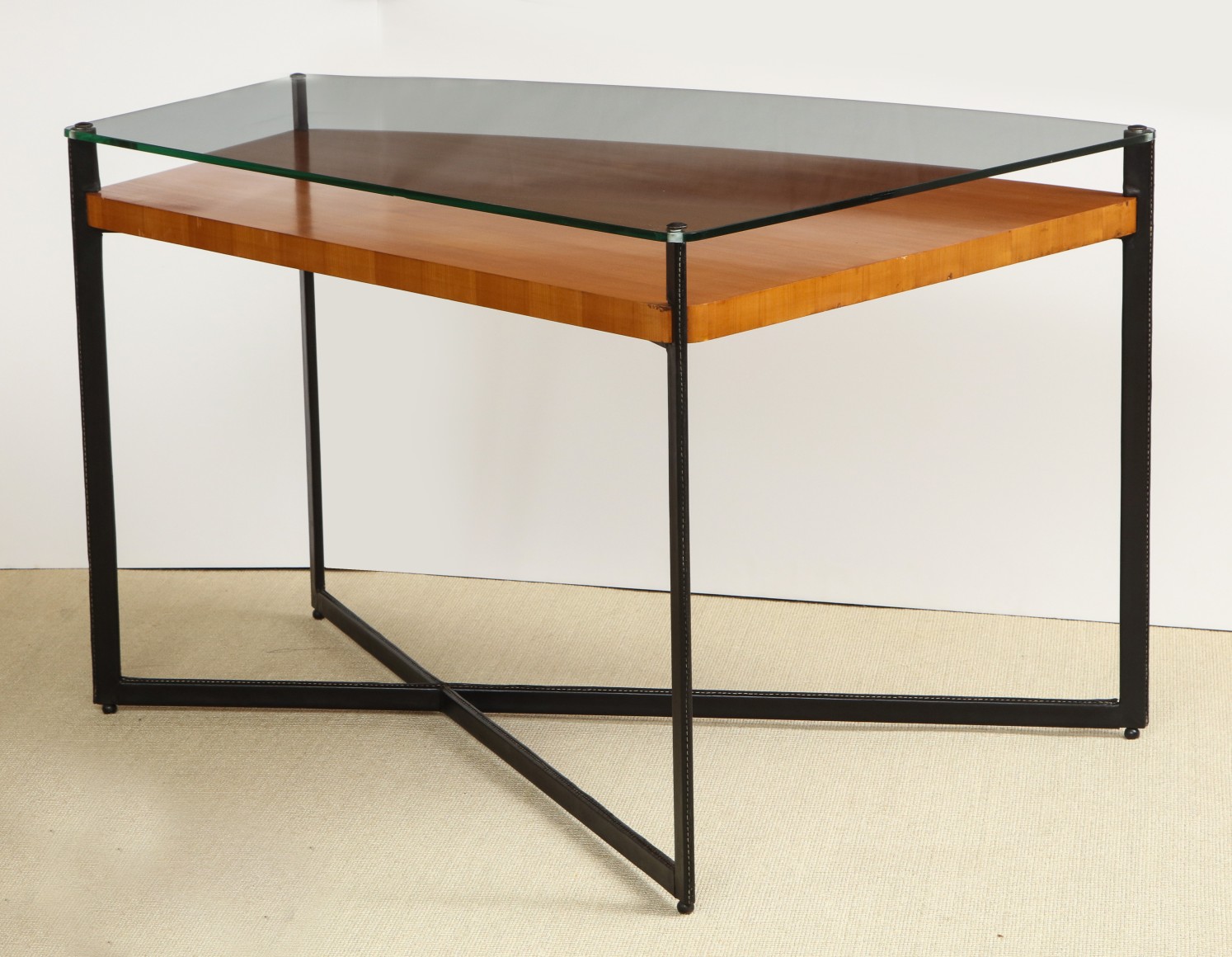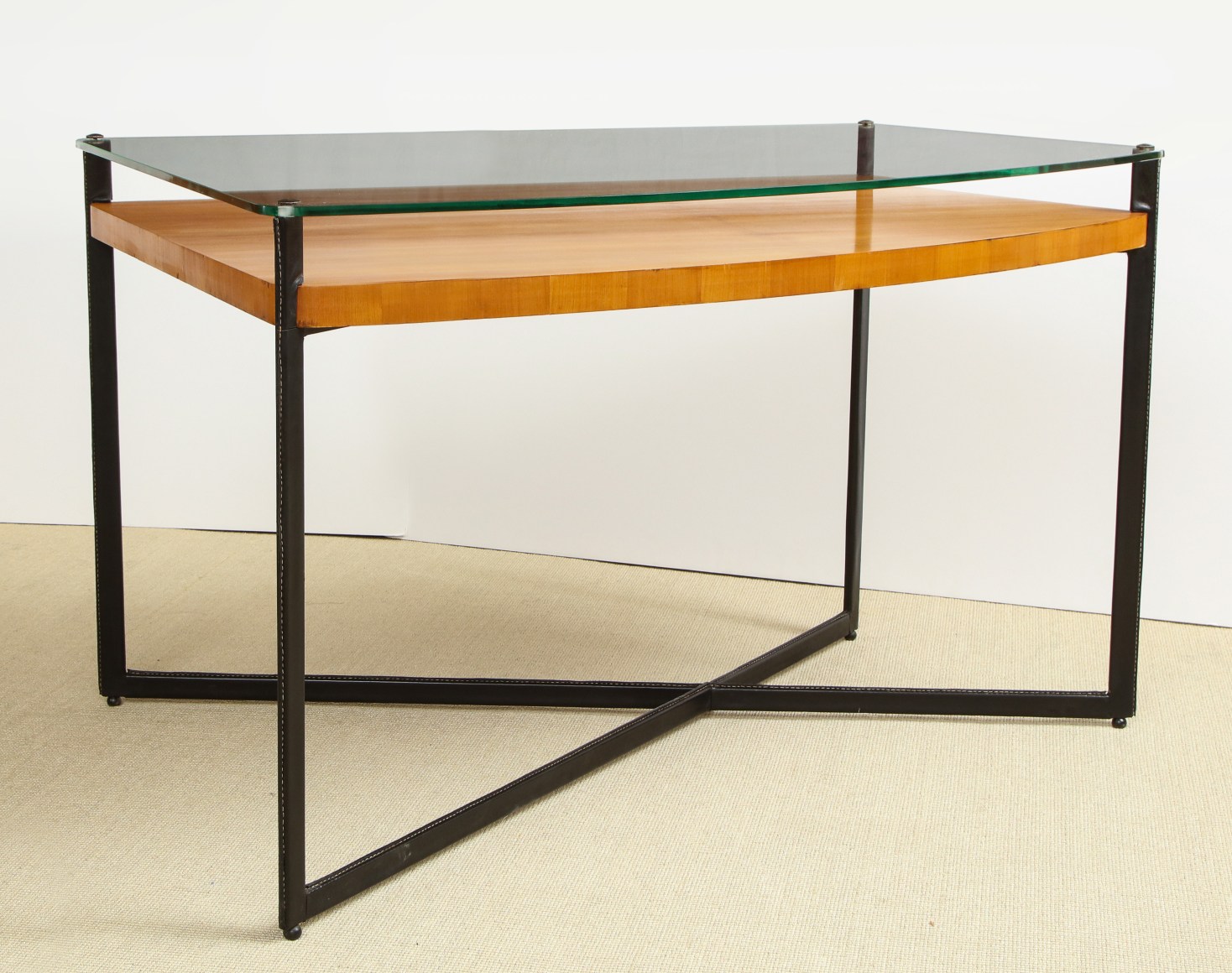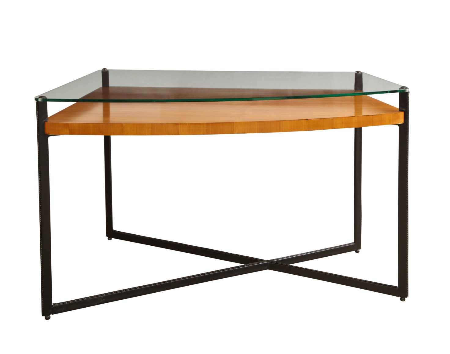 Curved fruitwood center table with glass top and leather wrapped iron legs by Adnet, France c. 1959