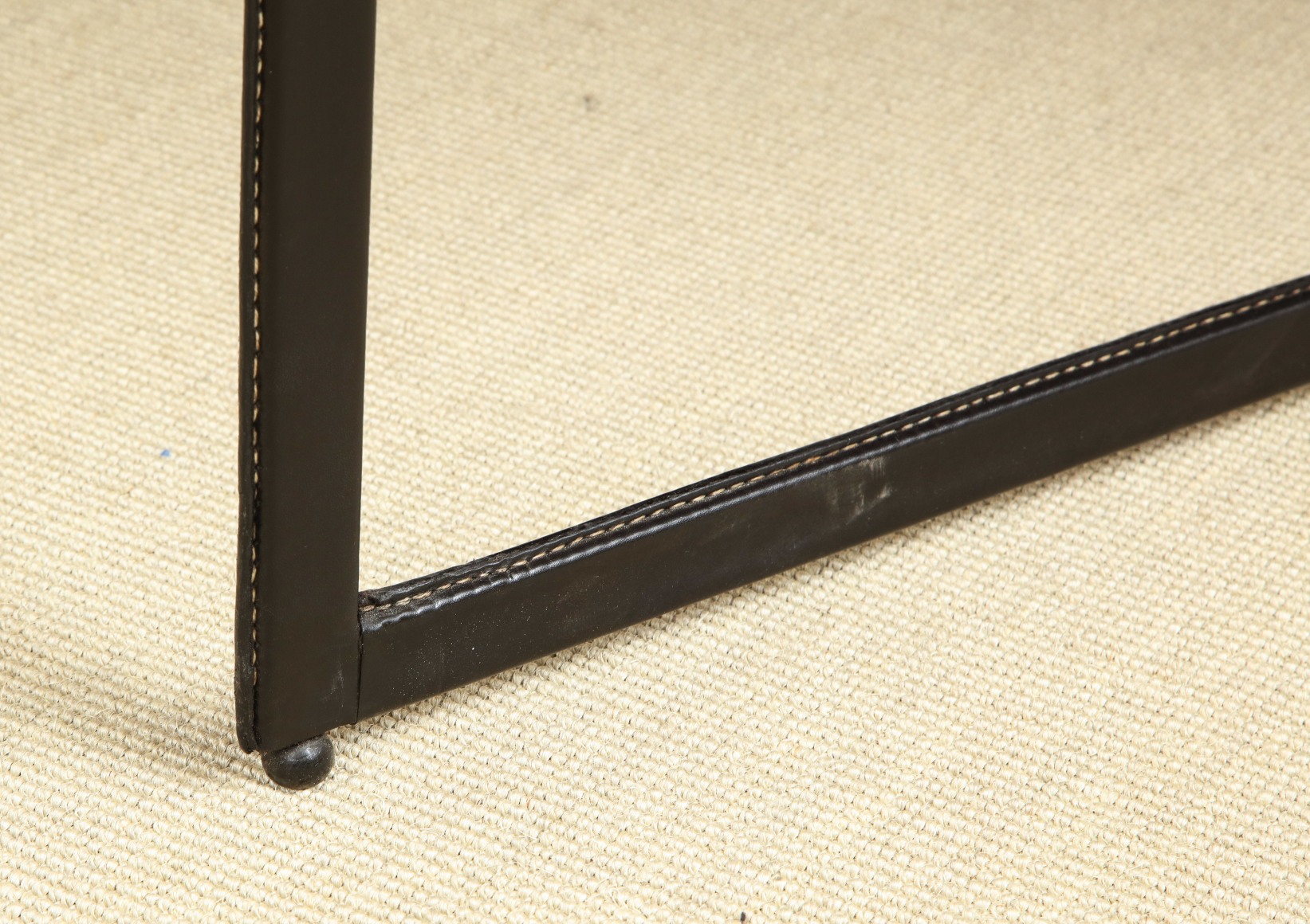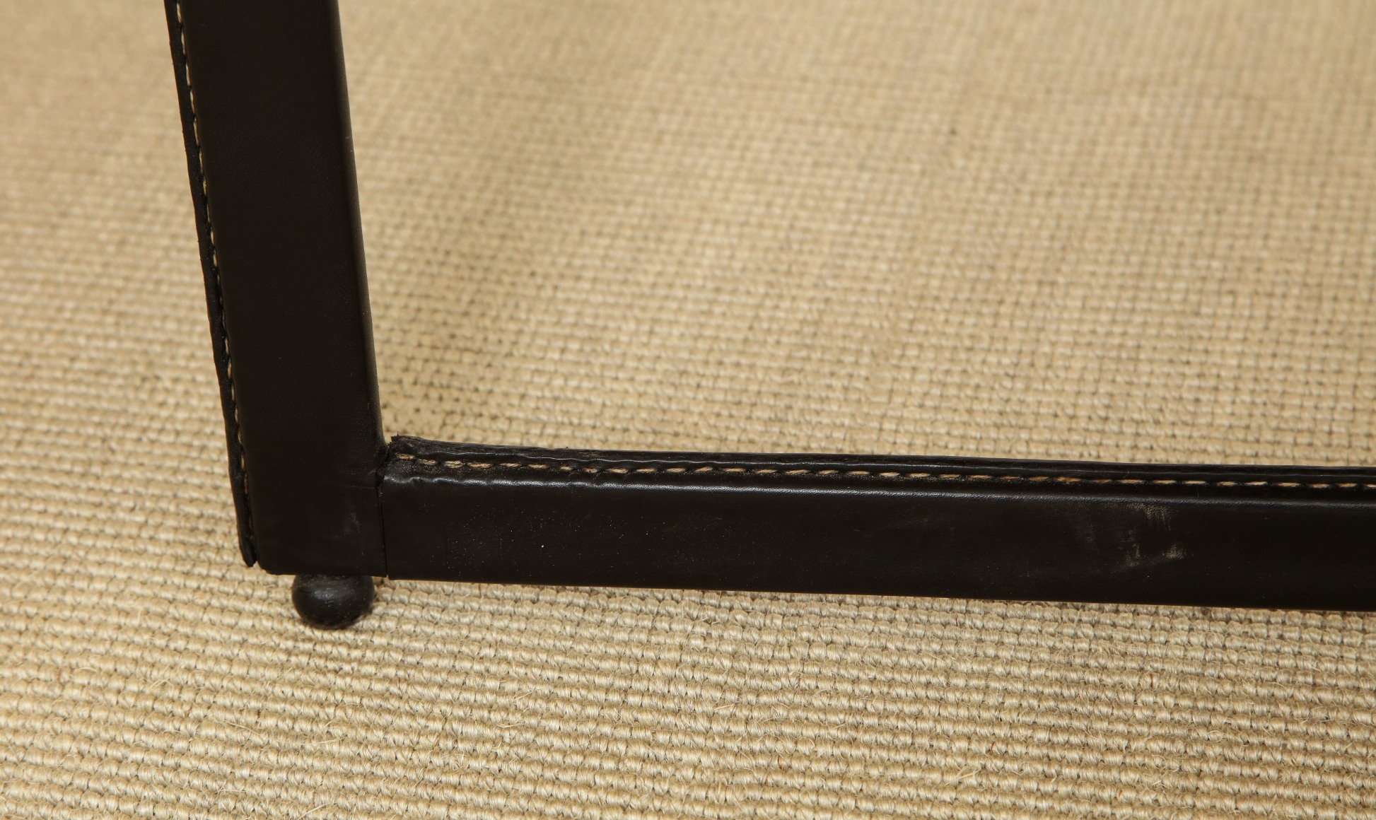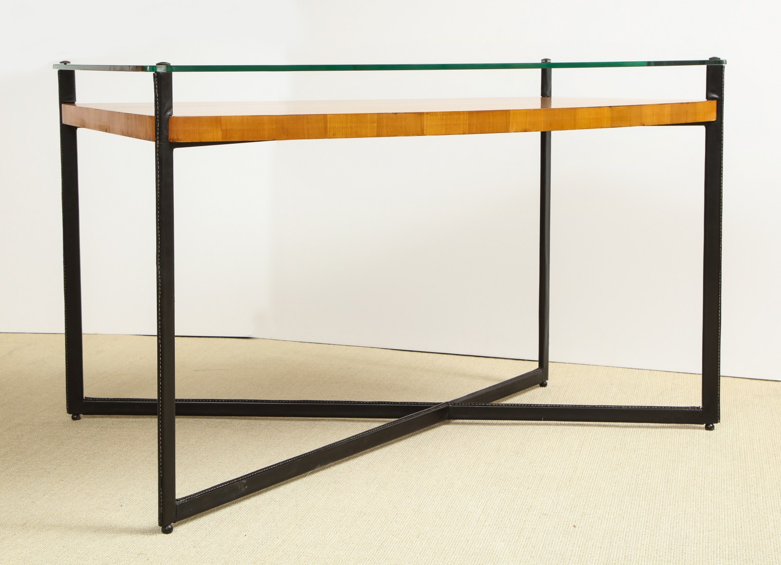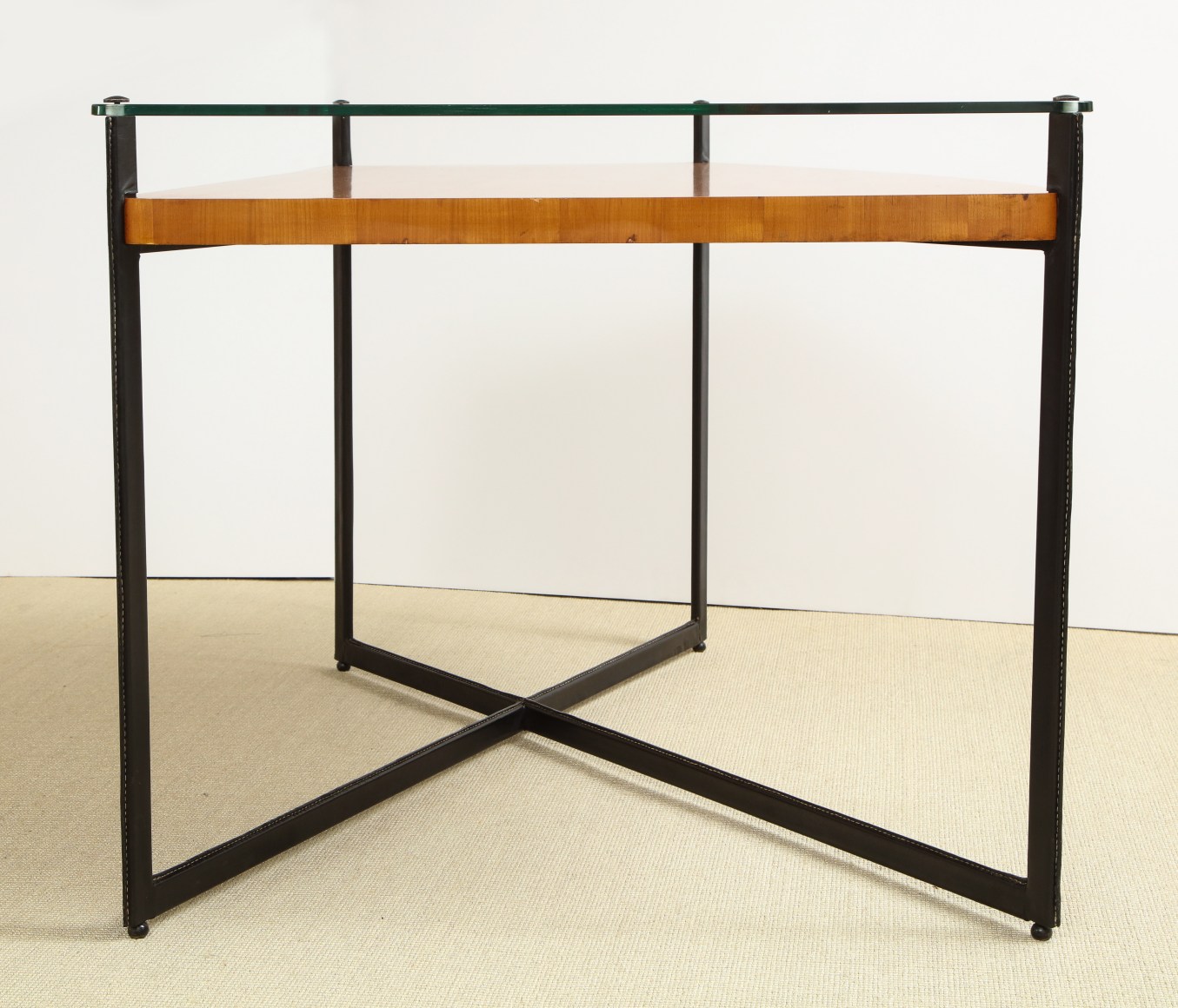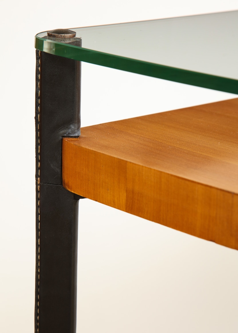 Curved fruitwood center table with glass top and leather wrapped iron legs by Adnet, France c. 1959