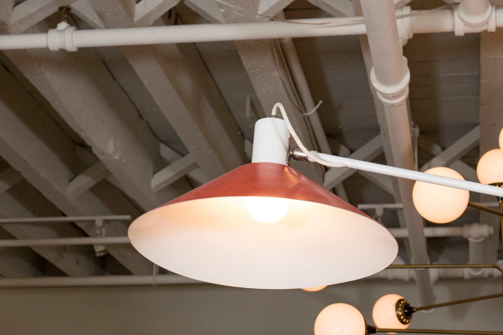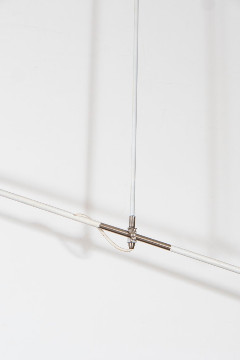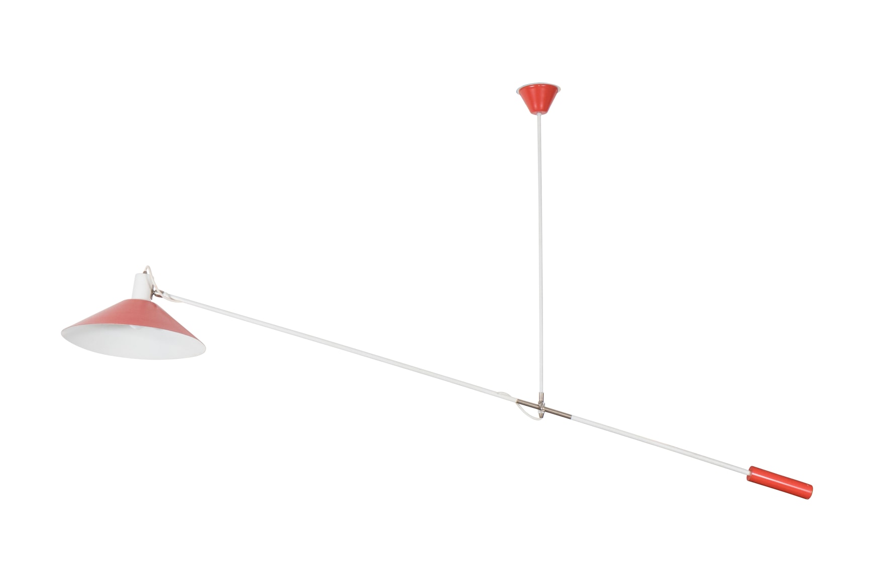 The two-tone enameled fixture with a long arm, a counter balanced weight at one end, an adjustable light fixture on the other, suspended from a rod from the ceiling canopy.