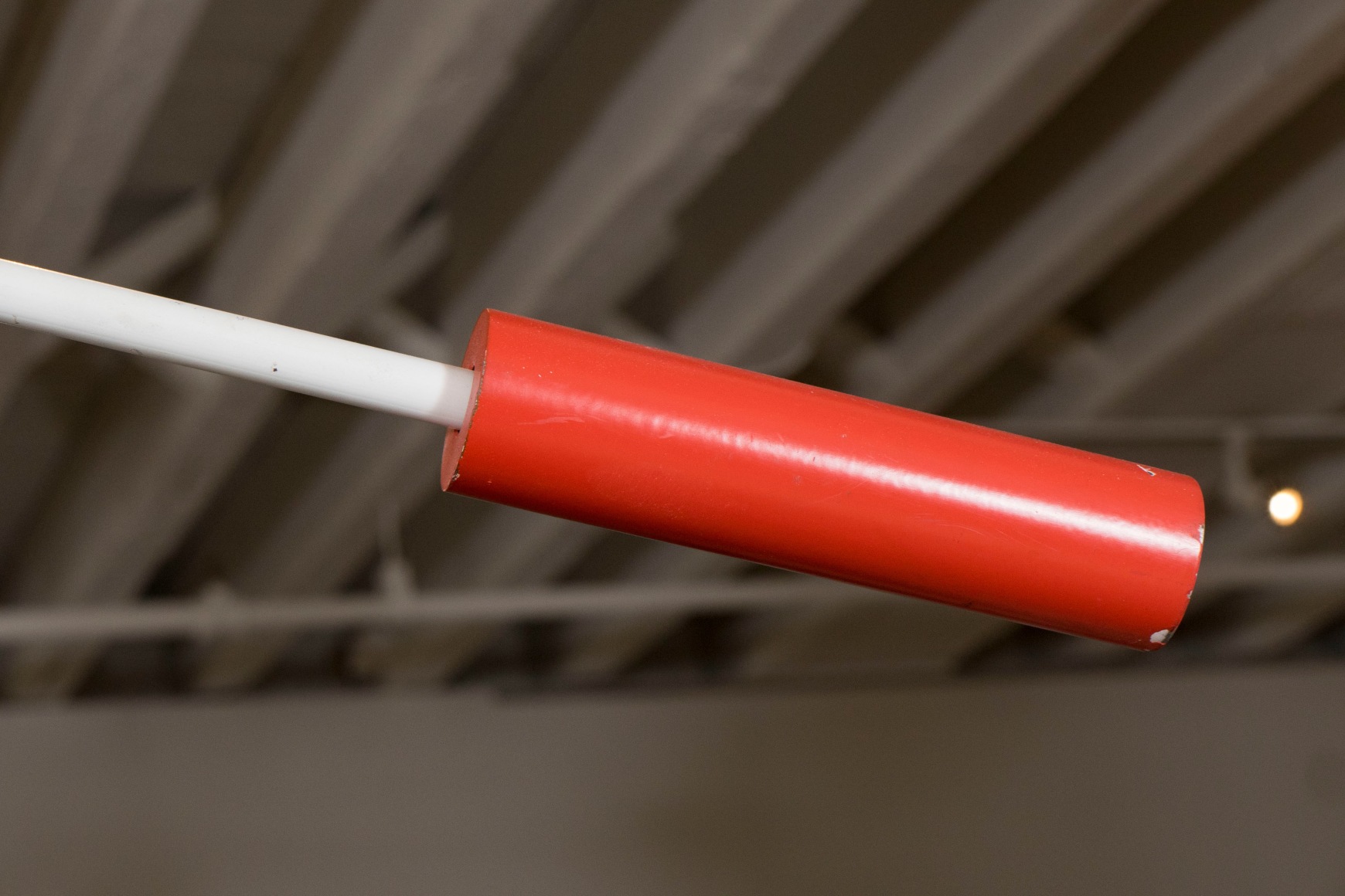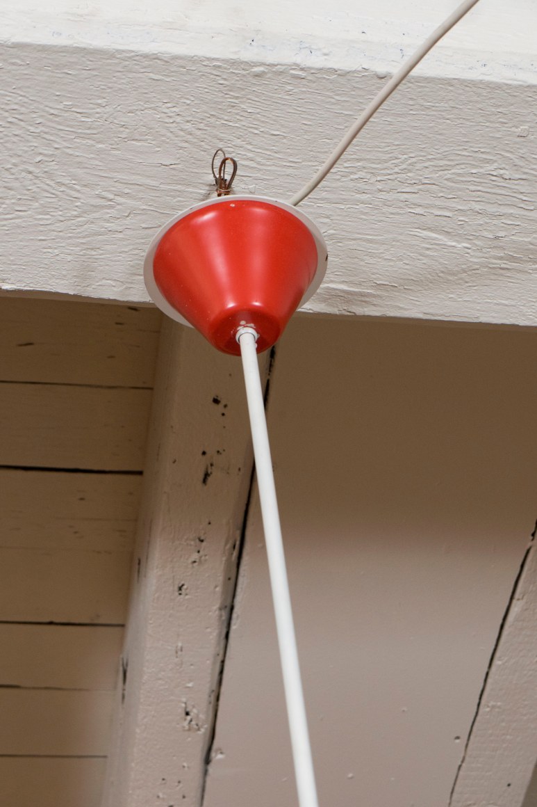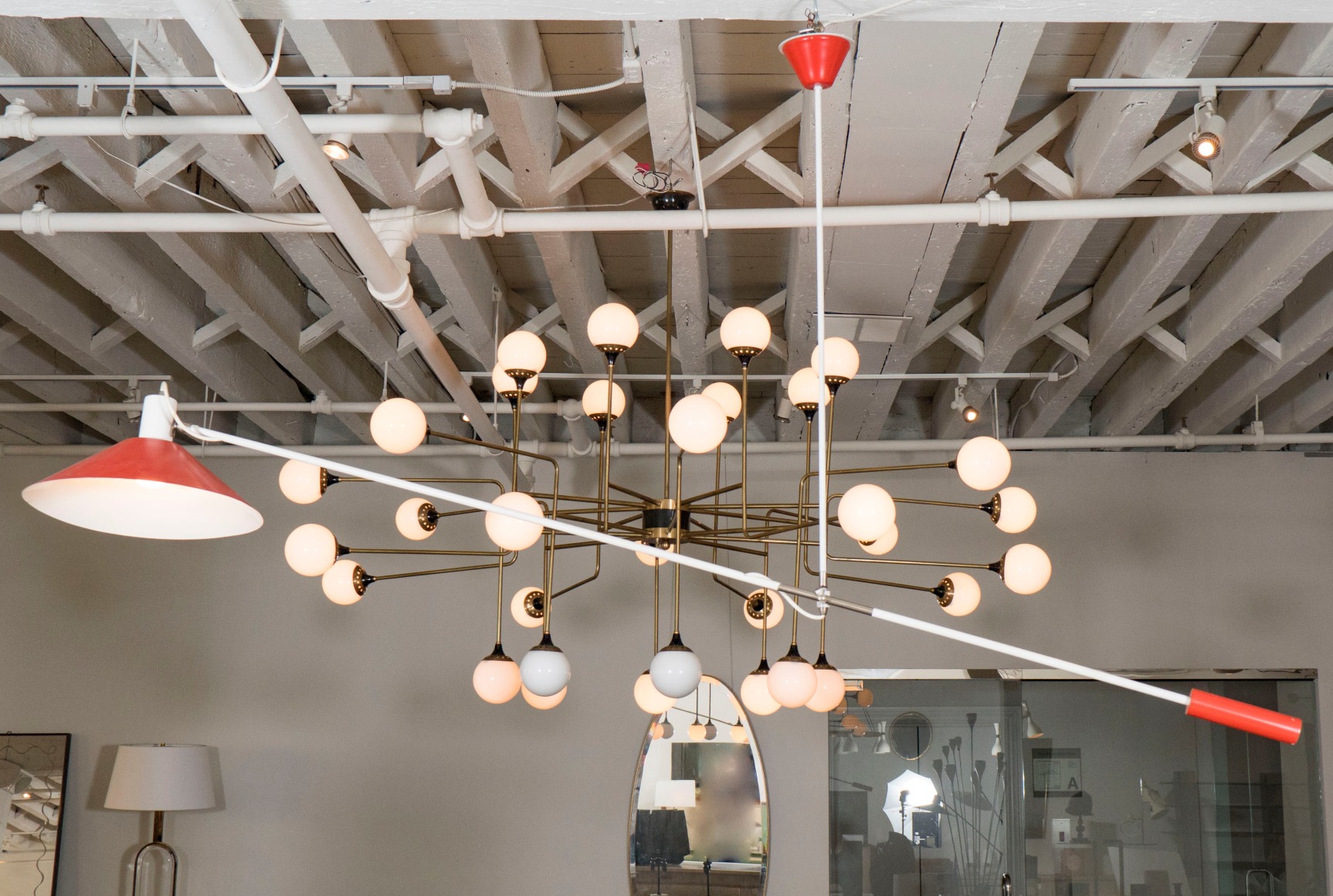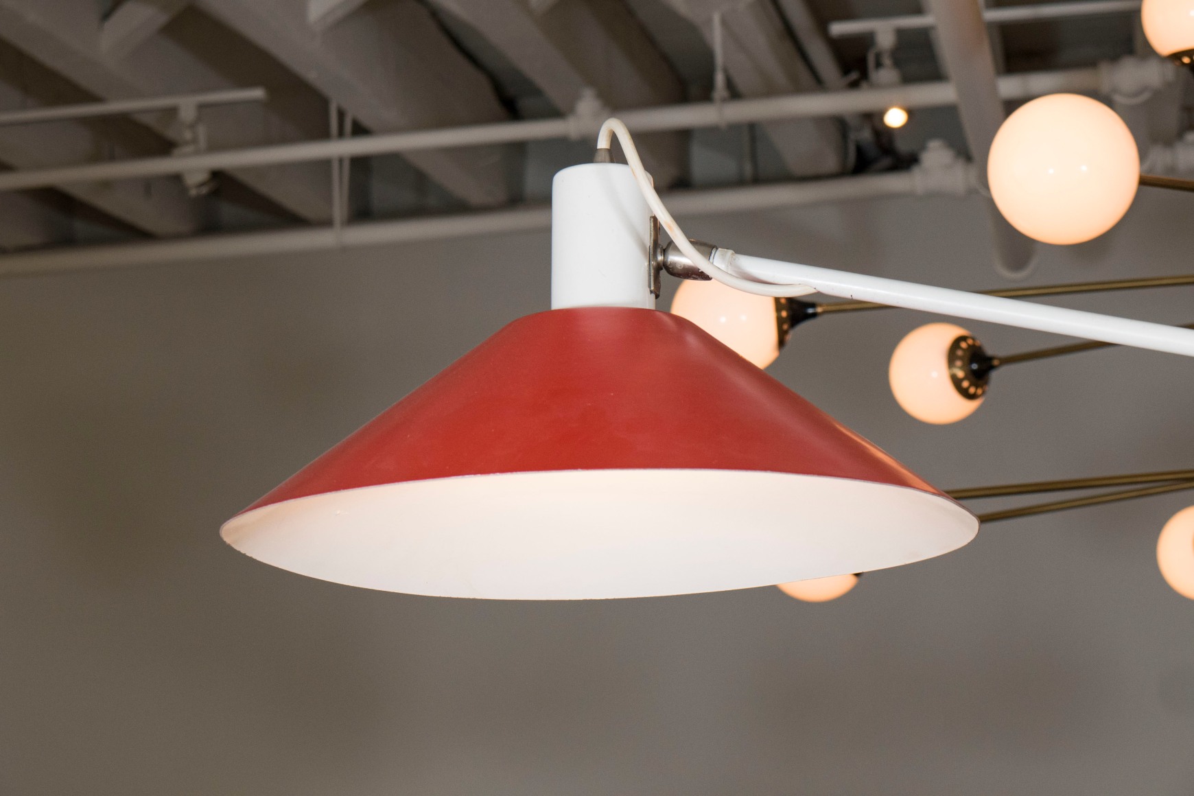 The two-tone enameled fixture with a long arm, a counter balanced weight at one end, an adjustable light fixture on the other, suspended from a rod from the ceiling canopy.