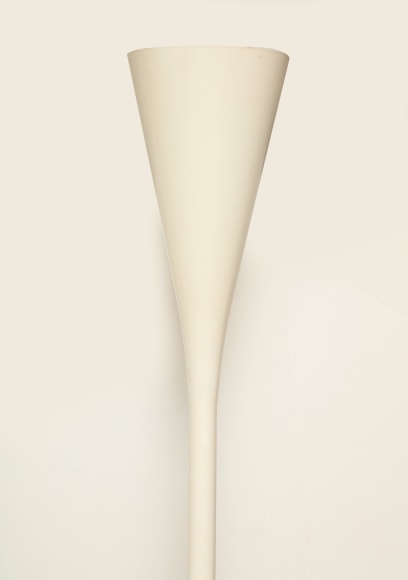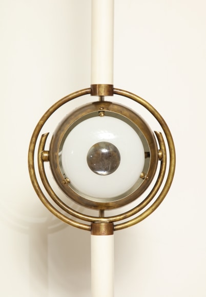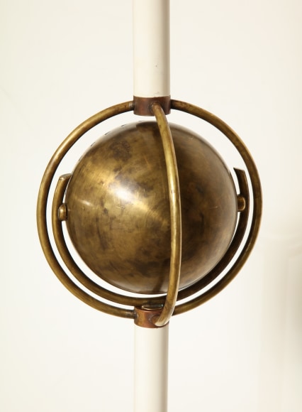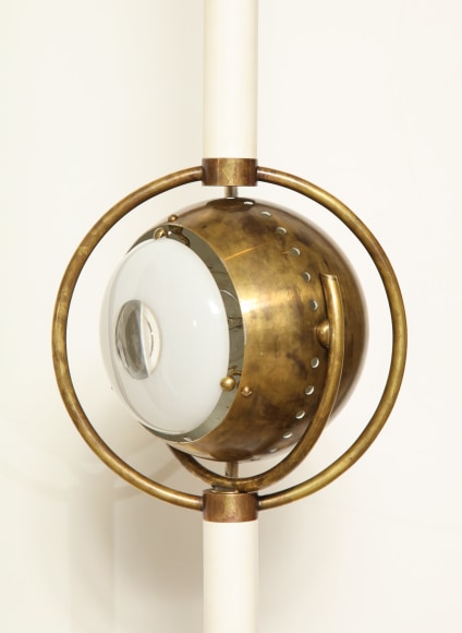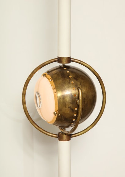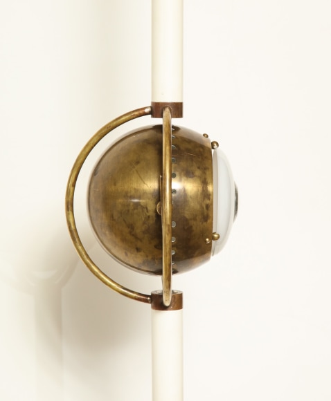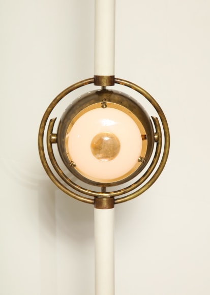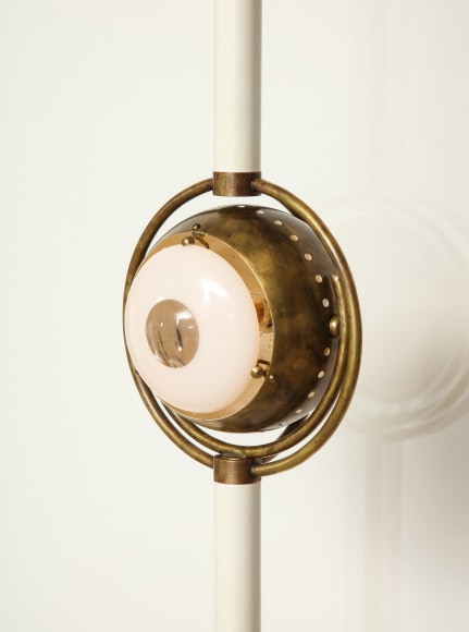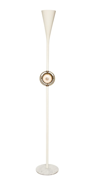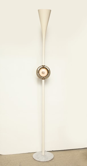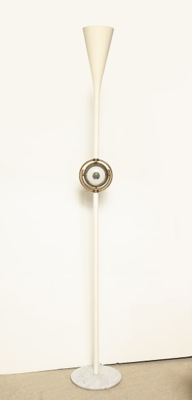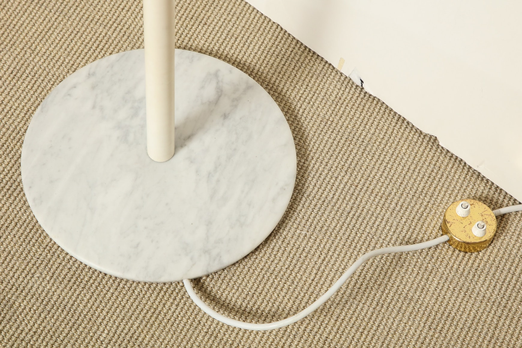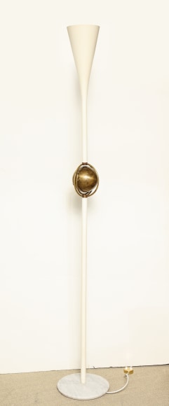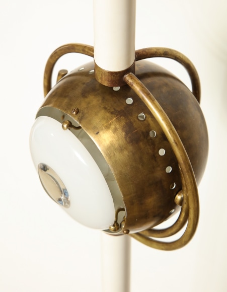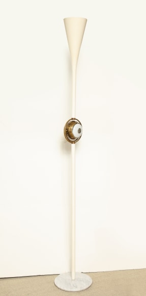 Rare tall standing lamp "Polifemo" in white enamel with brass "Eye" and marble base by Angelo Lelii for Arredoluce