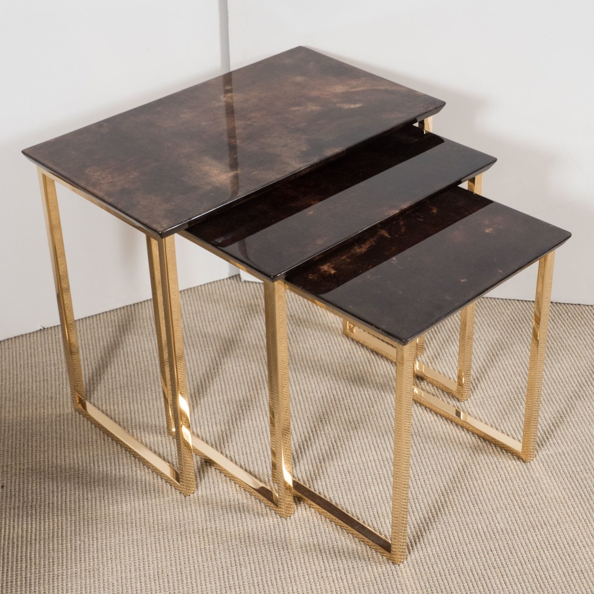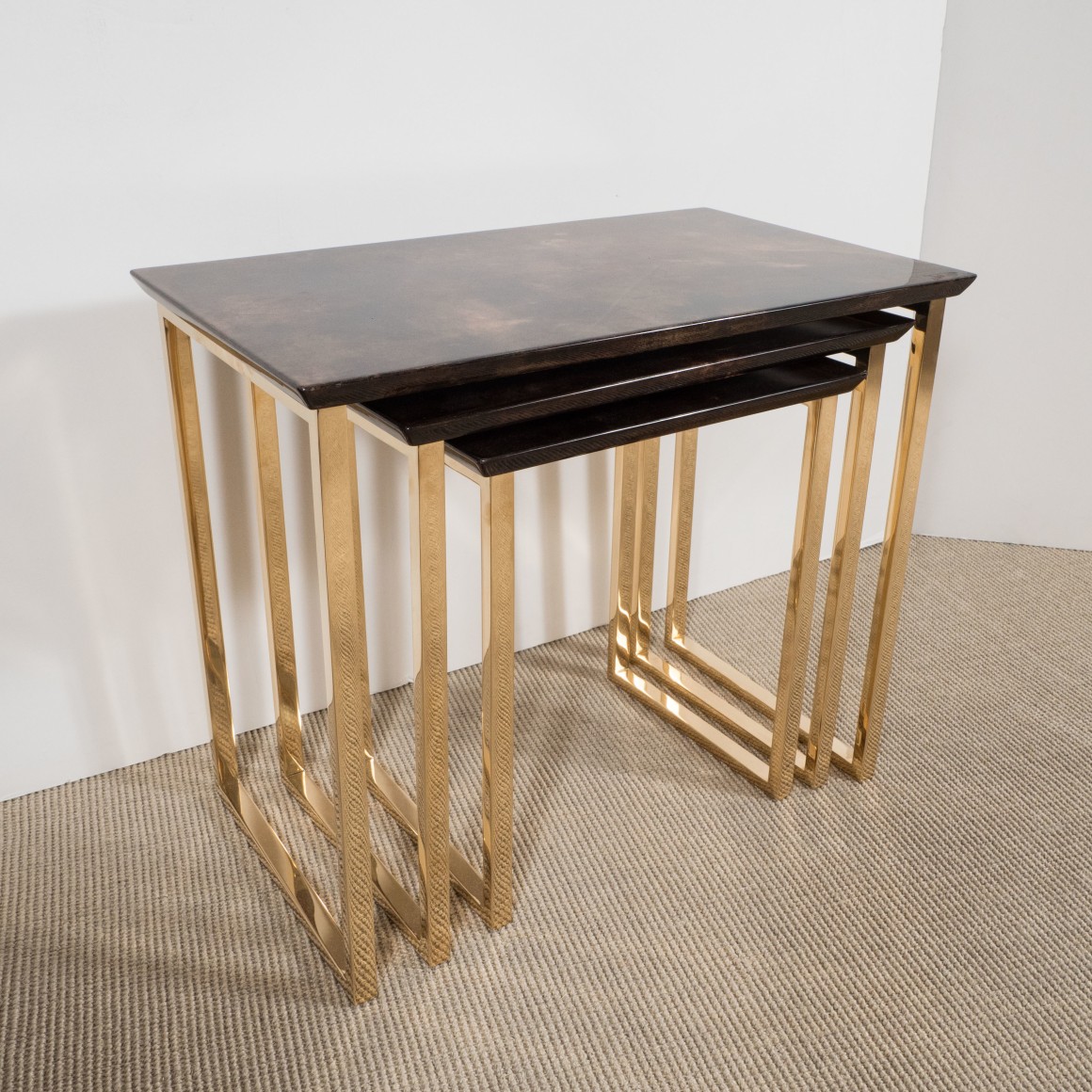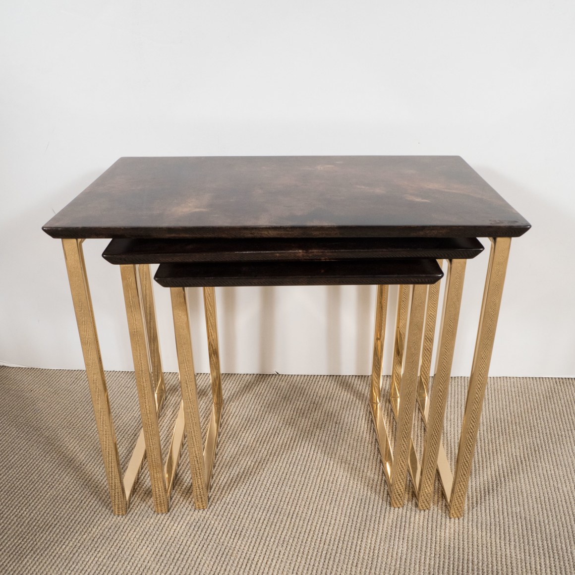 Set of Three Aldo Tura Parchment Rectangular Nesting Tables with Polished Bronze