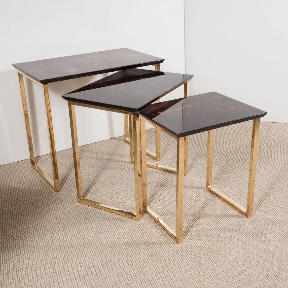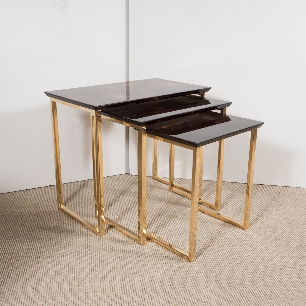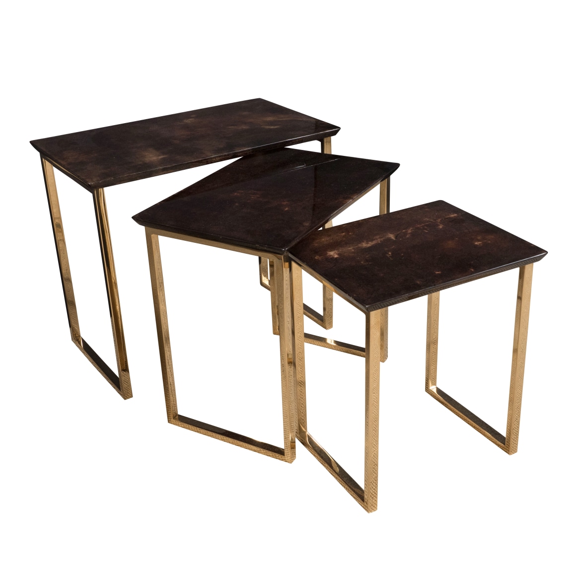 Set of Three Aldo Tura Parchment Rectangular Nesting Tables with Polished Bronze