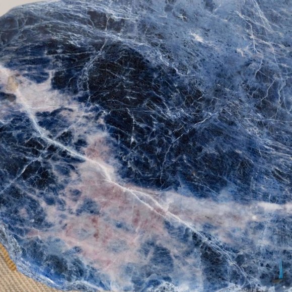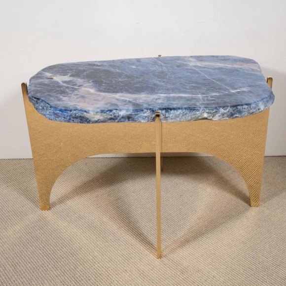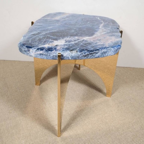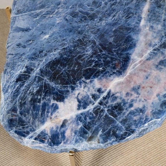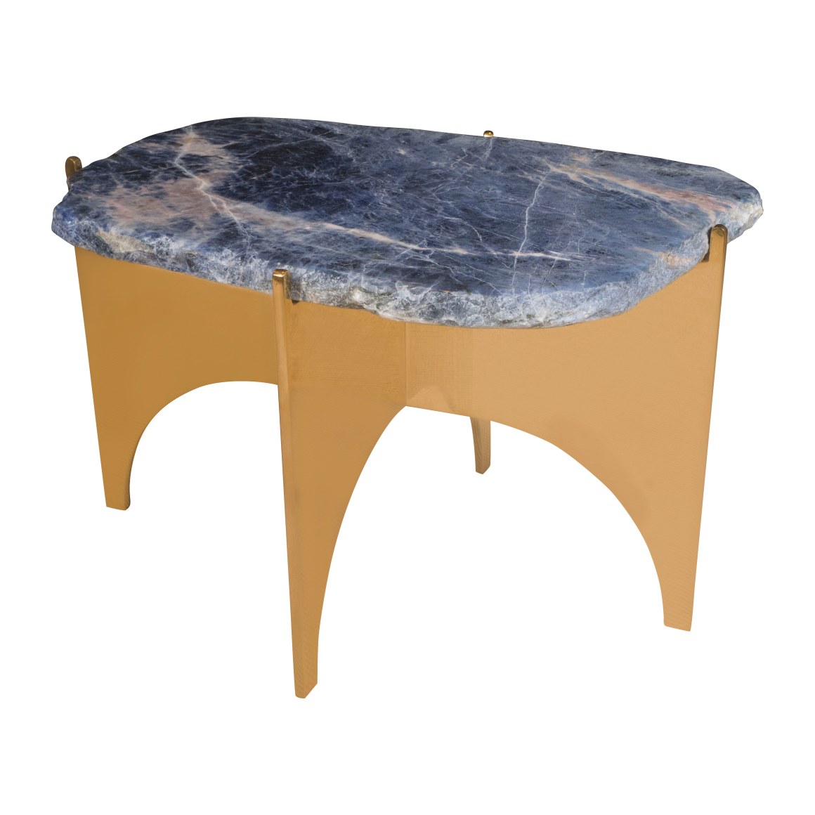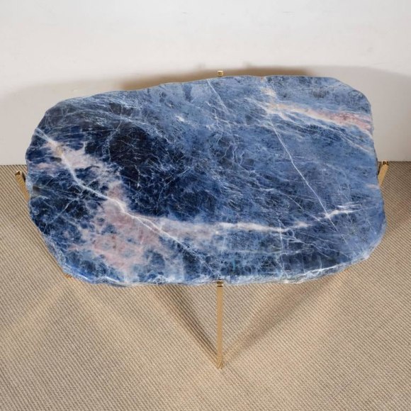 Sodalite gemstone table with polished brass base, USA Contemporary