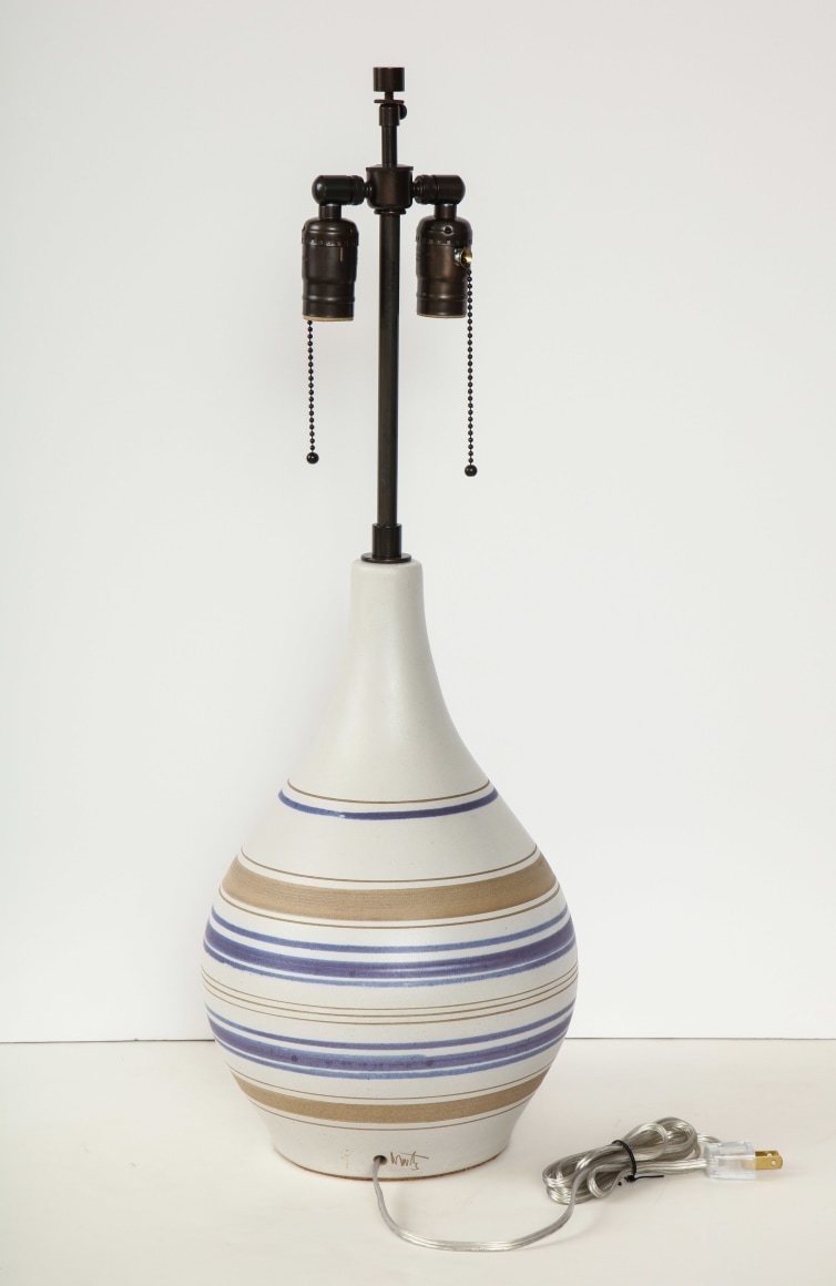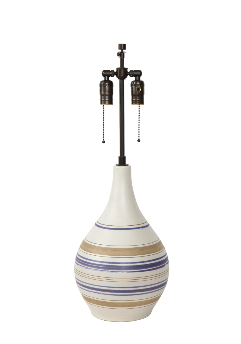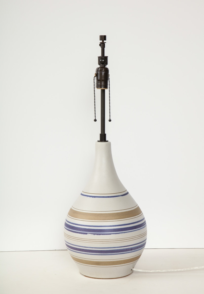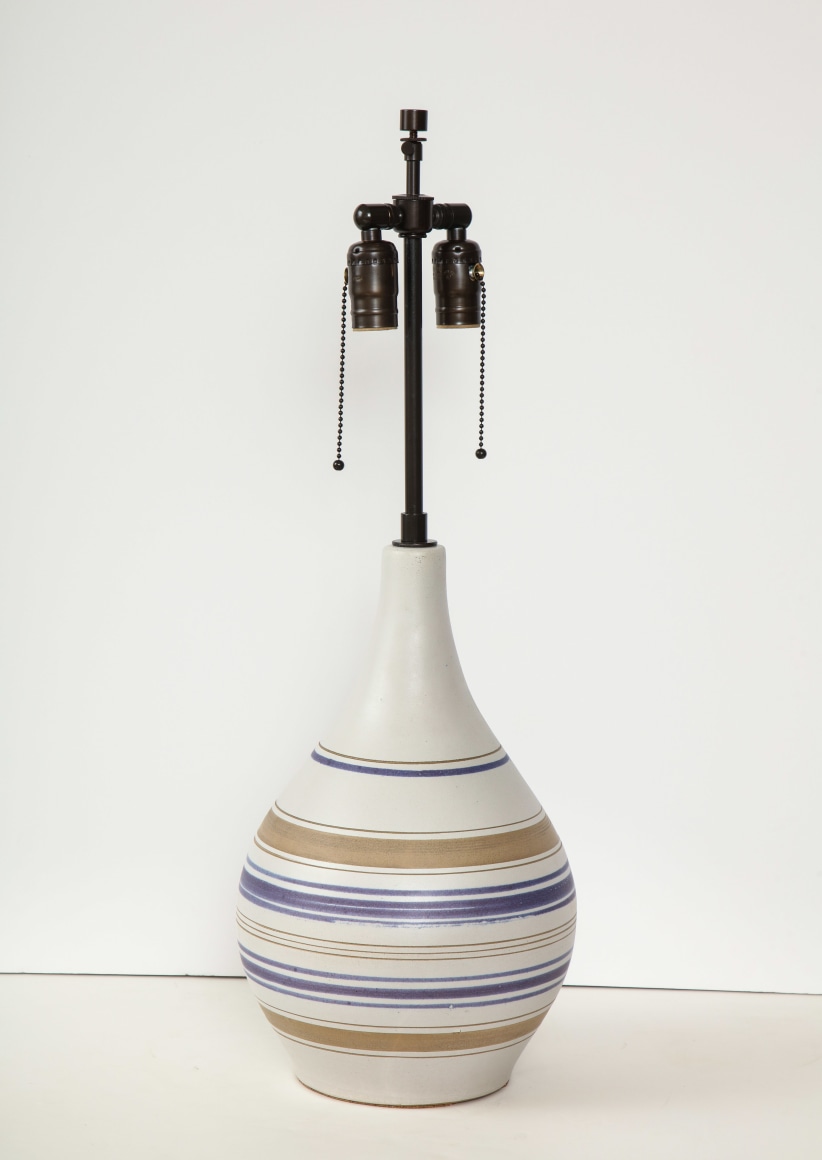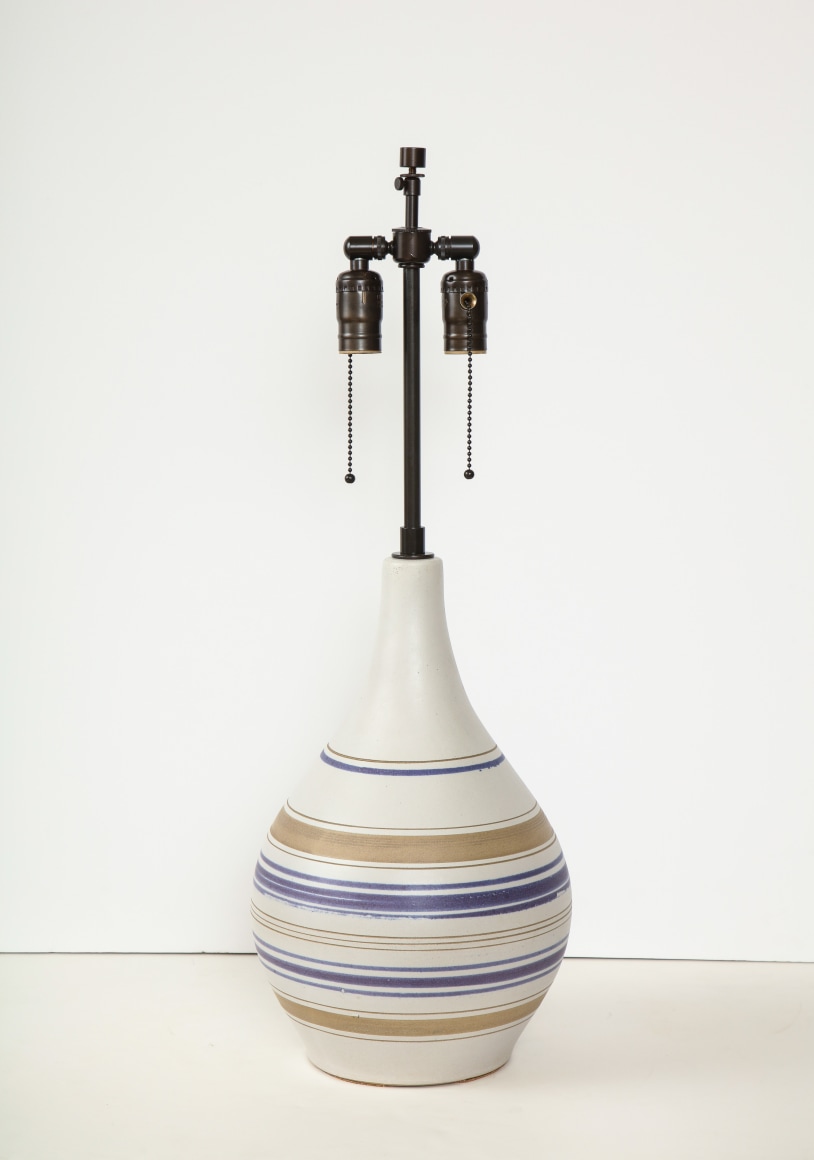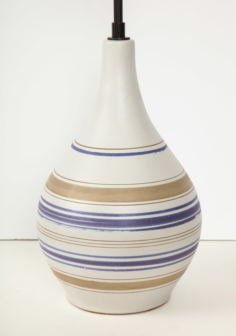 Tall table lamp in blue and taupe stripes by Martz, USA. c. 1950