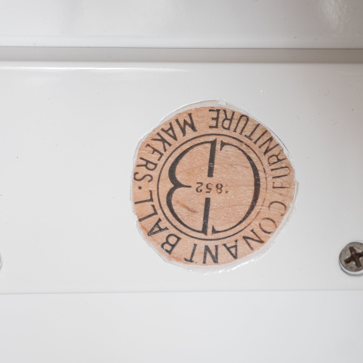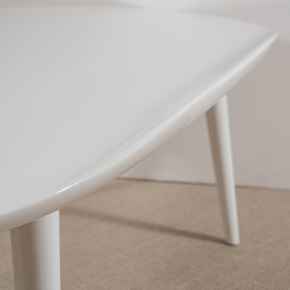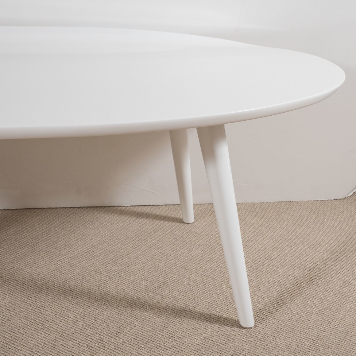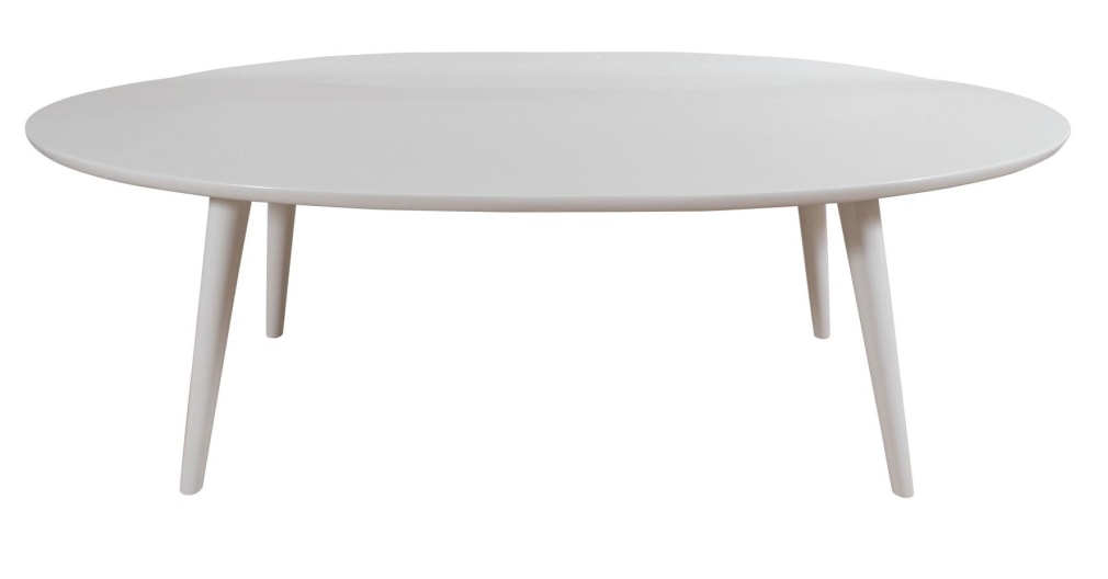 White lacquer Conant Ball Makers Coffee Table with curved lip, splayed tapering slender legs, USA c. 1940