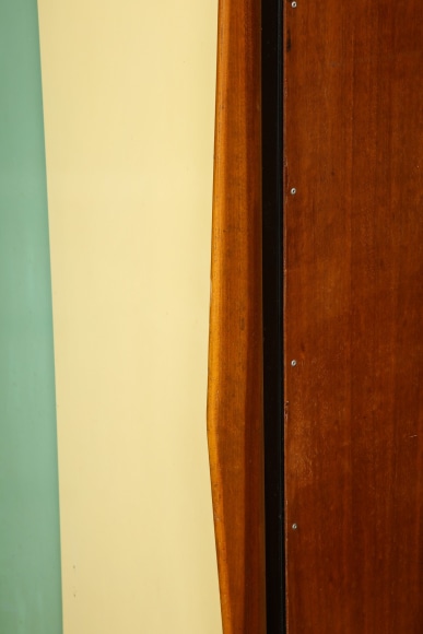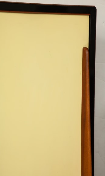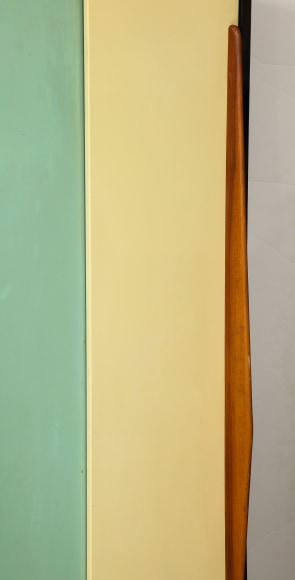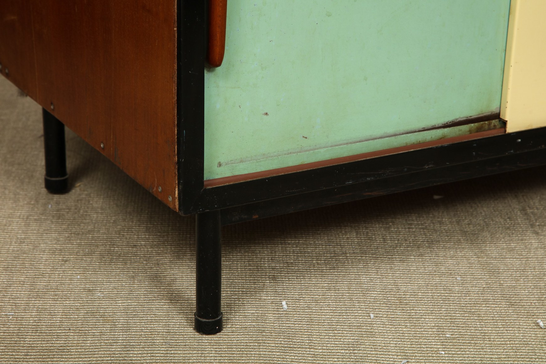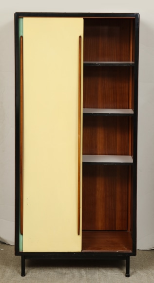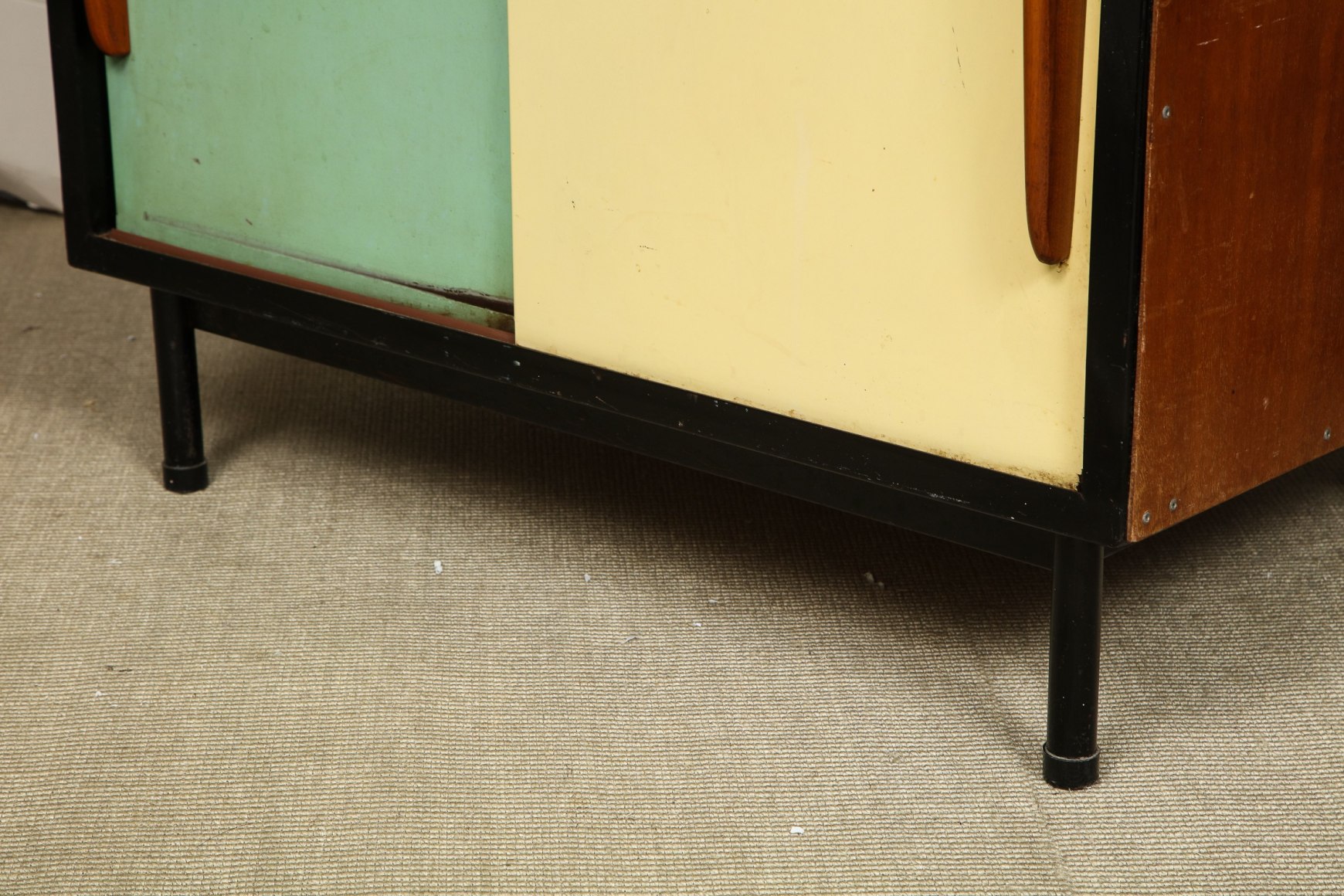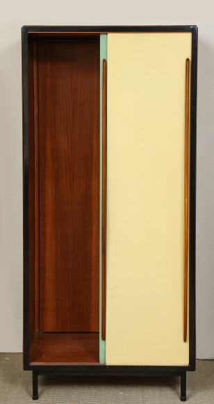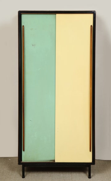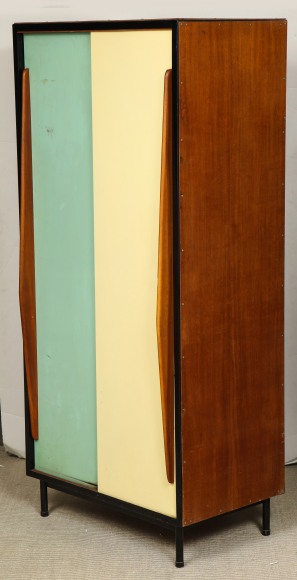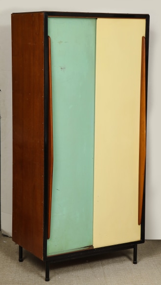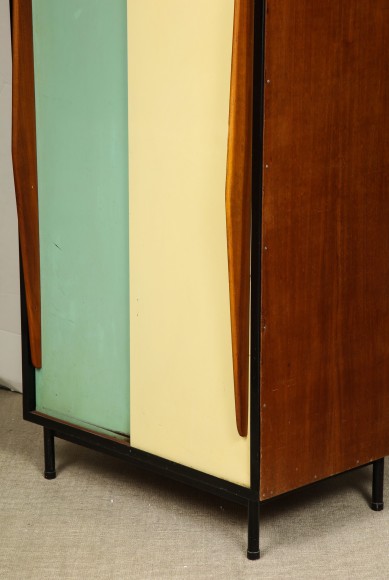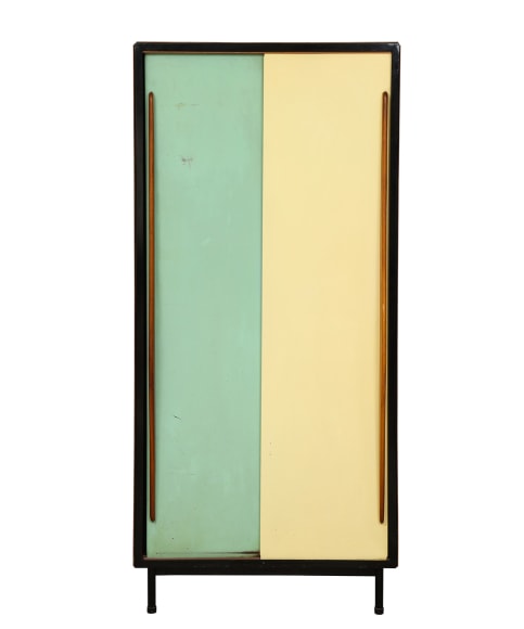 Wardrobe with light blue-green and cream enameled metal doors by architect Willy Van der Meeren